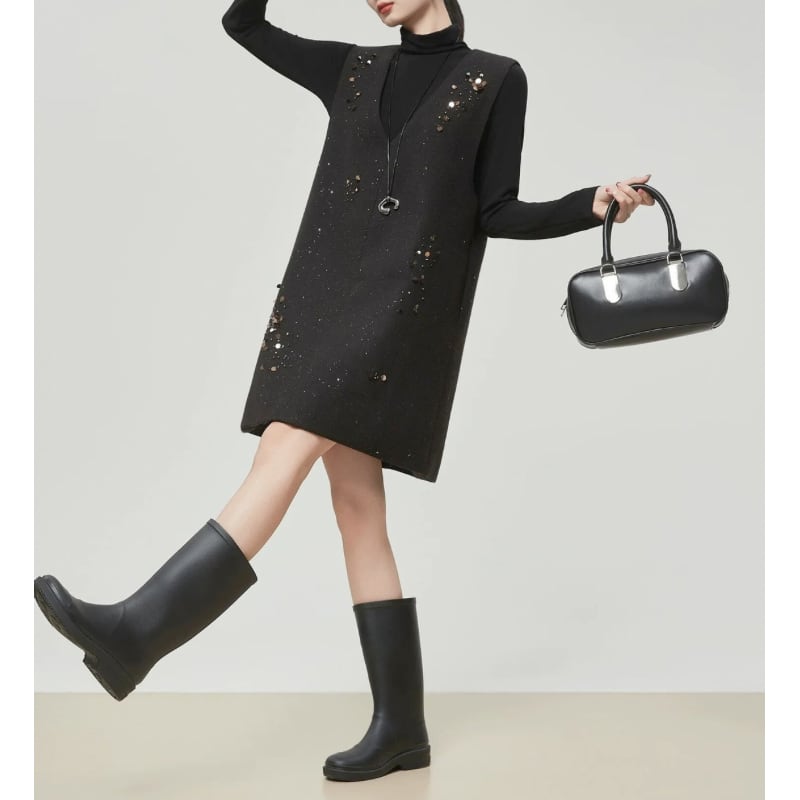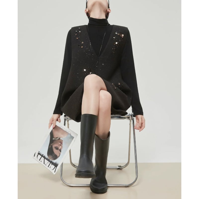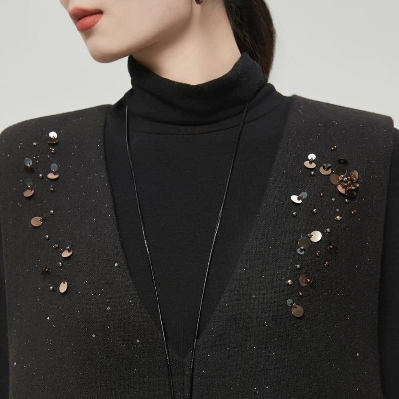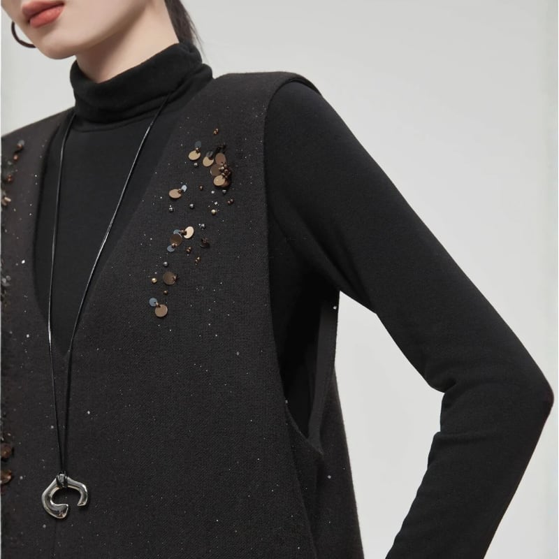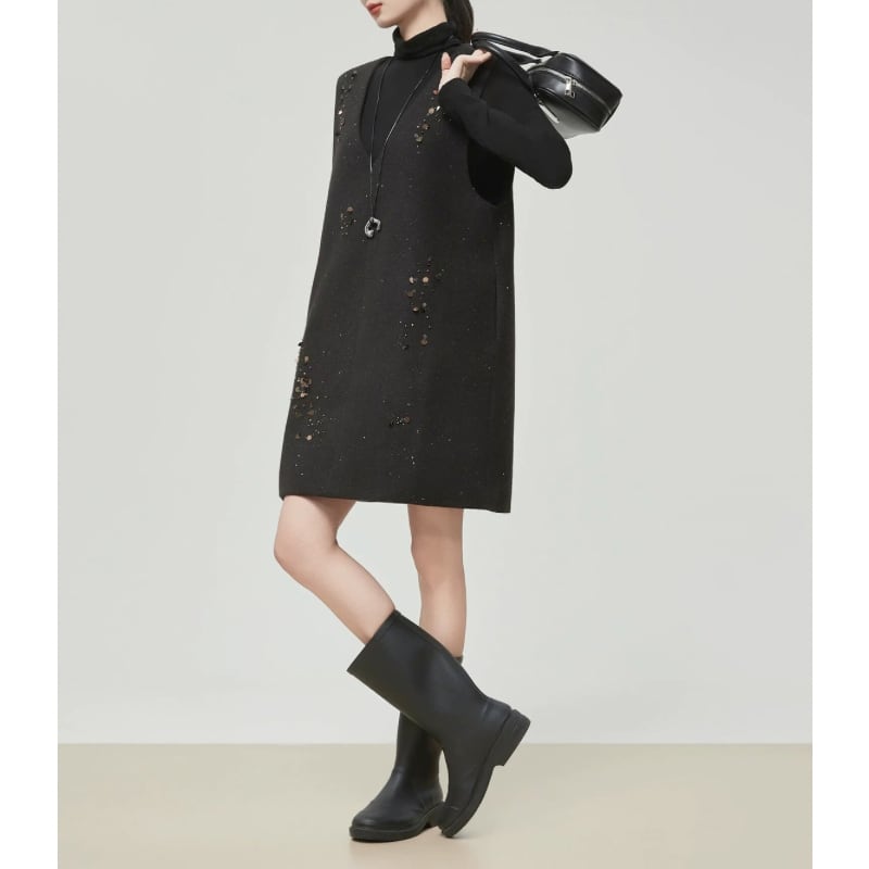散りばめたようなスパンコール装飾が、控えめなきらめきを添えるノースリーブワンピース。