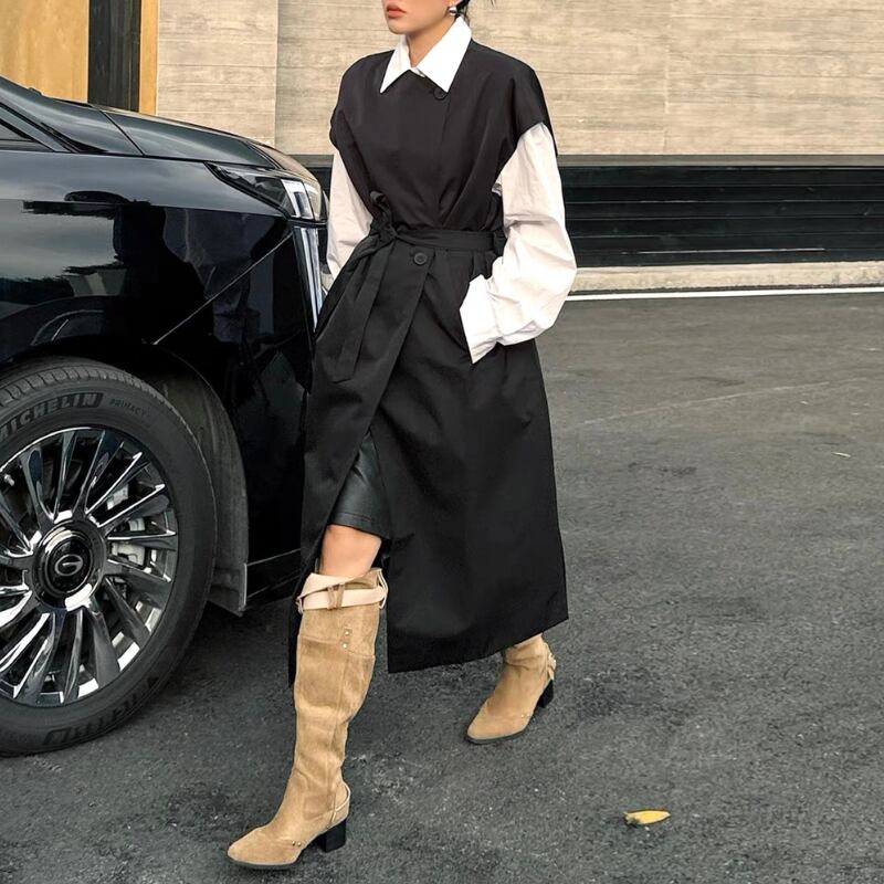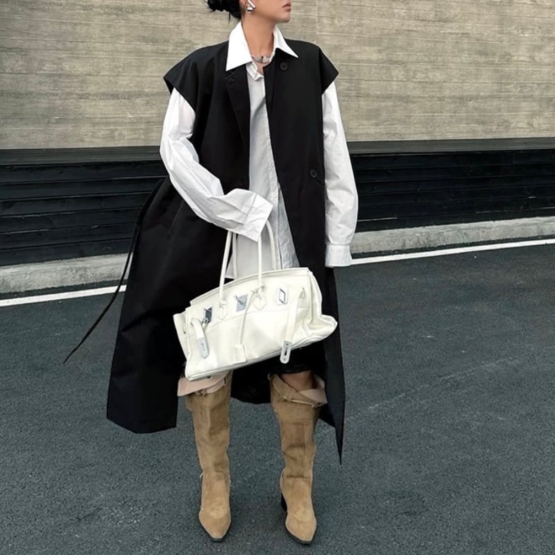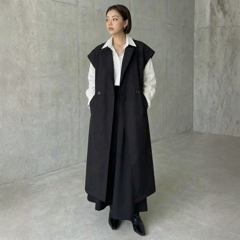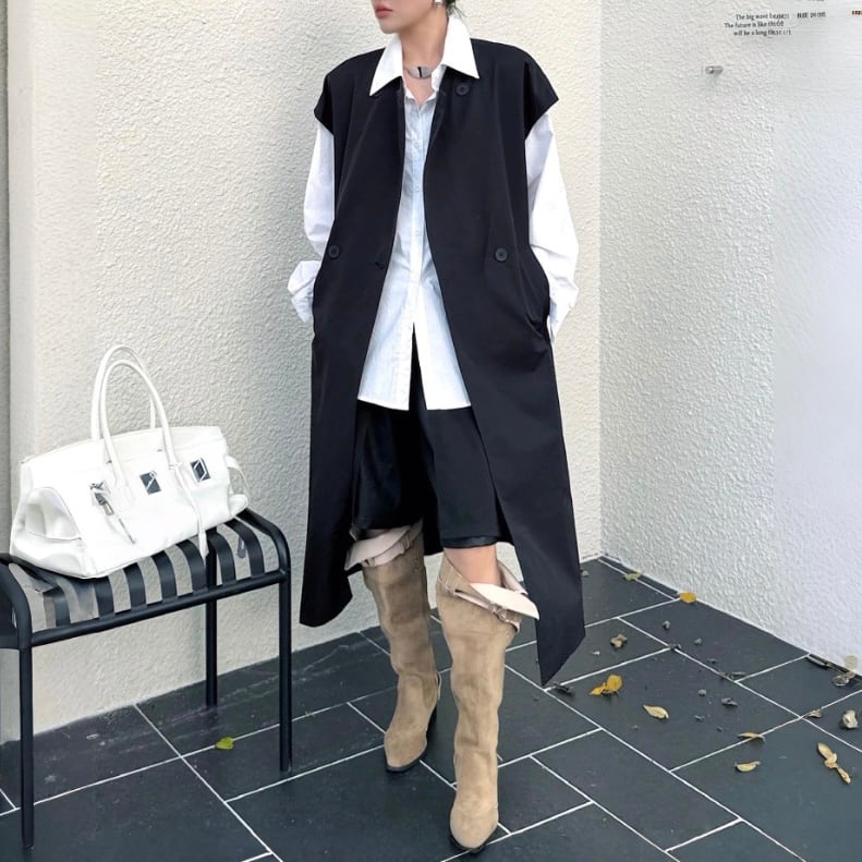 レイヤードでスタイリングを引き締めるロング丈ベスト。