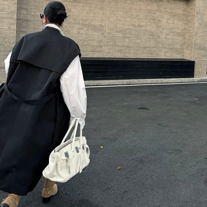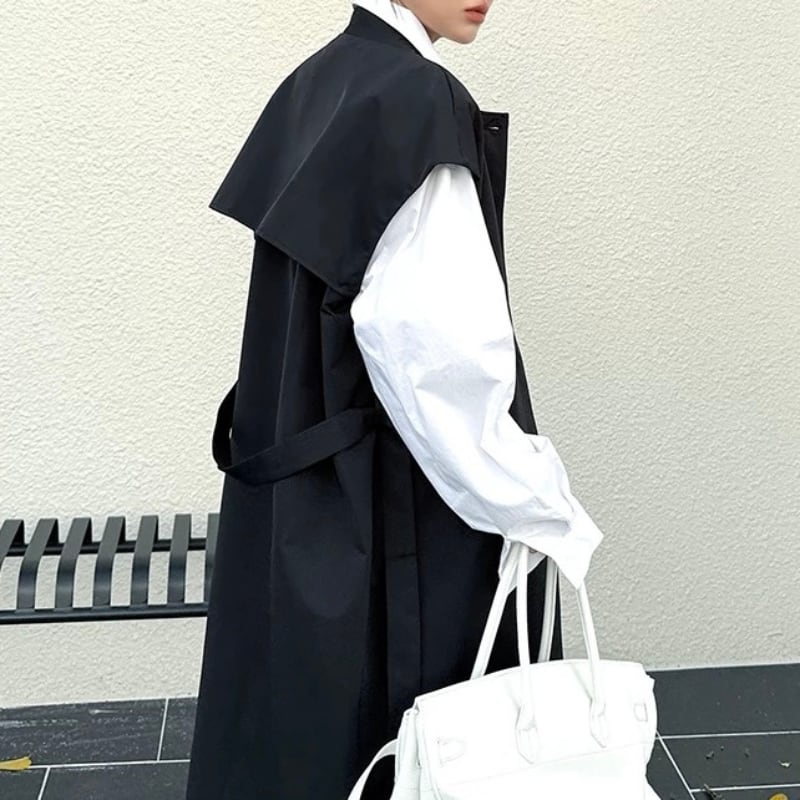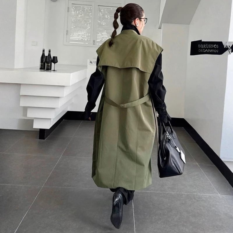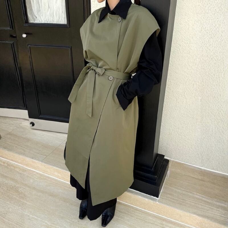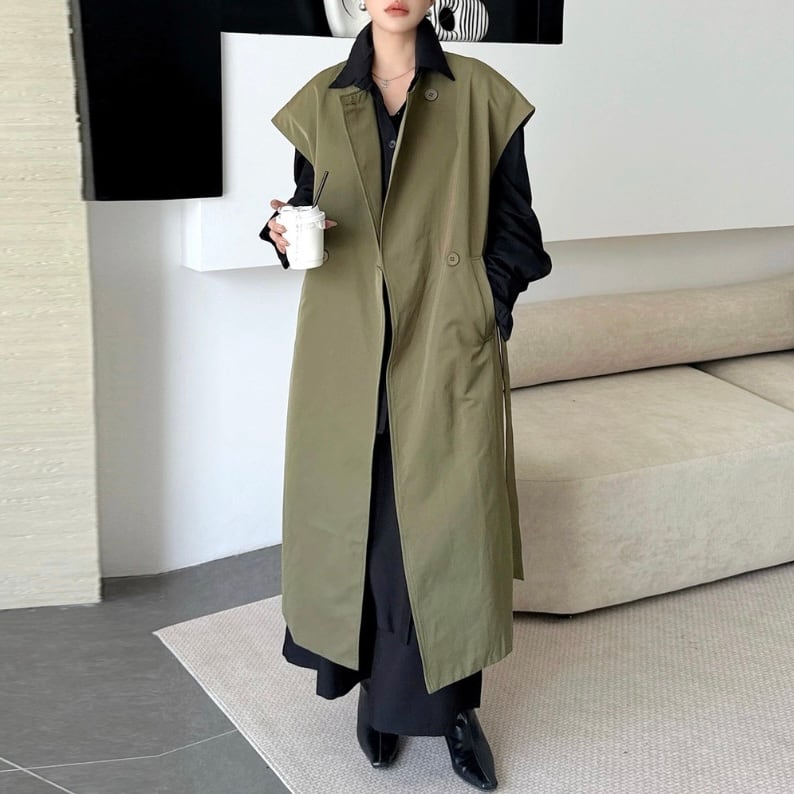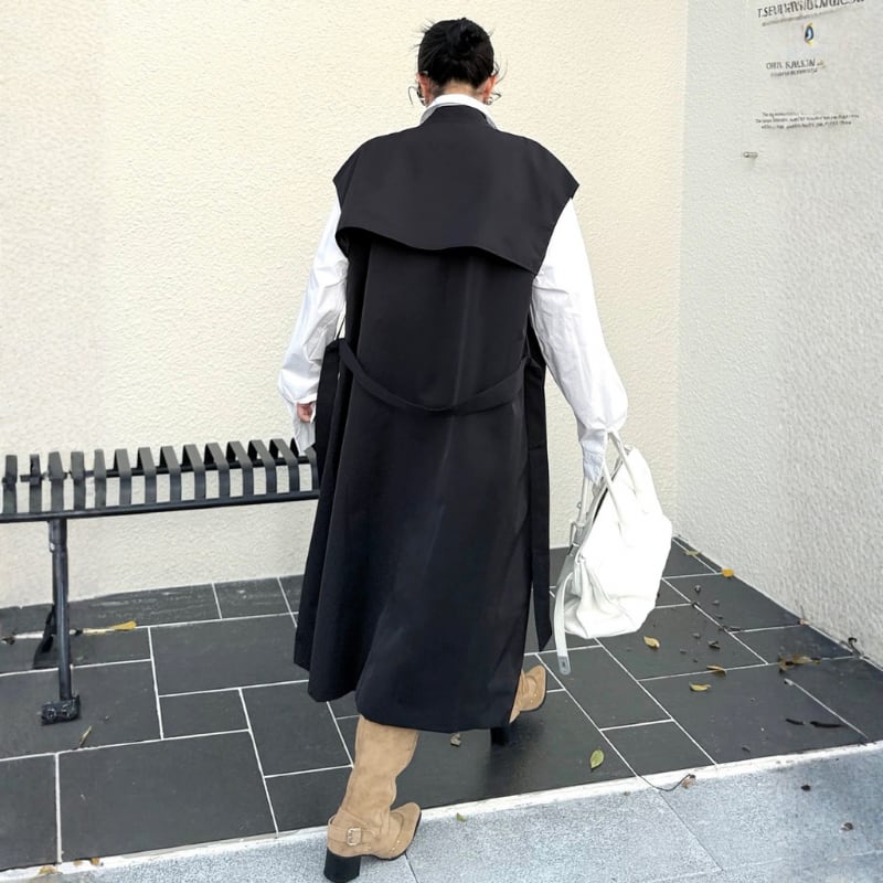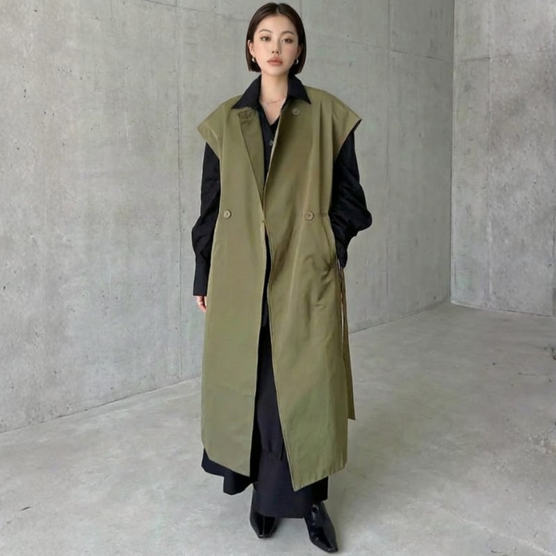 共布ベルトでシルエット調整ができ、羽織るだけでムードが完成する一枚です。