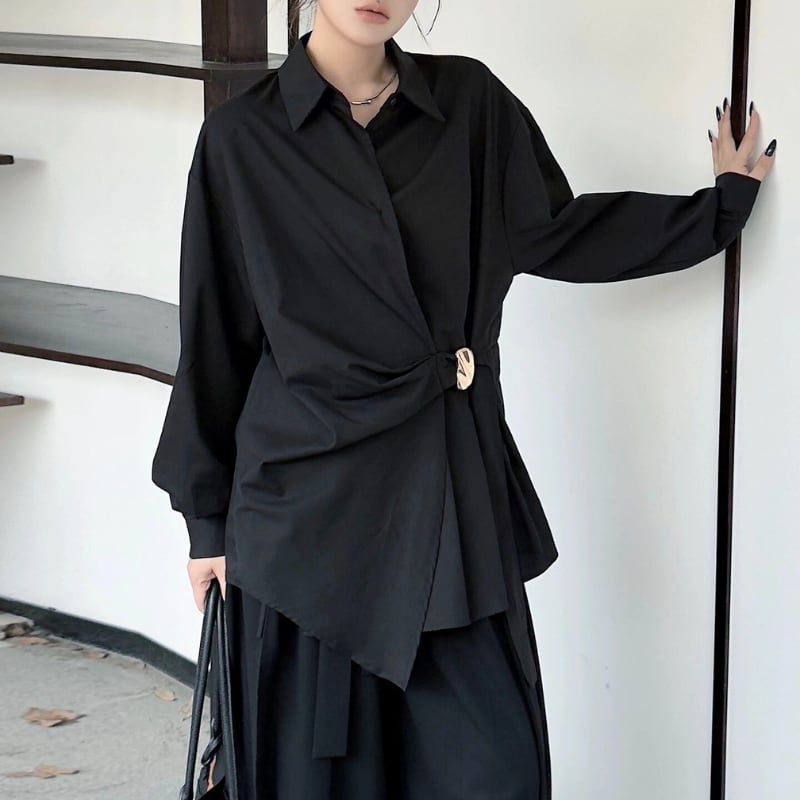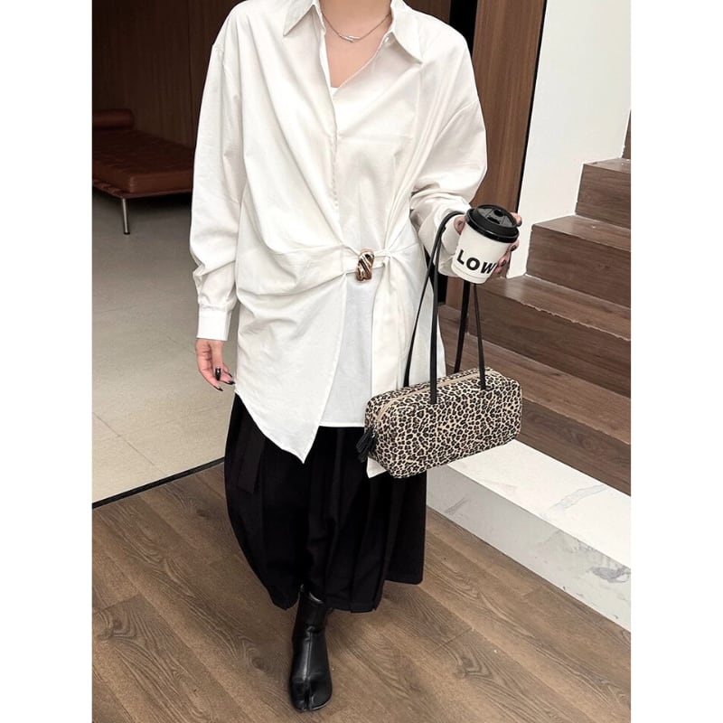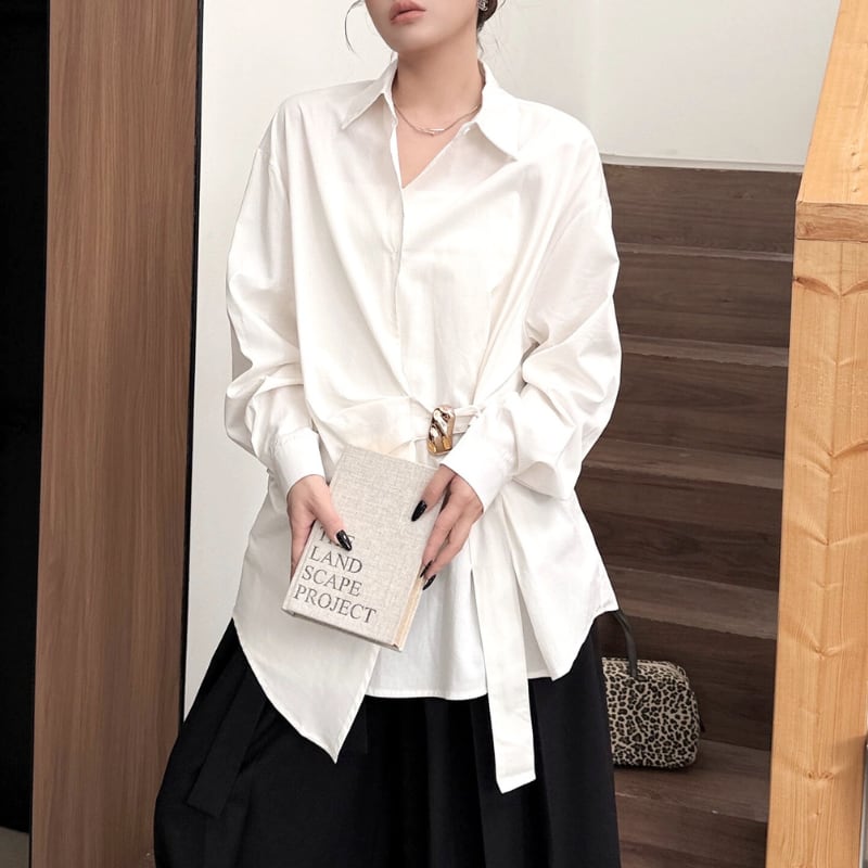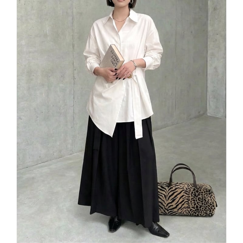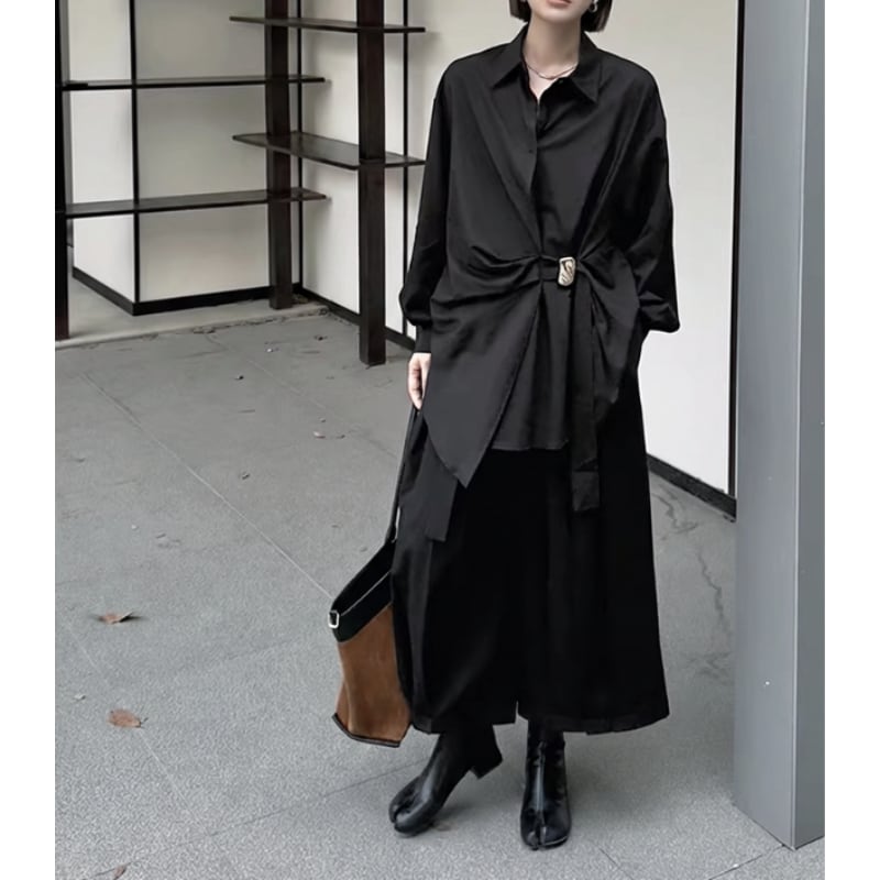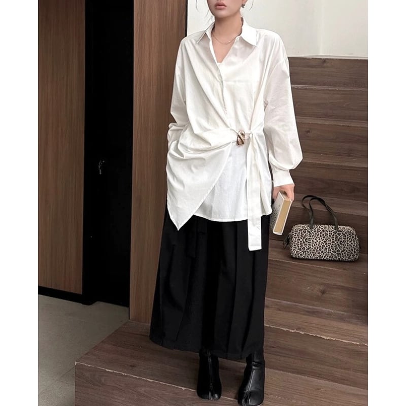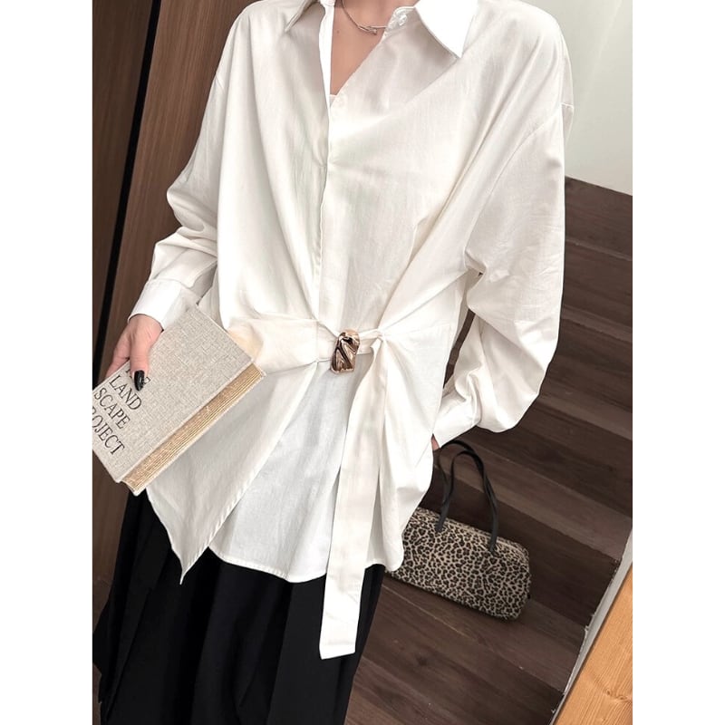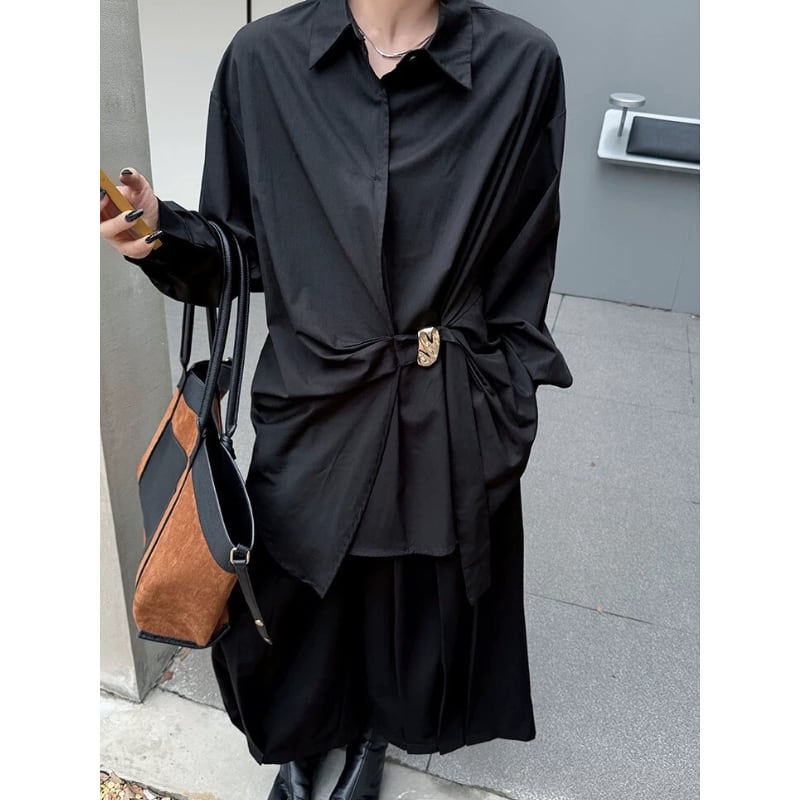 ウエストを絞れるツイストバックル付きのロングシャツ。