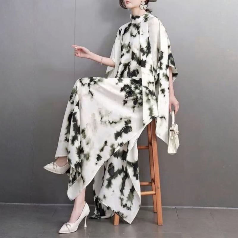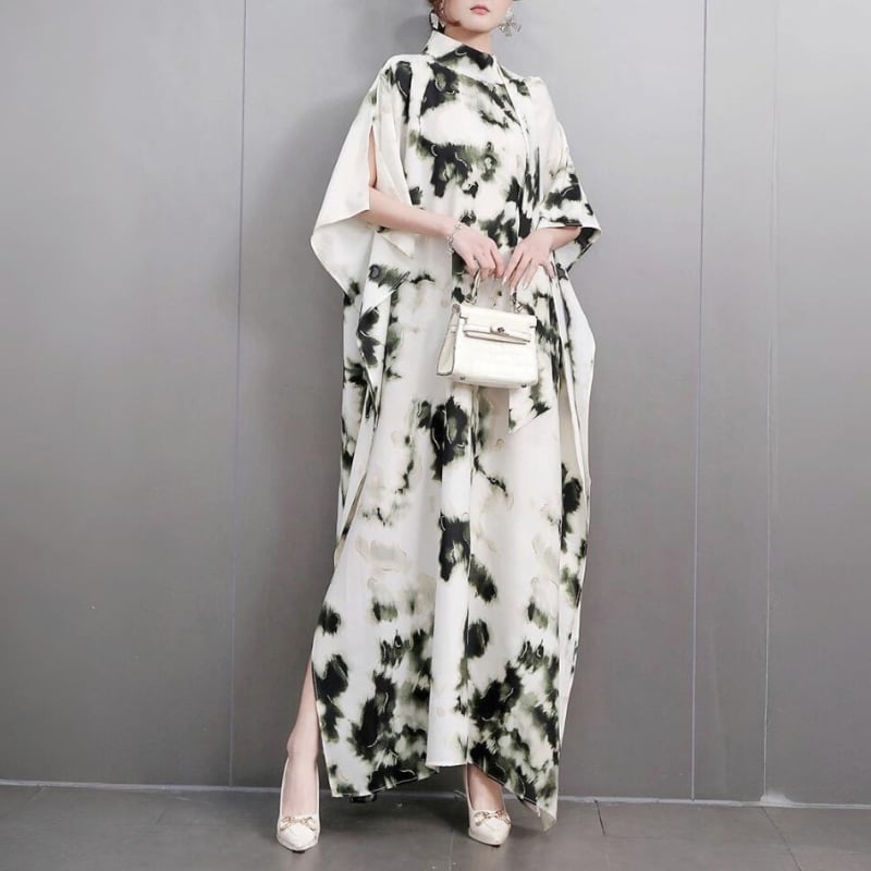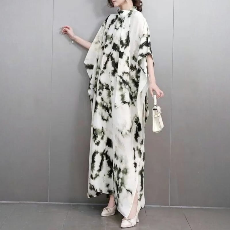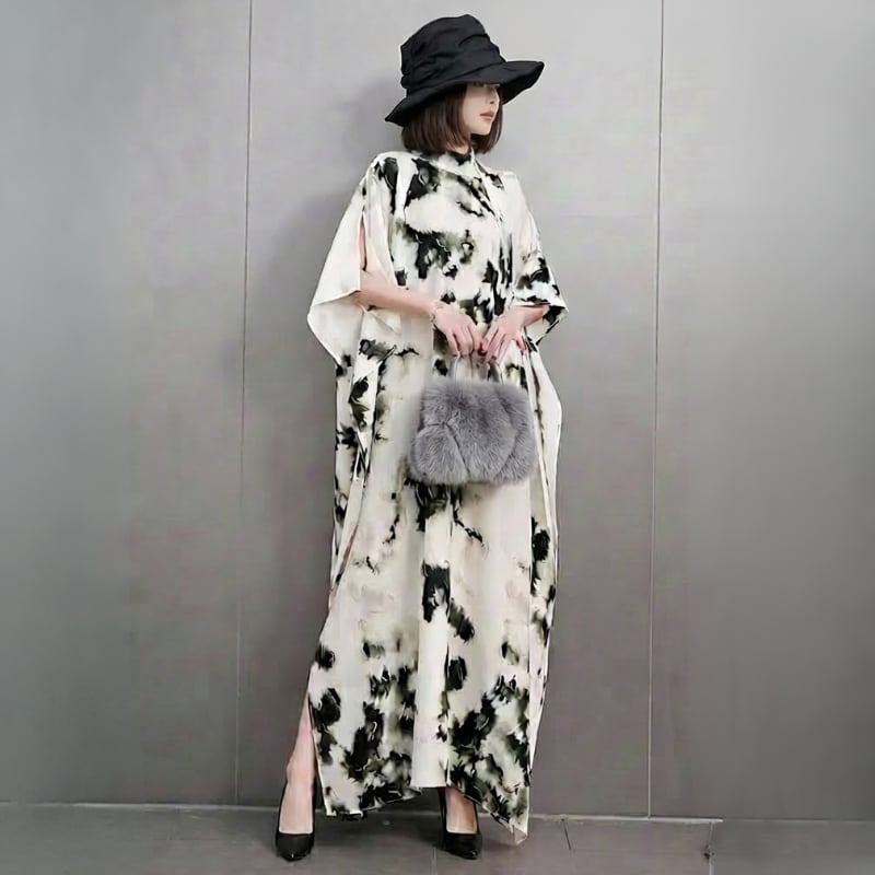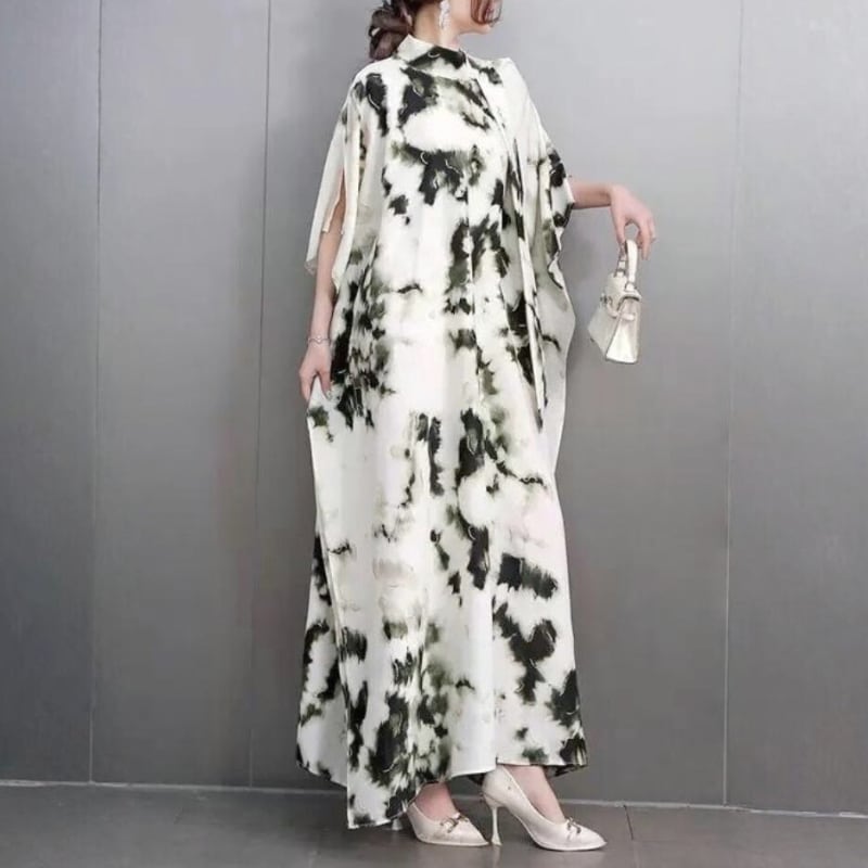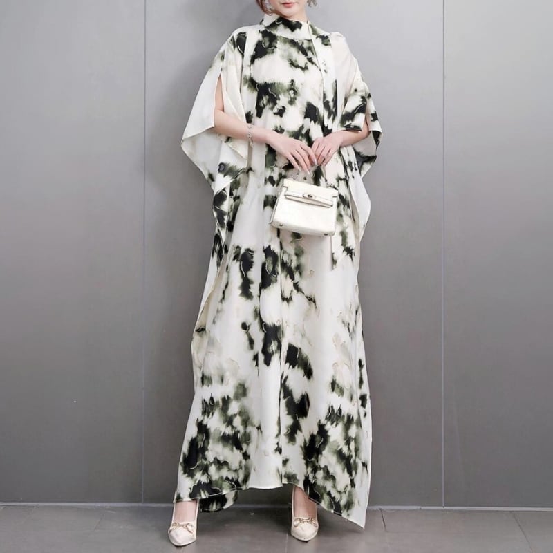 滲み柄プリントが目を引くマキシ丈ワンピース。