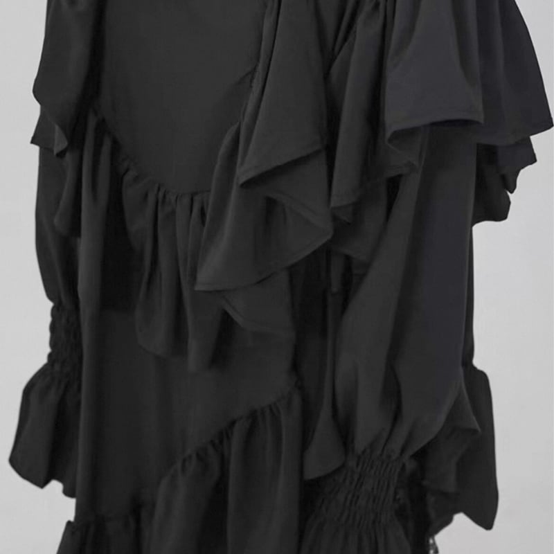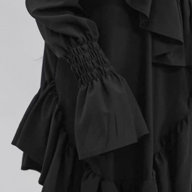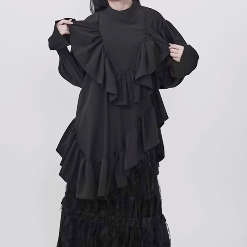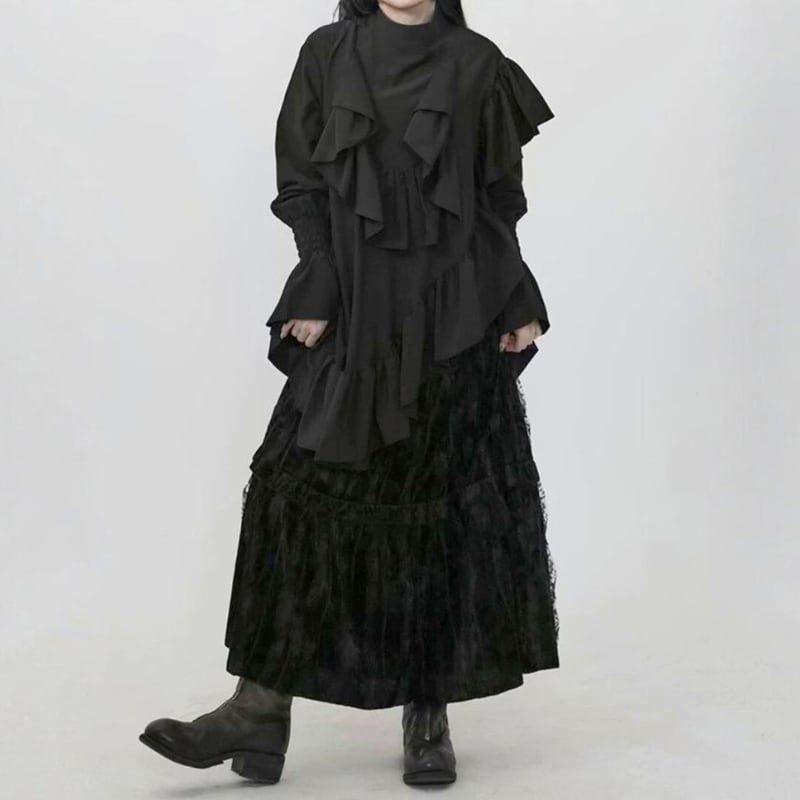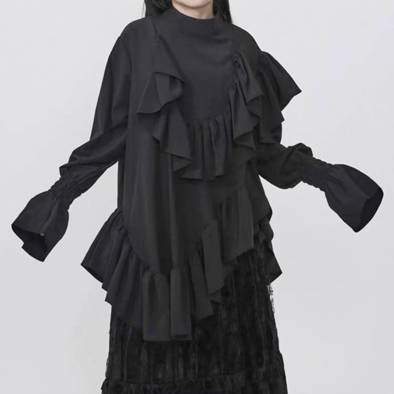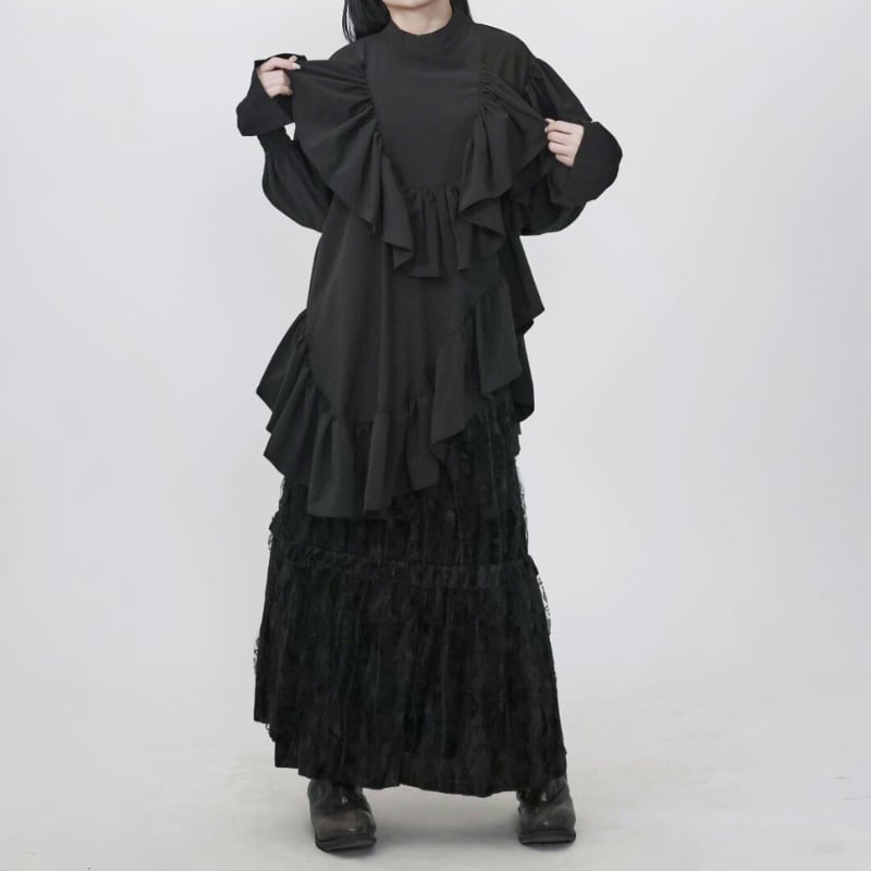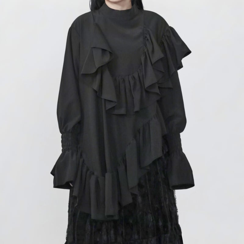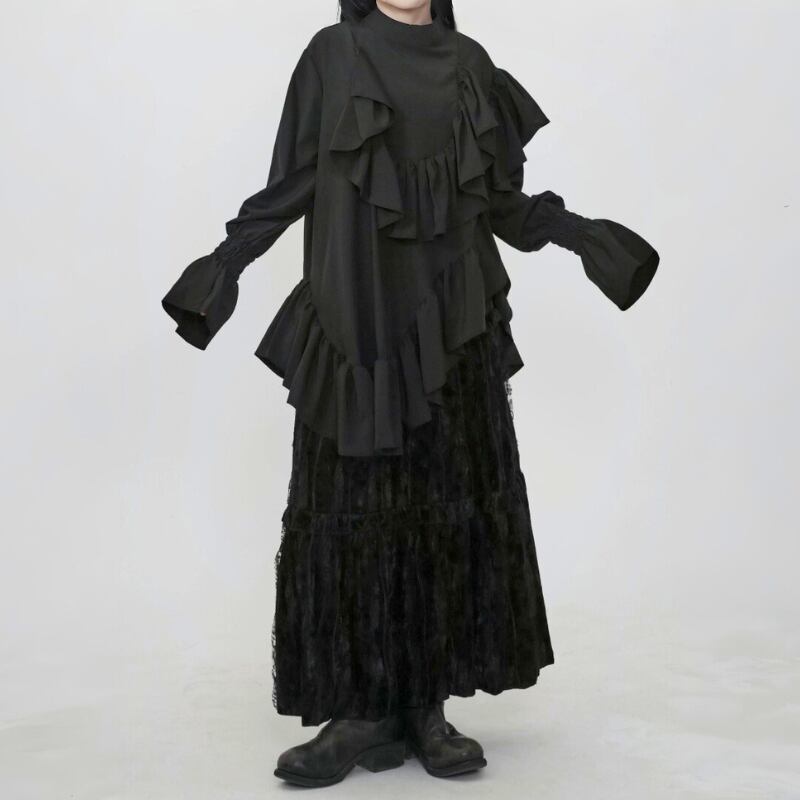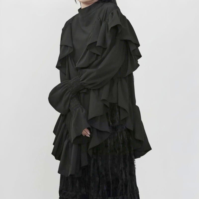 フレアスリーブとアシンメトリーな揺れ感で、着こなしに奥行きを足す一枚です。