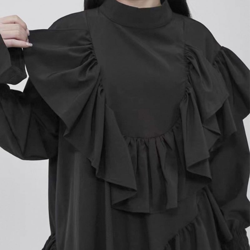 ハイネックとレイヤード風の重なりが、ブラックの存在感を引き立てます。