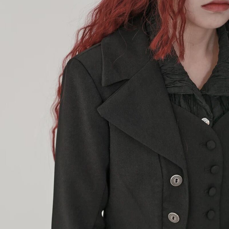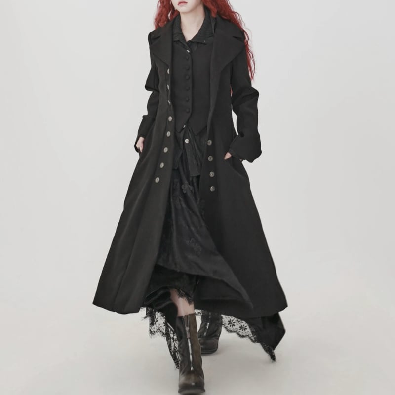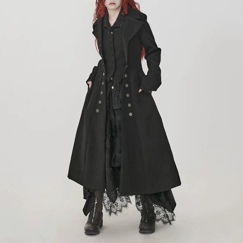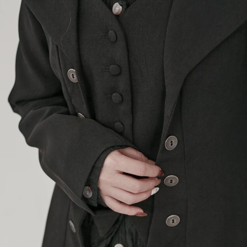 左右に並ぶボタンディテールとフレアに広がるラインが、シルエットをきれいに整えます。
