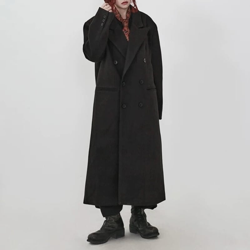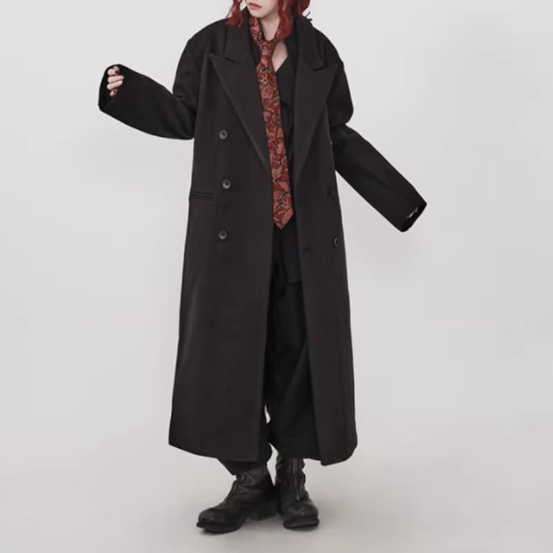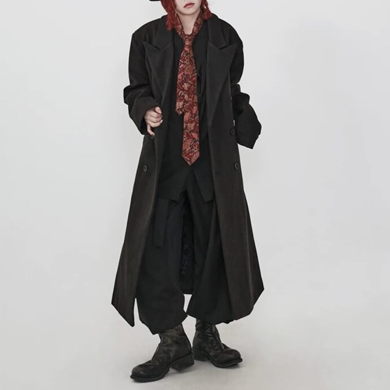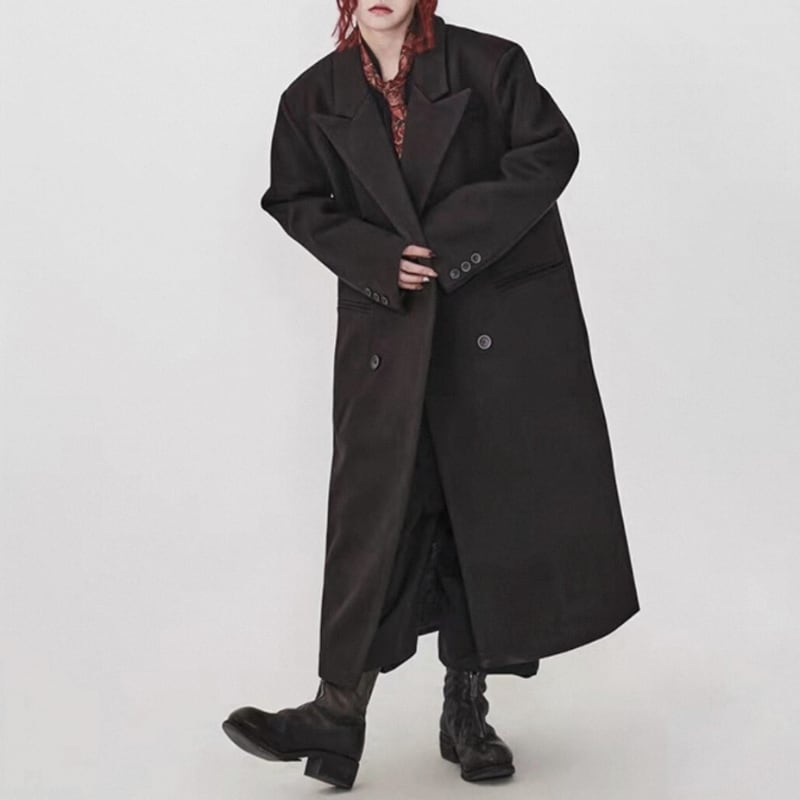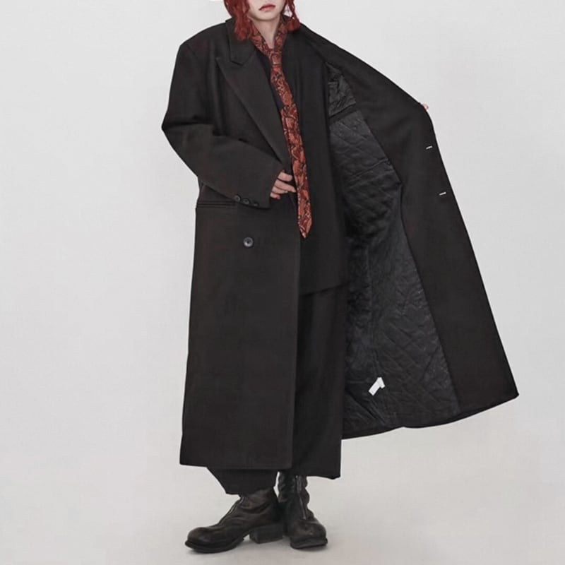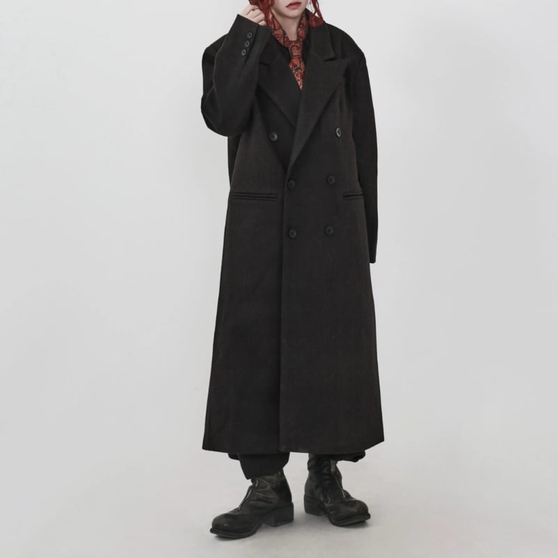ダブルブレストの重厚感とオーバーサイズの落ち感で、着こなしを引き締める一枚です。