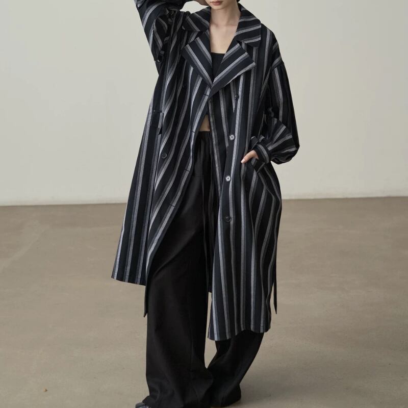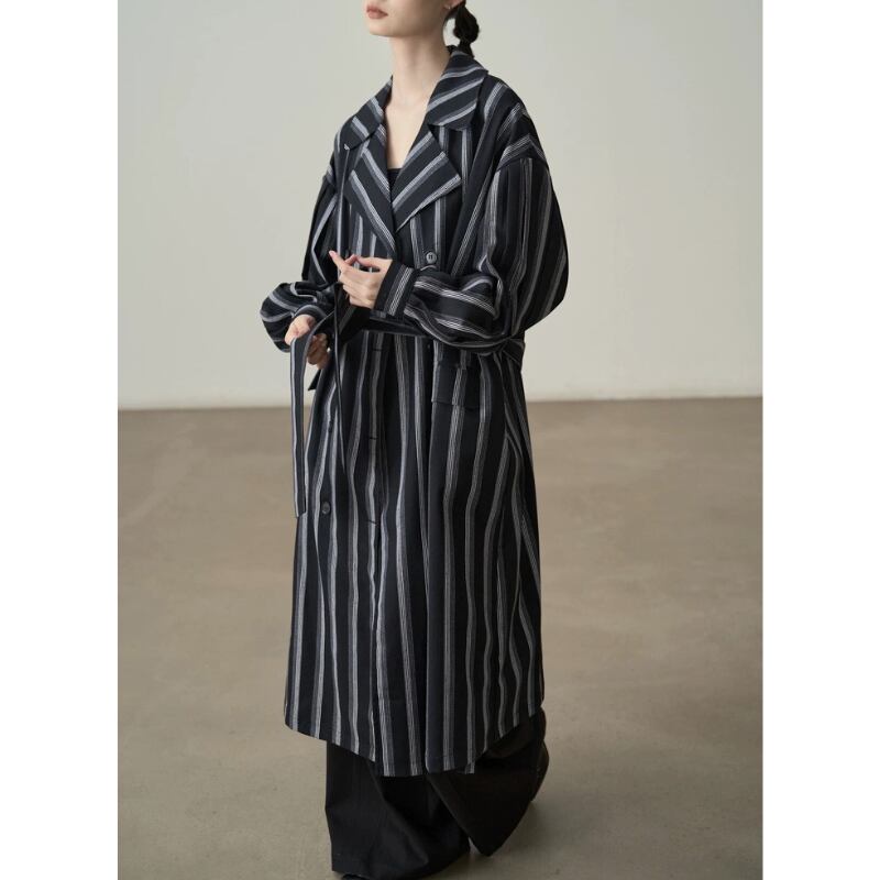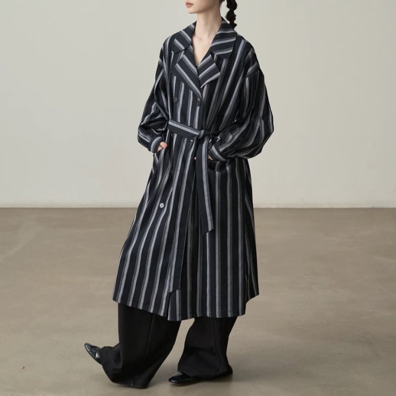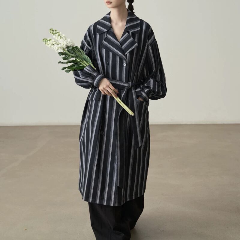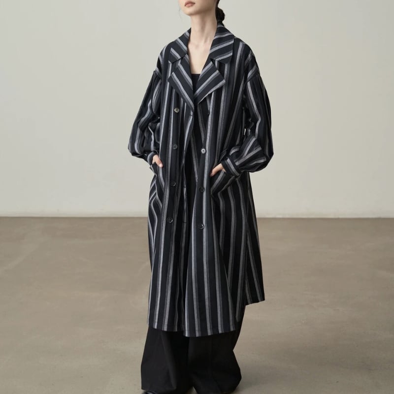 縦のストライプが印象を引き締める、コートライクなワンピース。