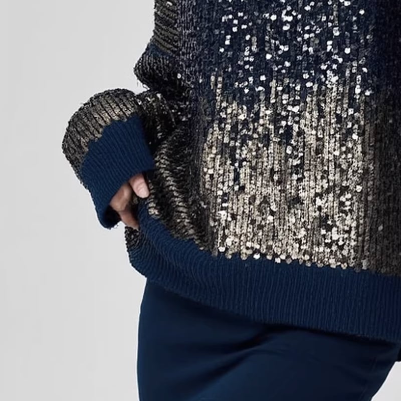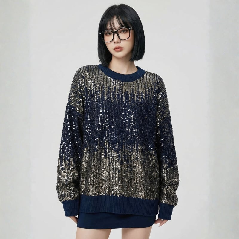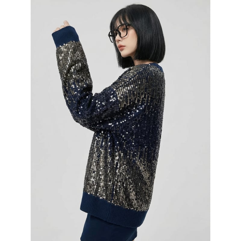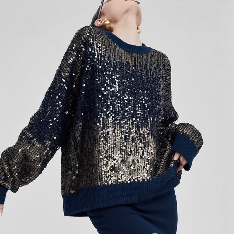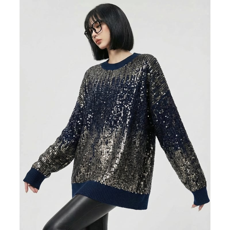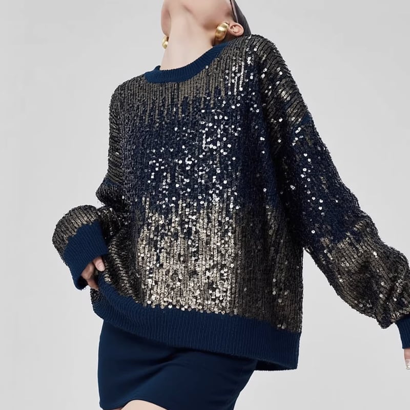繊細なスパンコールが全体にあしらわれた、存在感のあるニットトップス。