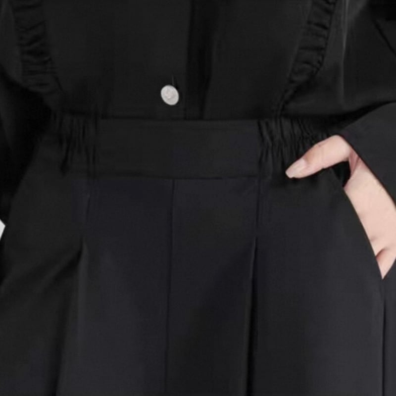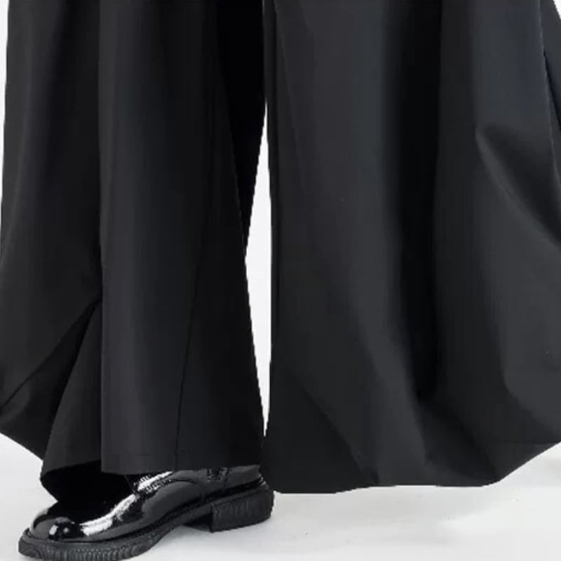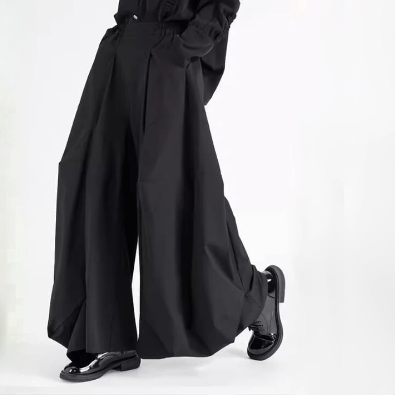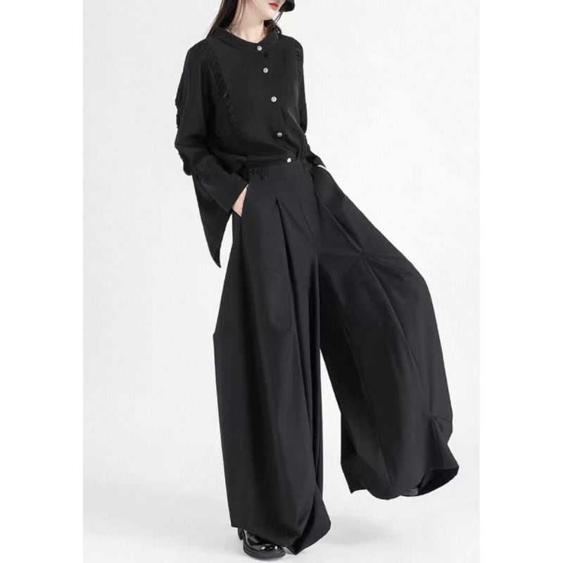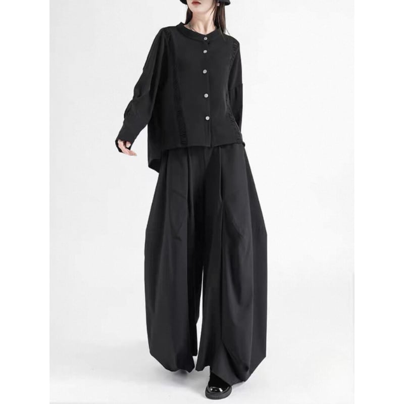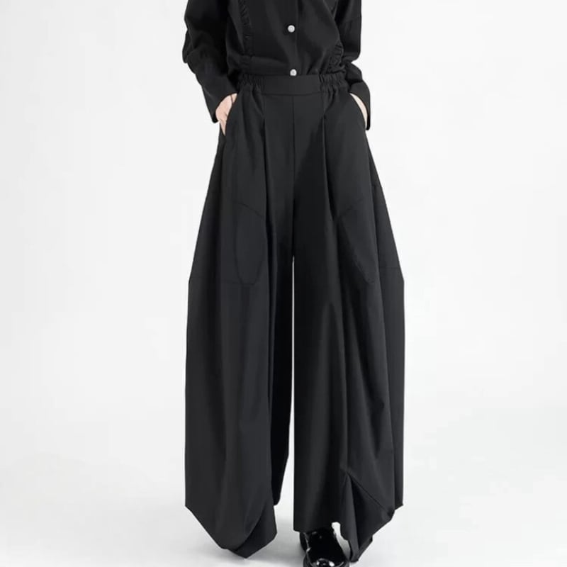斜めに入った切り替えが印象に残る、ワイドシルエットのパンツ。