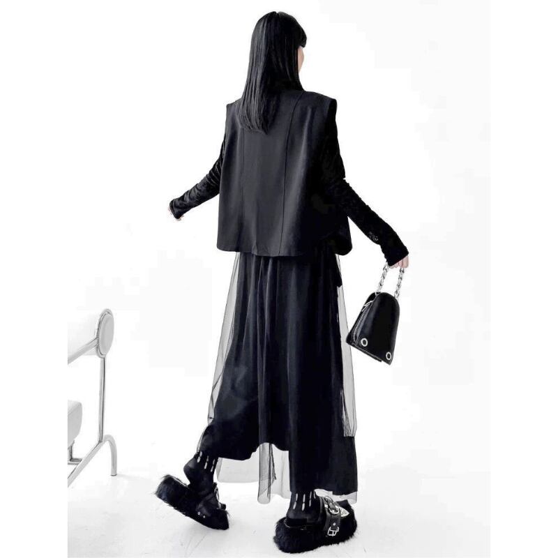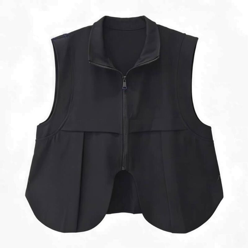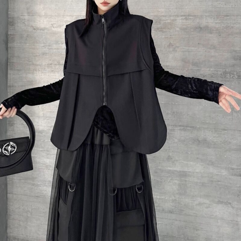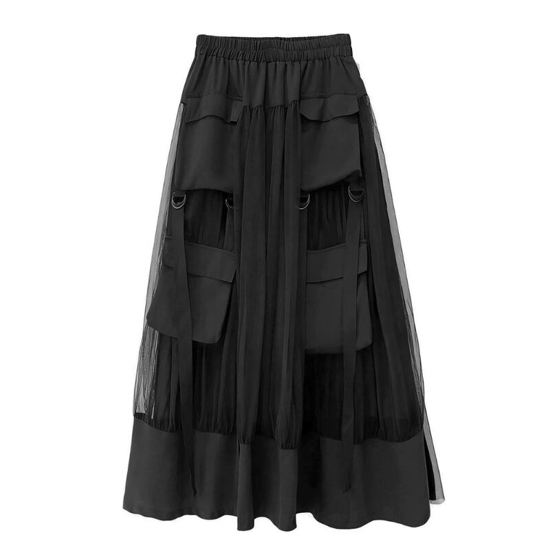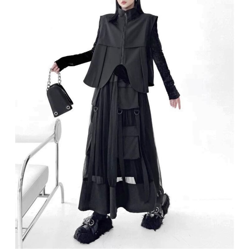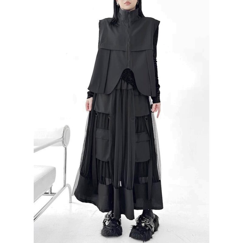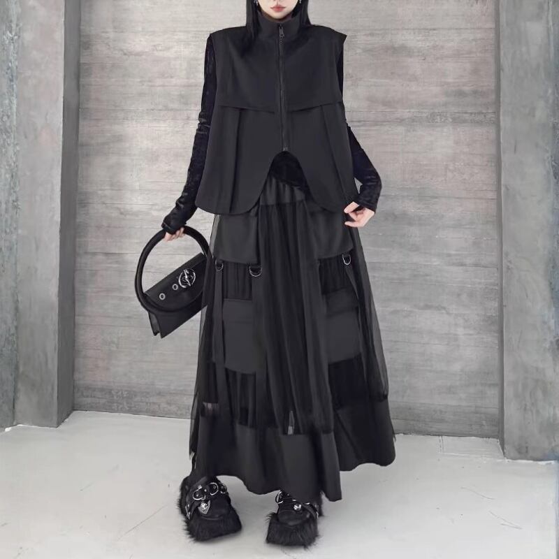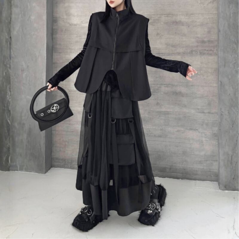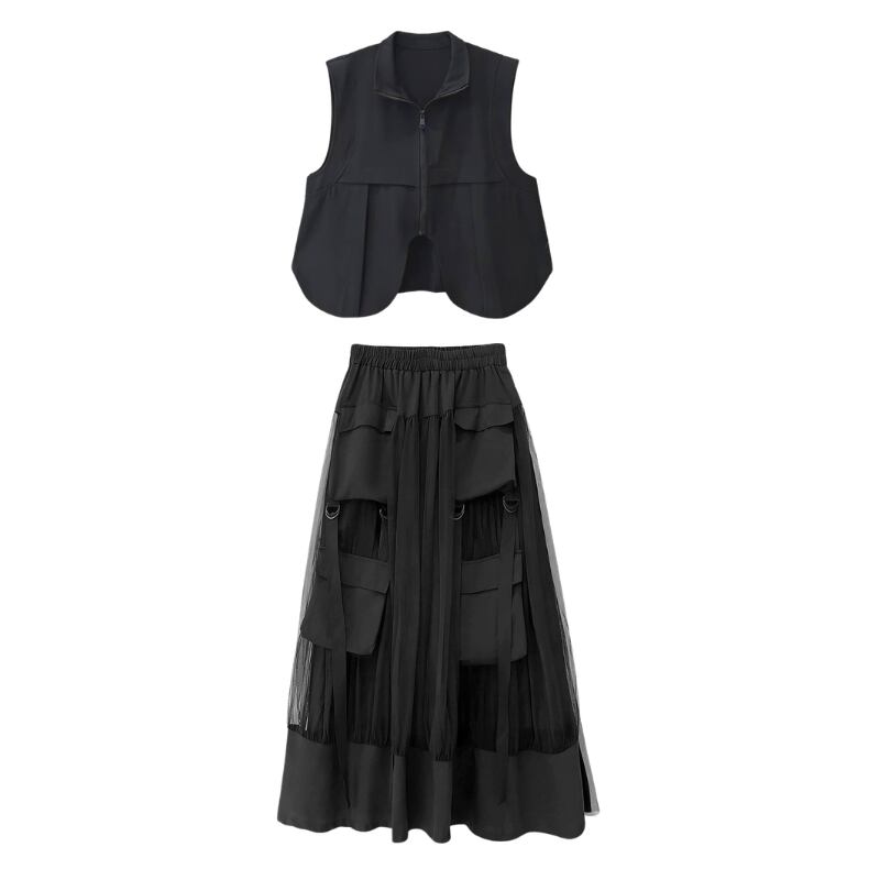 立体ポケットとリングディテールを配したベストとスカートのセットアップ。