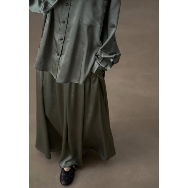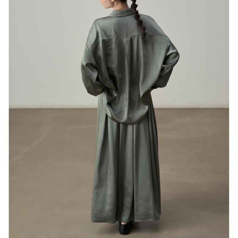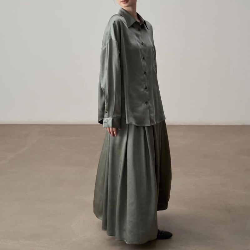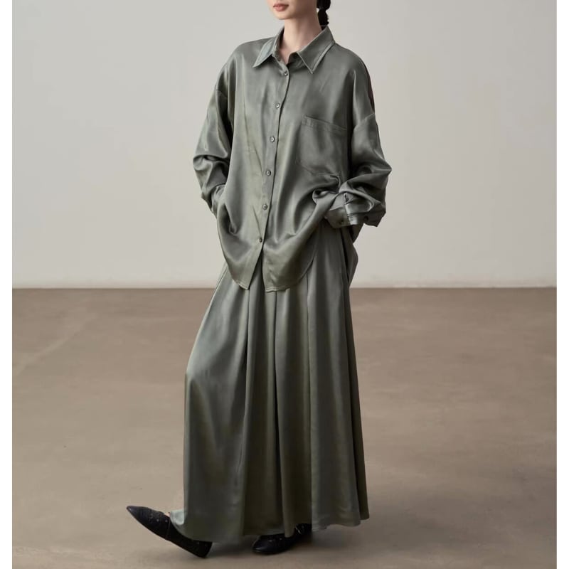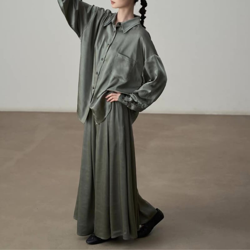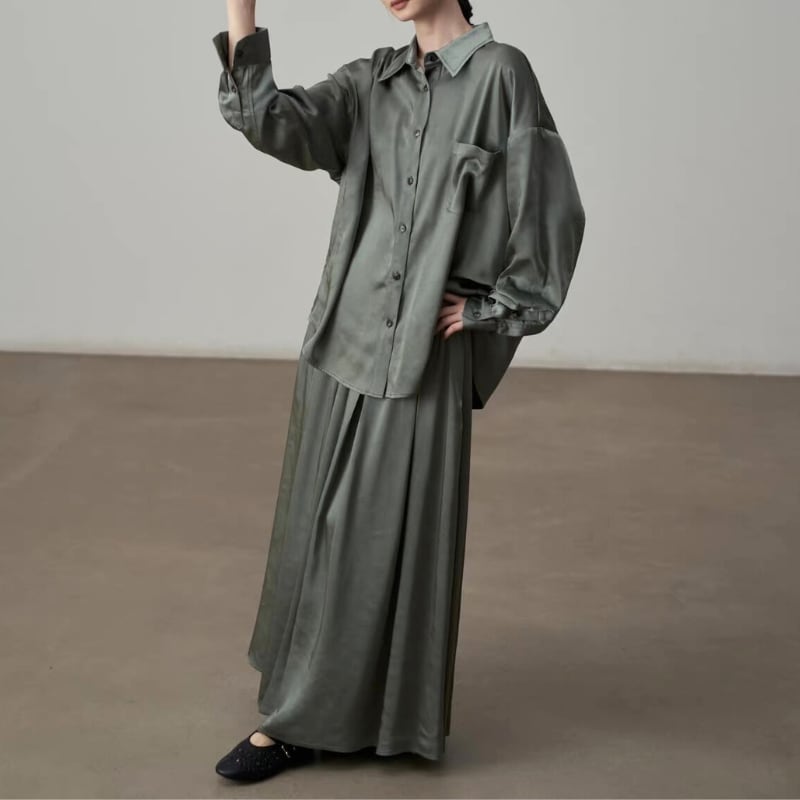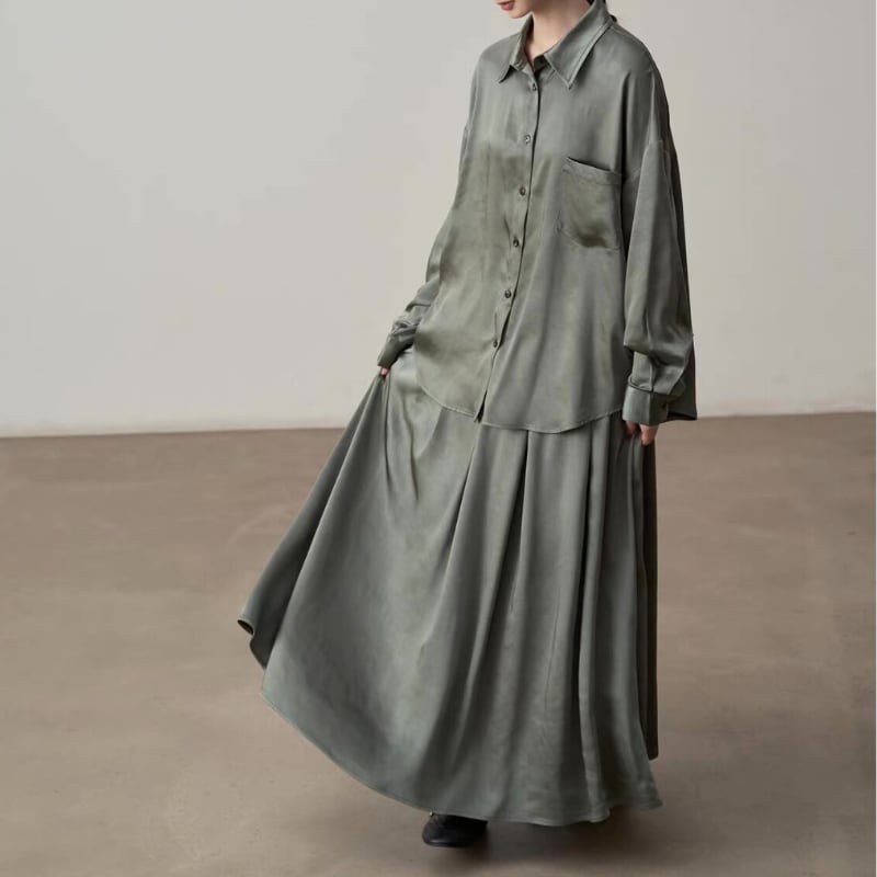 ゆったりとしたシルエットのシャツとロングスカートのセットアップ。