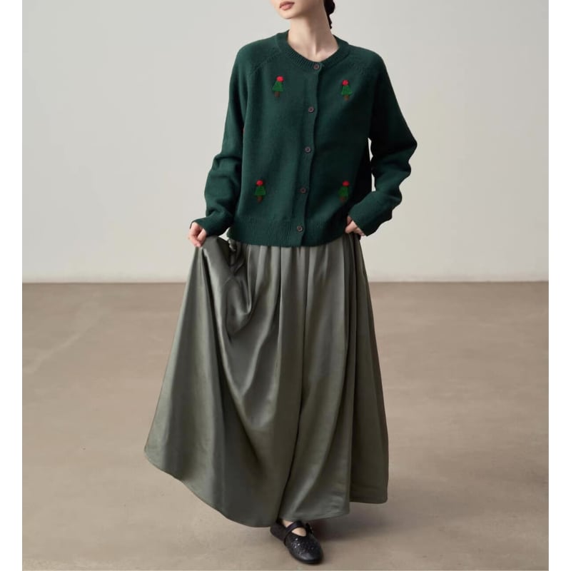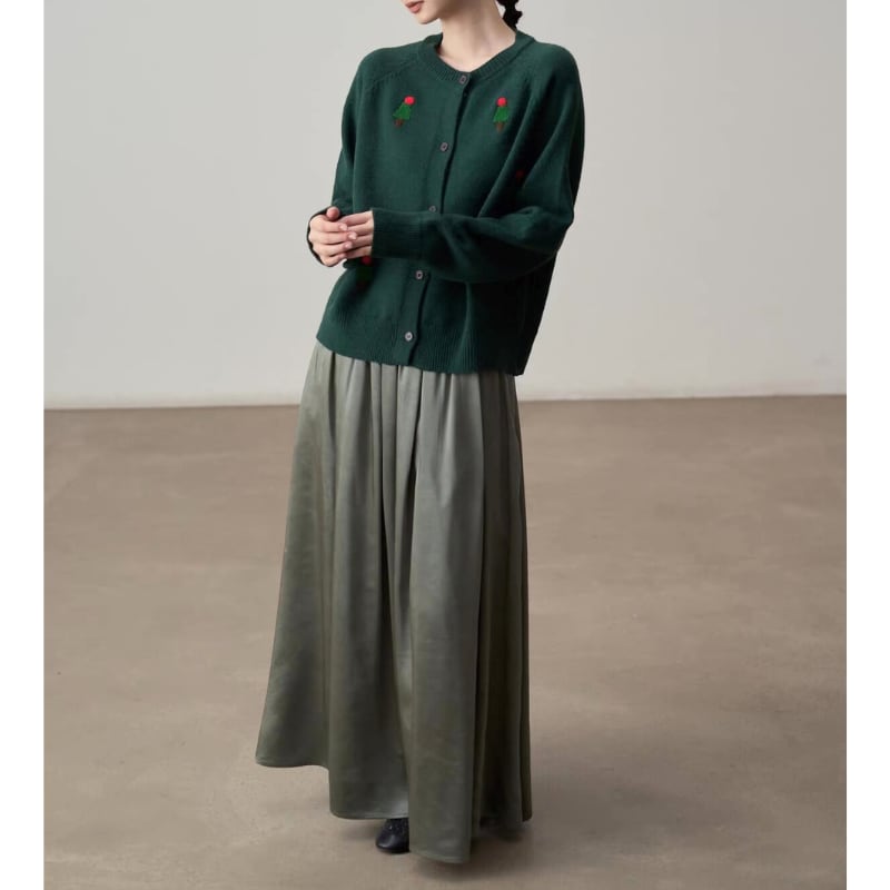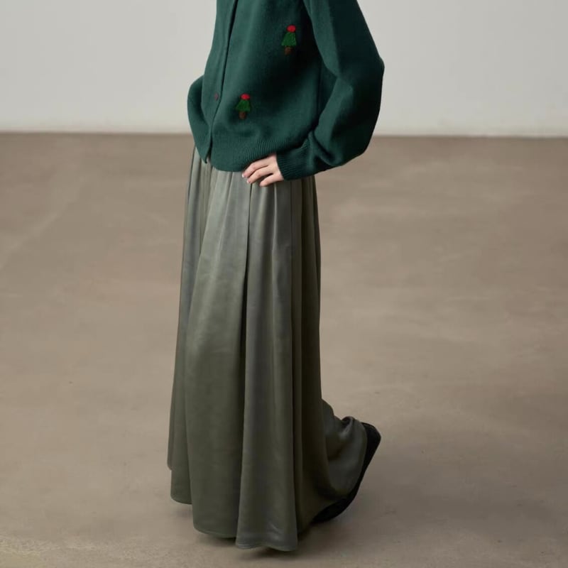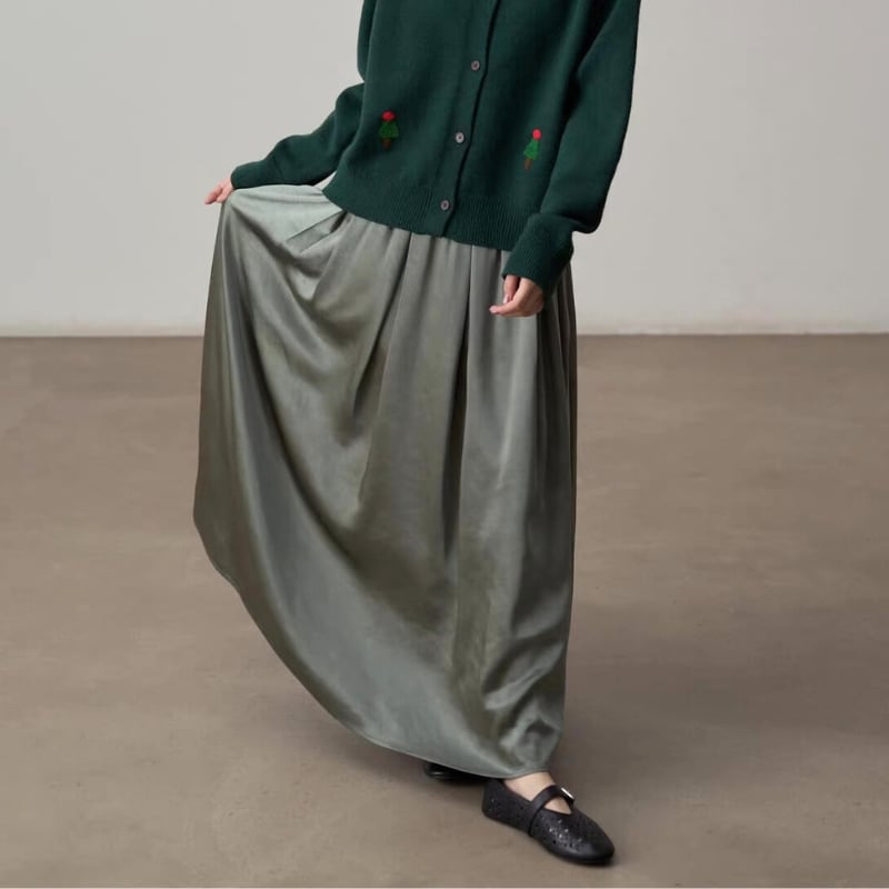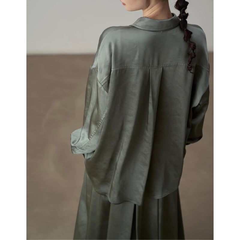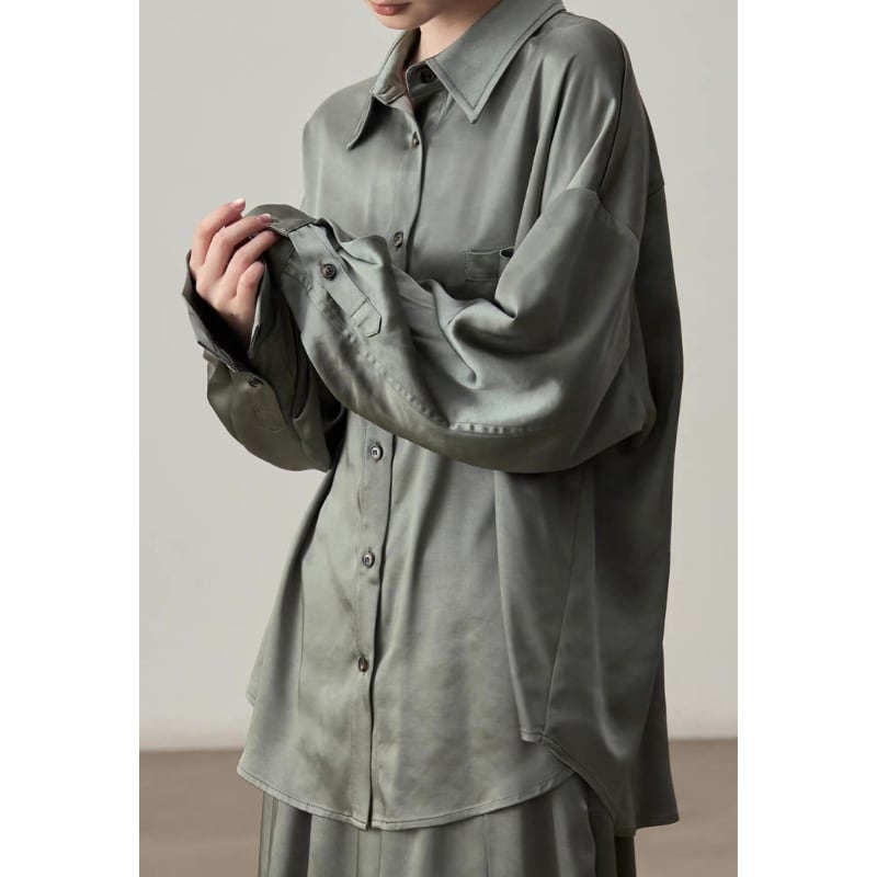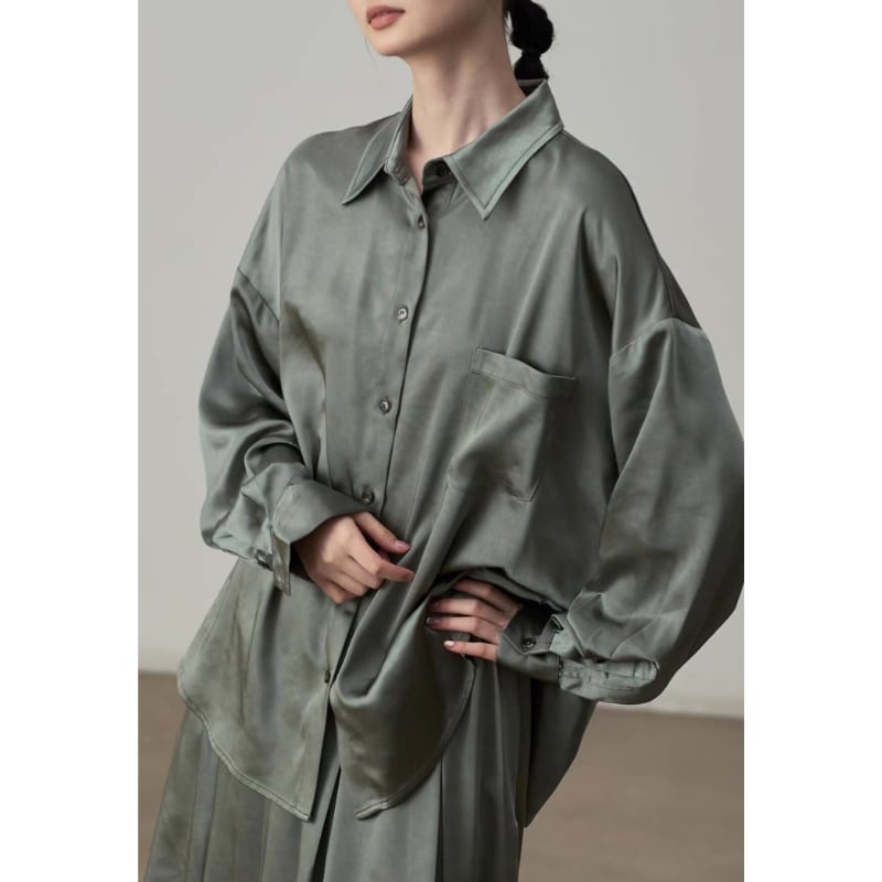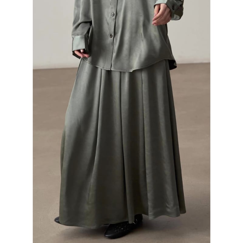 ゆったりとしたシルエットのシャツとロングスカートのセットアップ。
