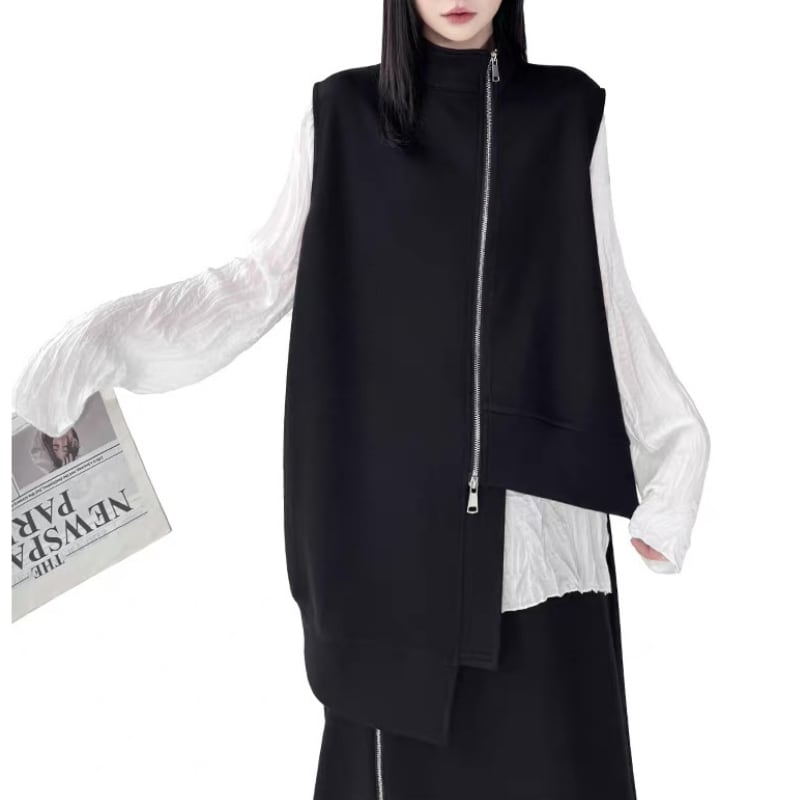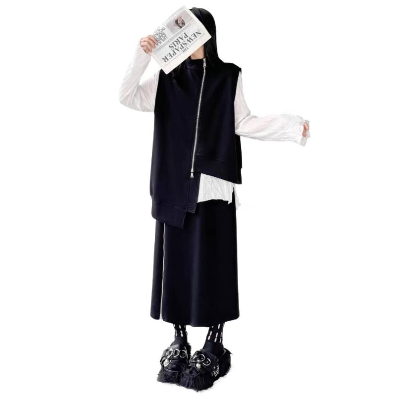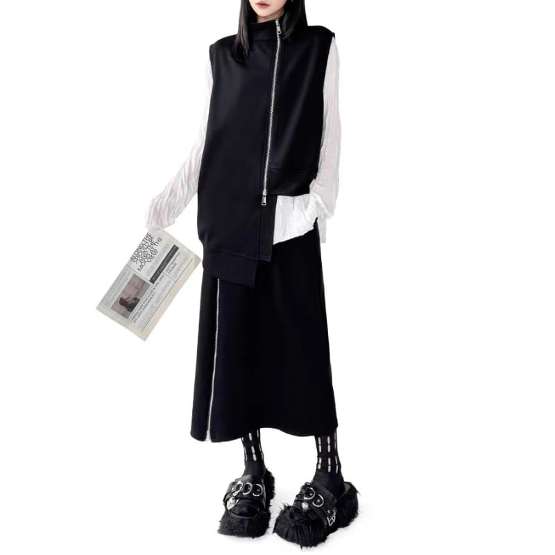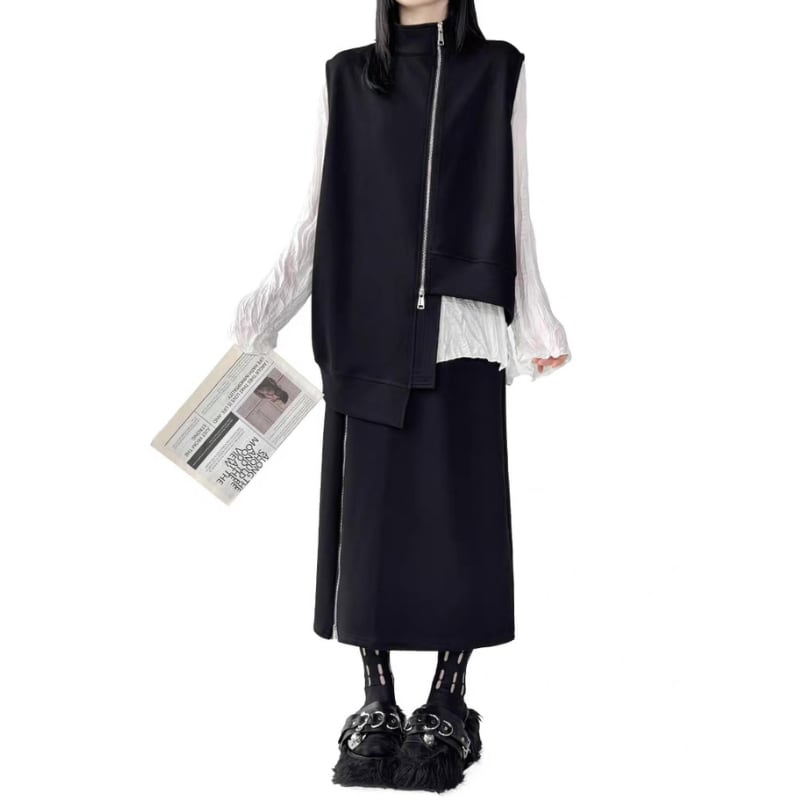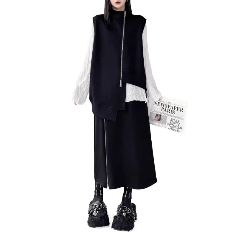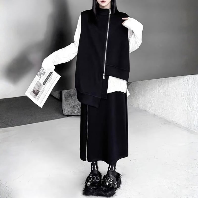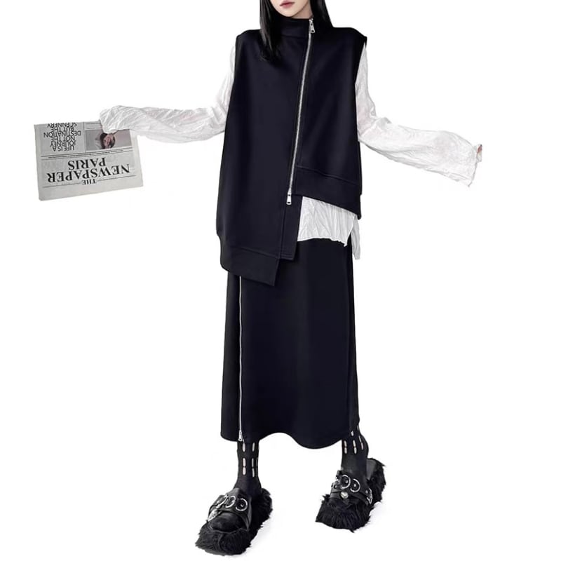 ベストとスカートに配されたフロントジップがシャープなラインを生み出すデザイン。