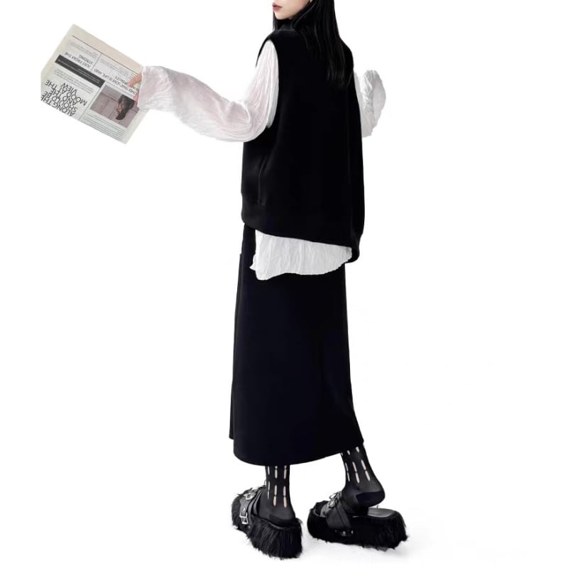 アシンメトリーシルエットが印象的なベストとスカートのセットアップ。