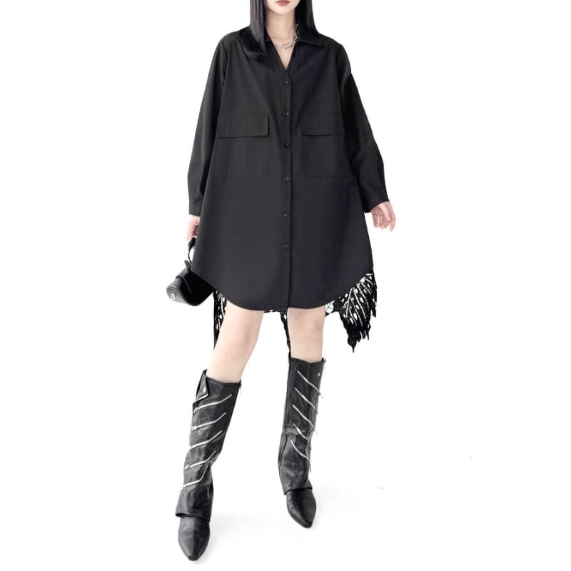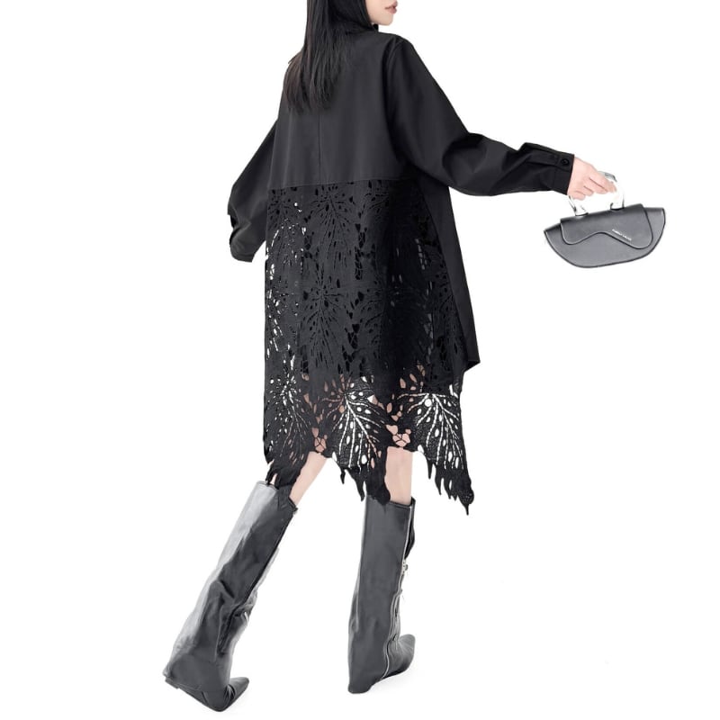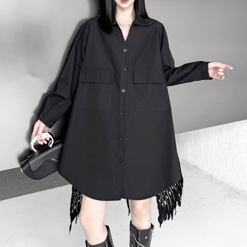 歩くたびに揺れるレースがスタイリングに動きを加え、印象的な存在感を演出する一枚です。