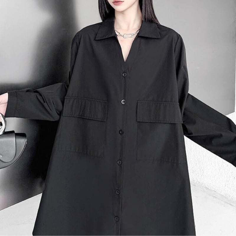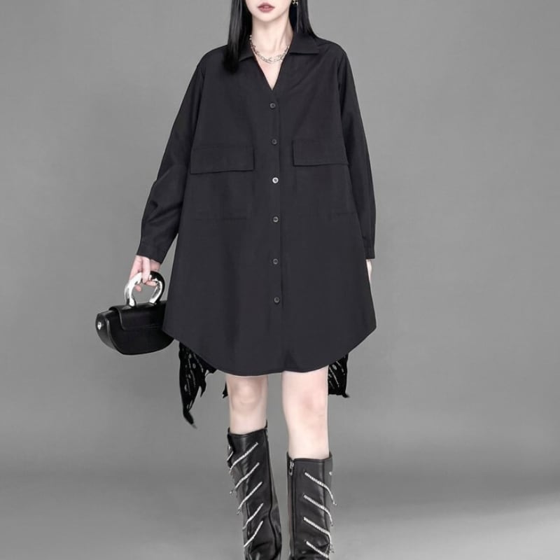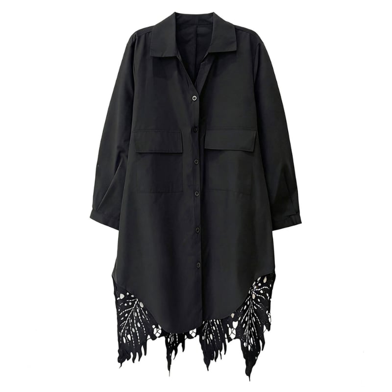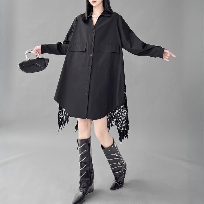 フロントはミニマルなシャツデザイン、後ろに繊細なレースを重ねたレイヤード仕様。