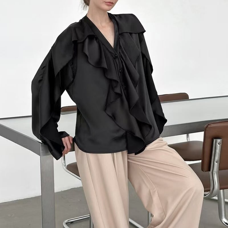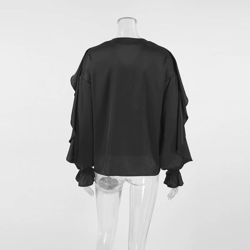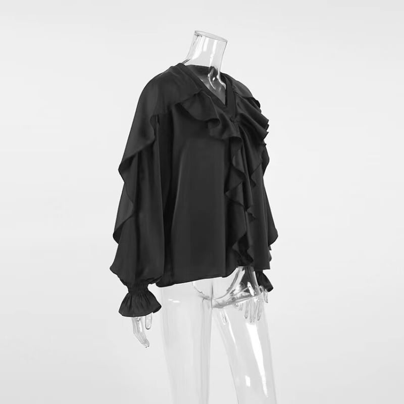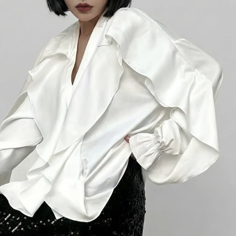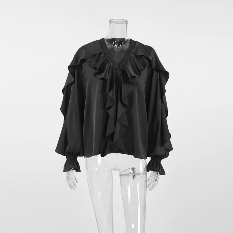 フロントから袖にかけて大きく波打つフリルを重ねたブラウス。