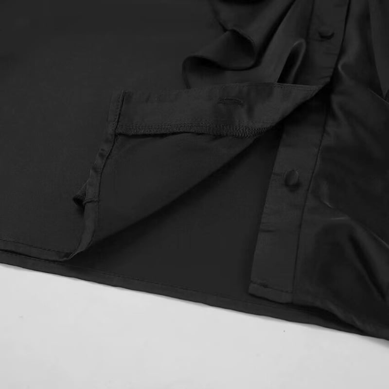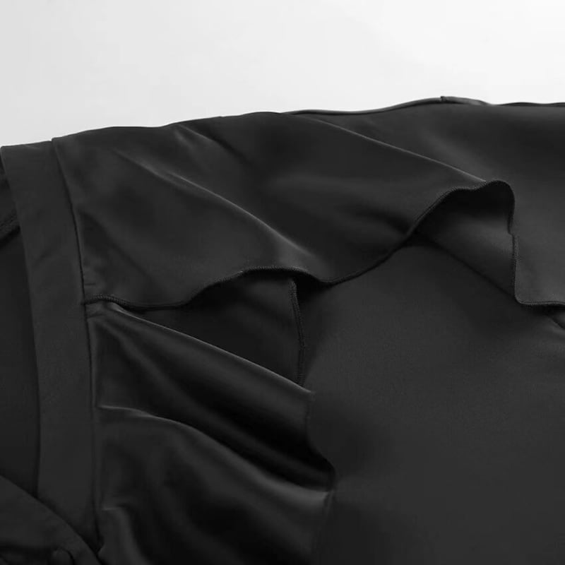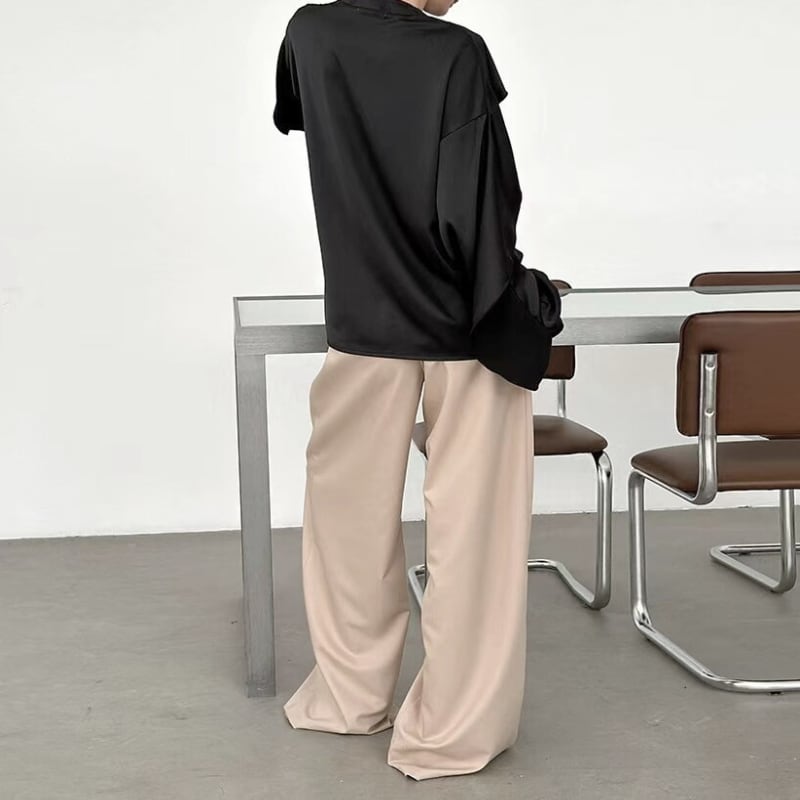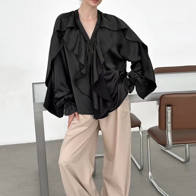 深めのVラインと立体的なドレープが重なり、流れるような動きをつくるアイテム。