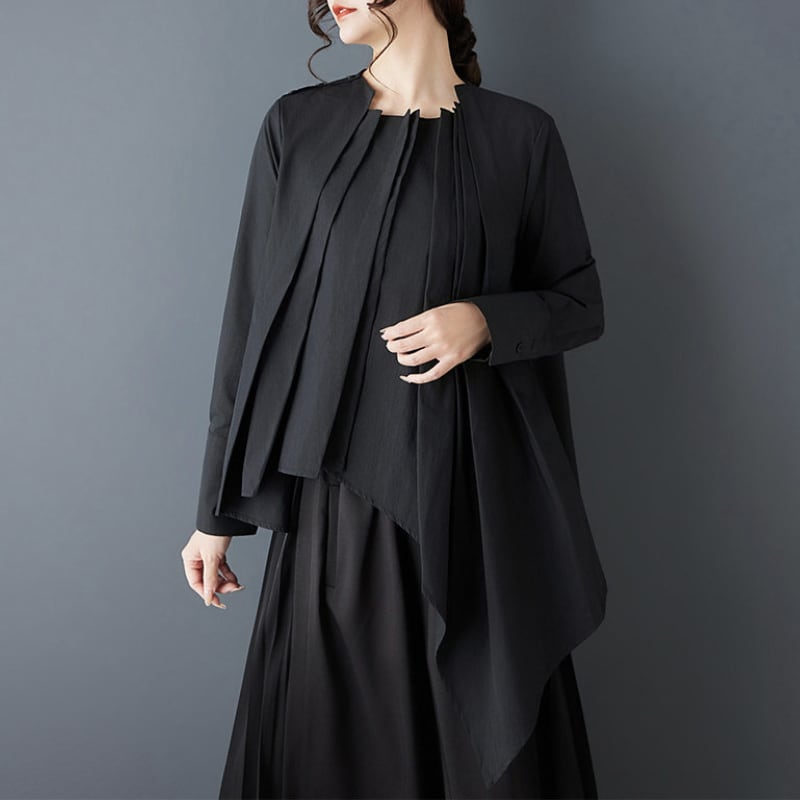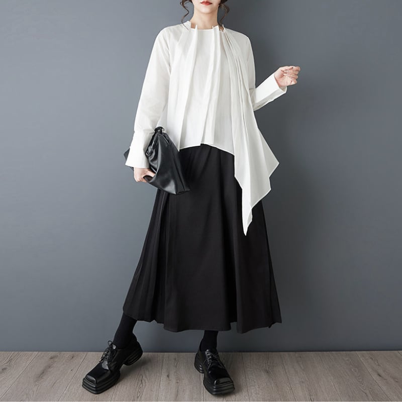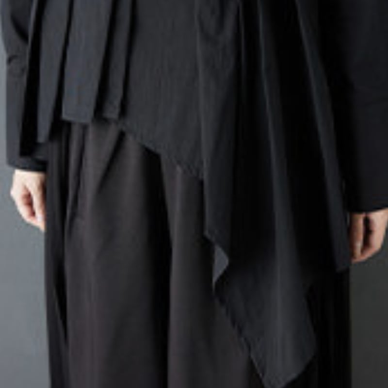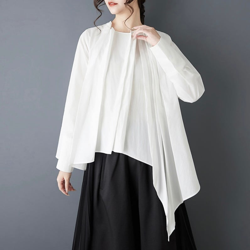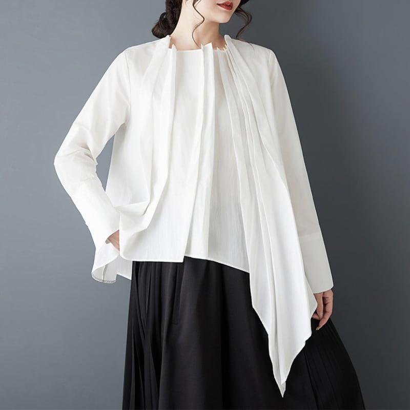 フロントに重ねたプリーツと、左右で長さの違うアシンメトリーなブラウス。