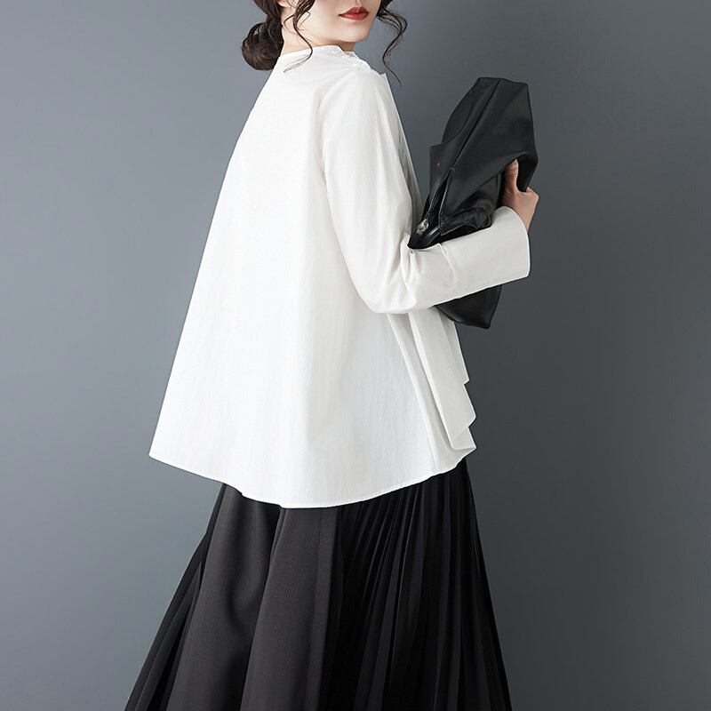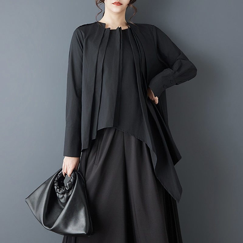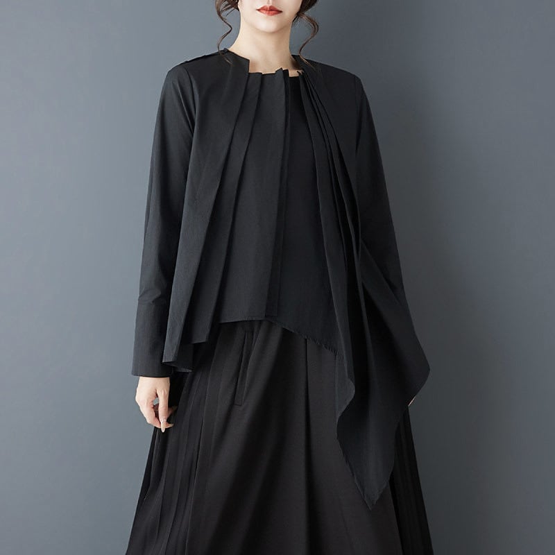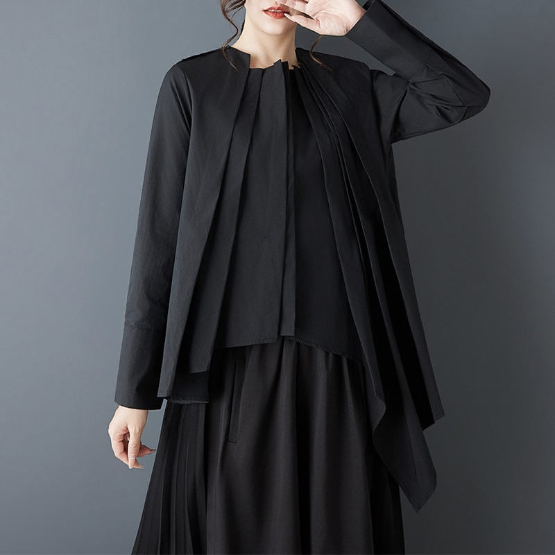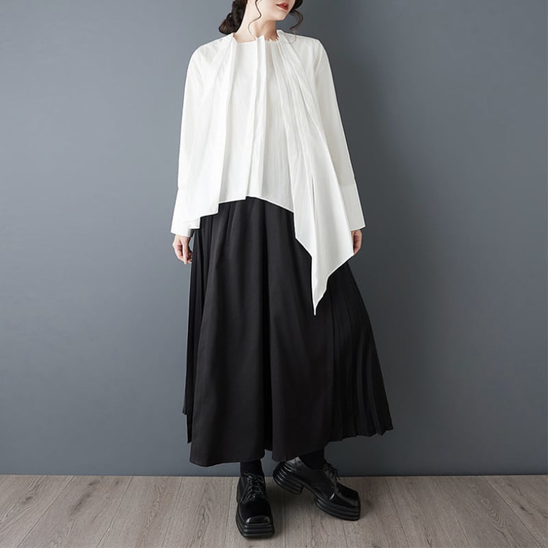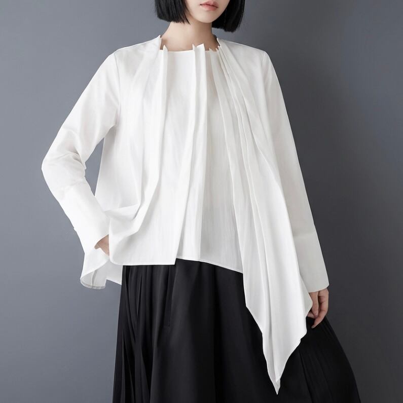 フロントに重ねたプリーツと、左右で長さの違うアシンメトリーなブラウス。