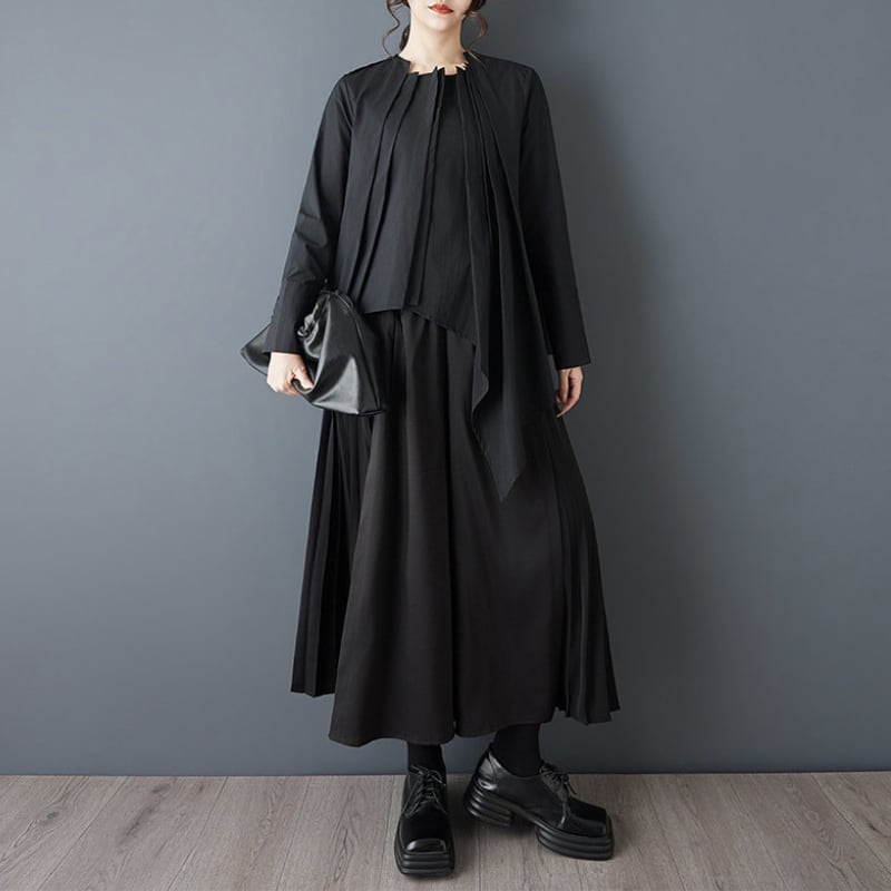 斜めに落ちるドレープと段差のあるヘムラインが、シルエットに動きをつけるデザイン。