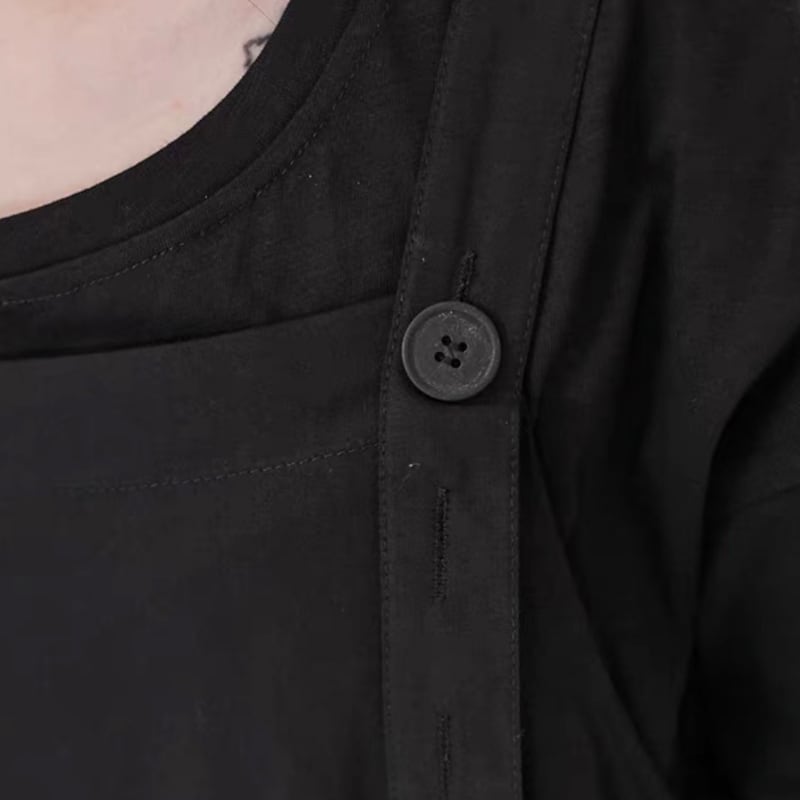 肩ストラップ風ディテールとボリュームの出るシルエットで、存在感を引き立てる一枚です。