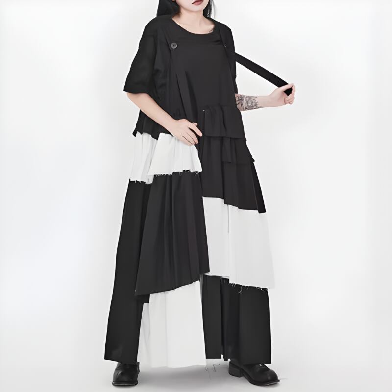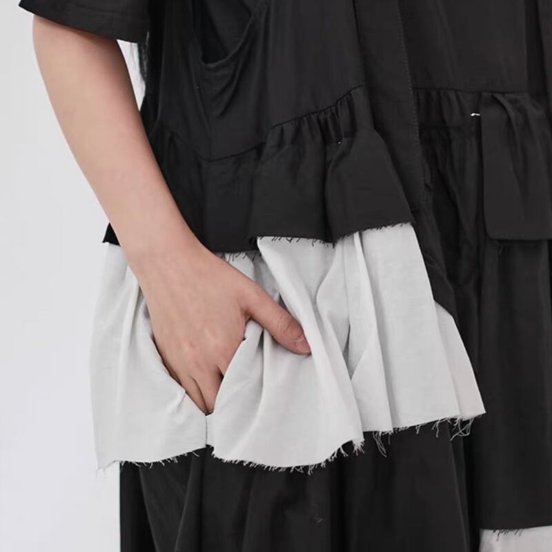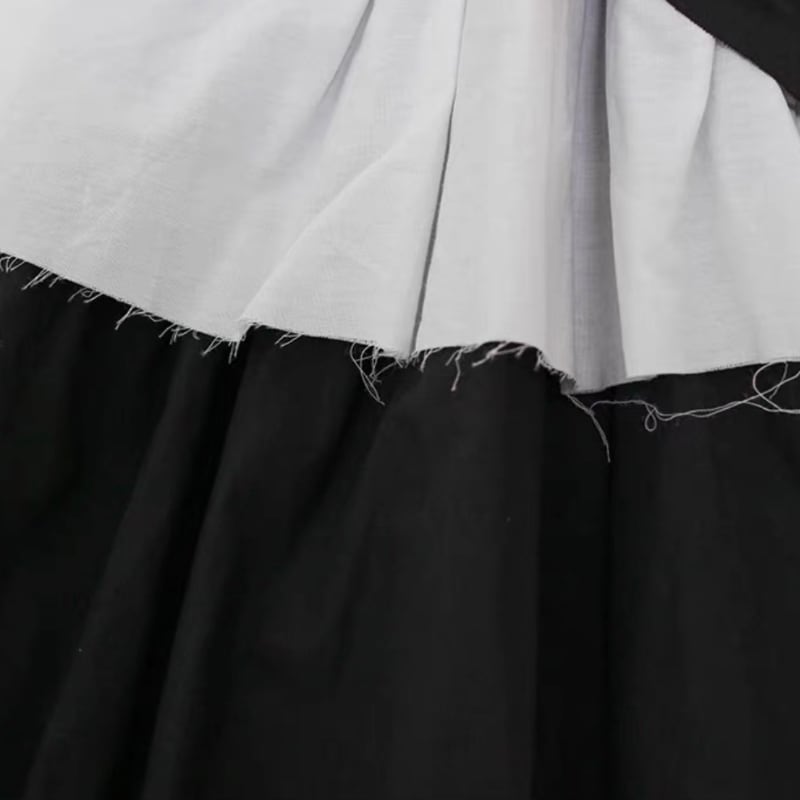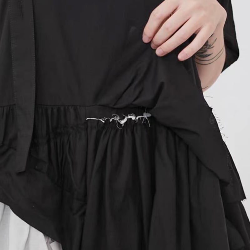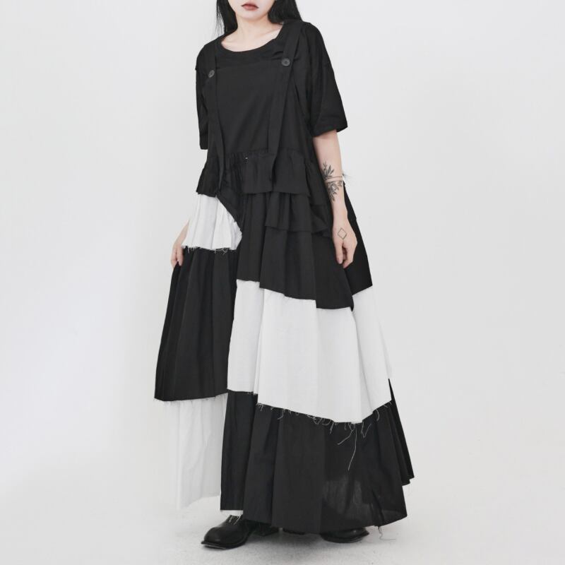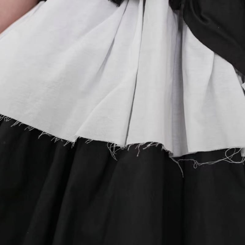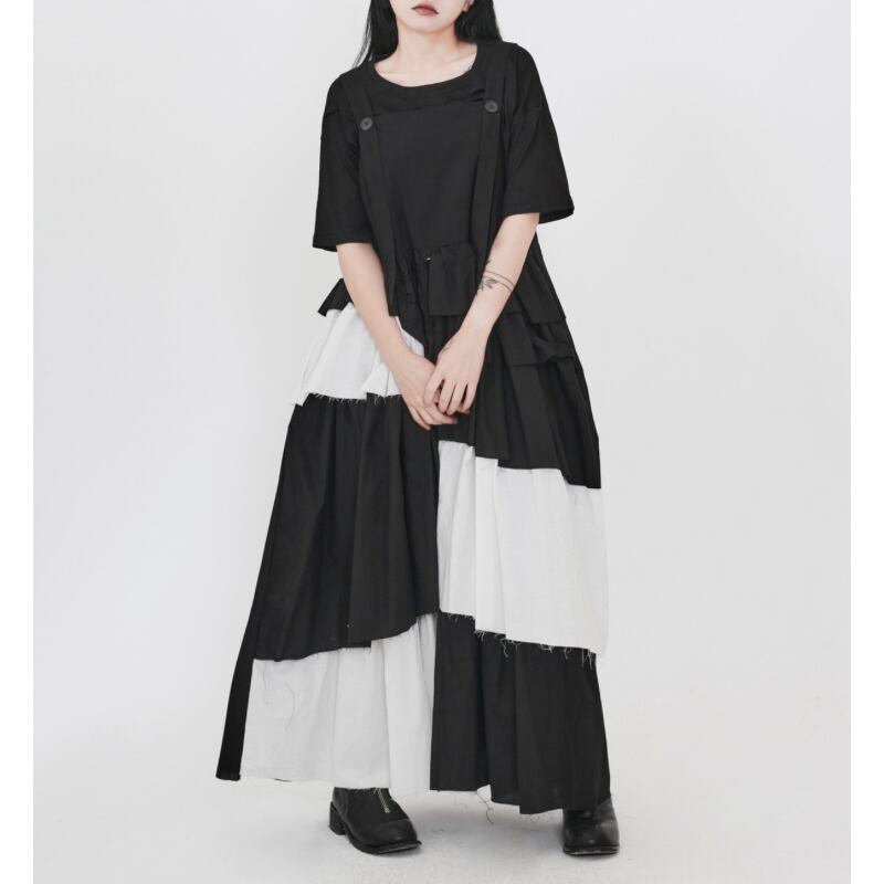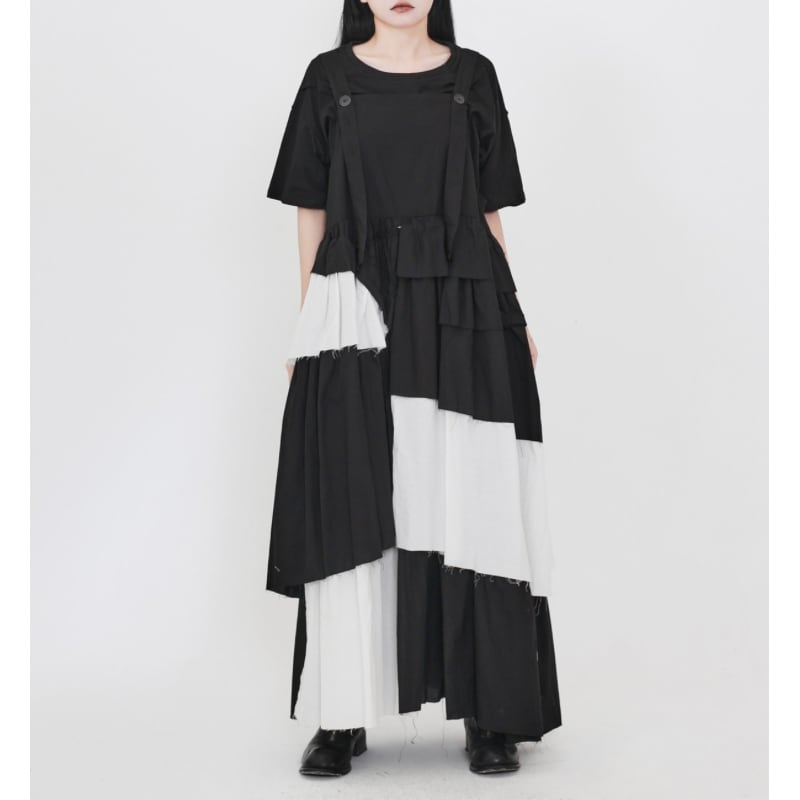 黒白の切り替えと段差のあるティアードを重ねた、アート感のあるワンピース。