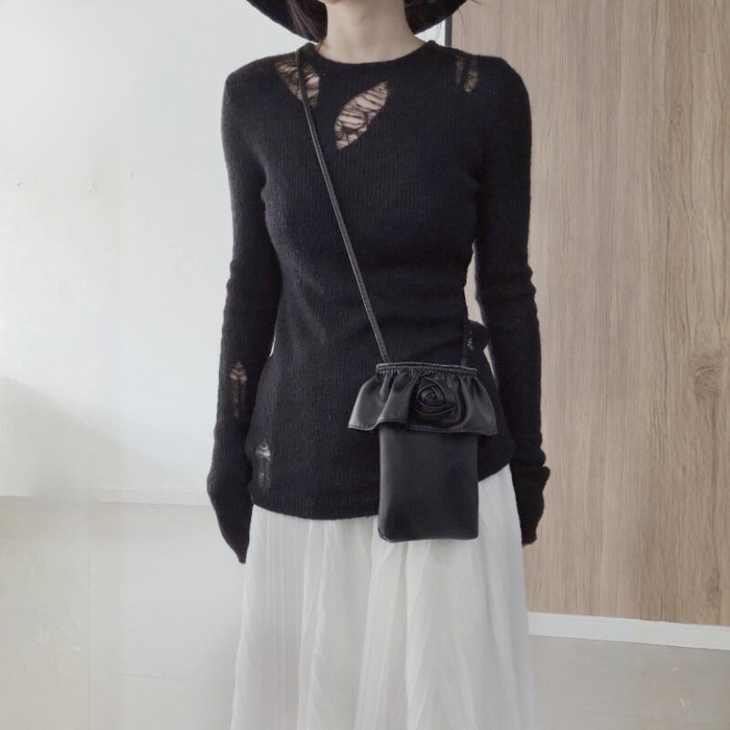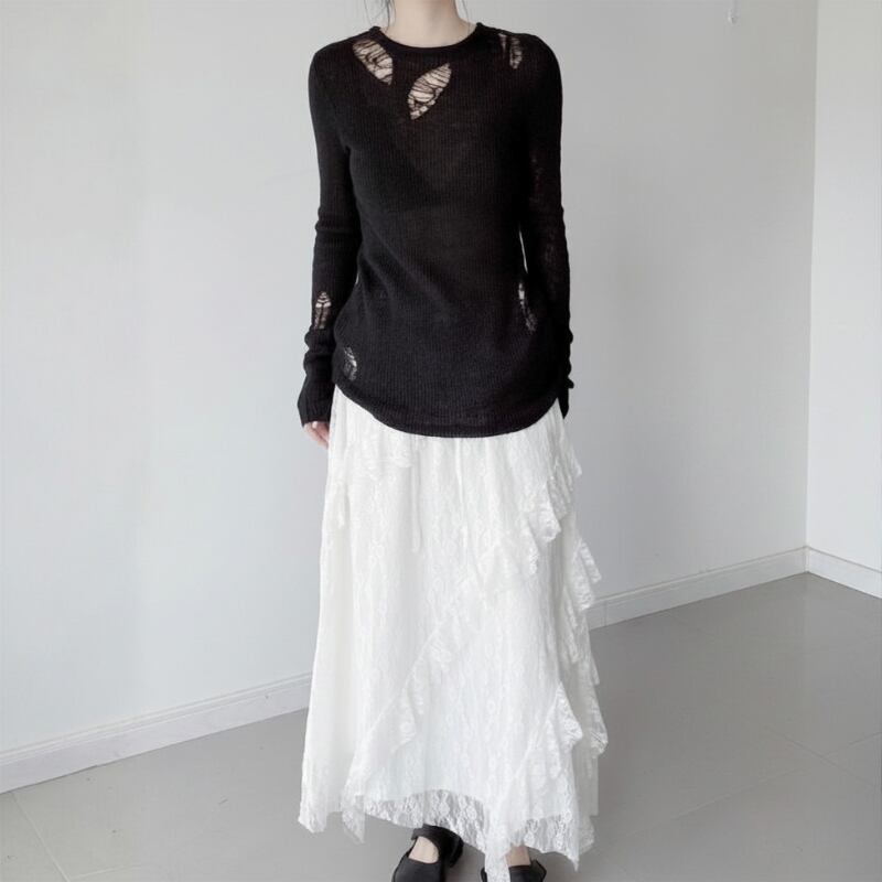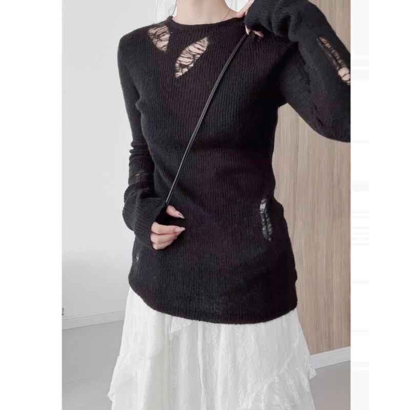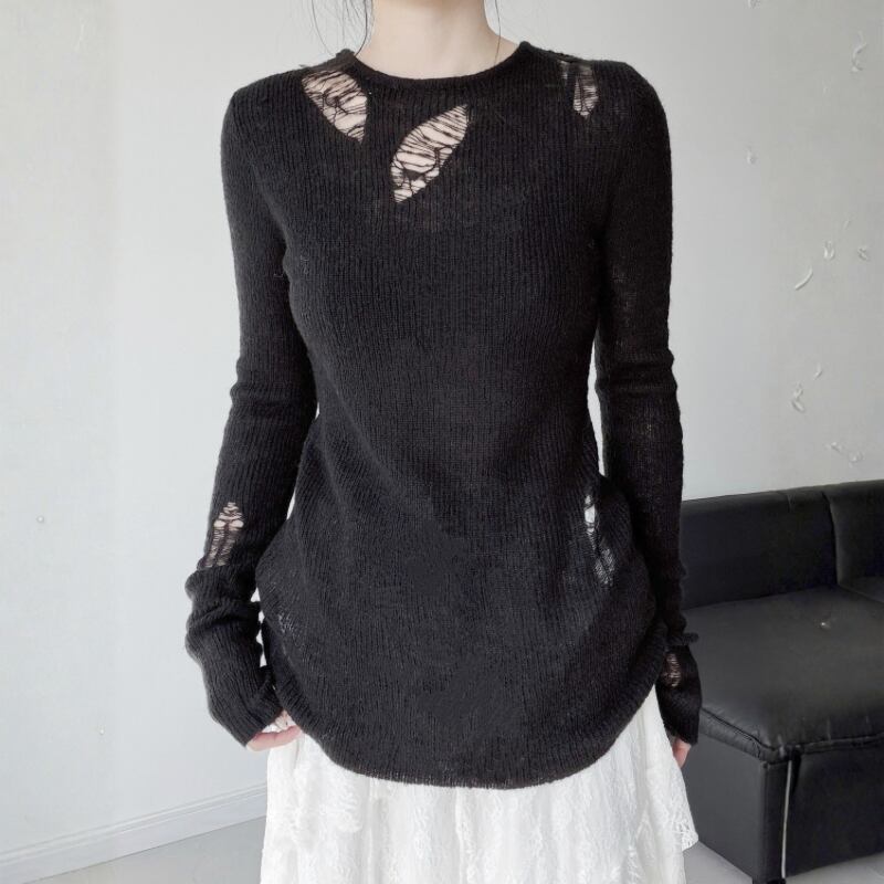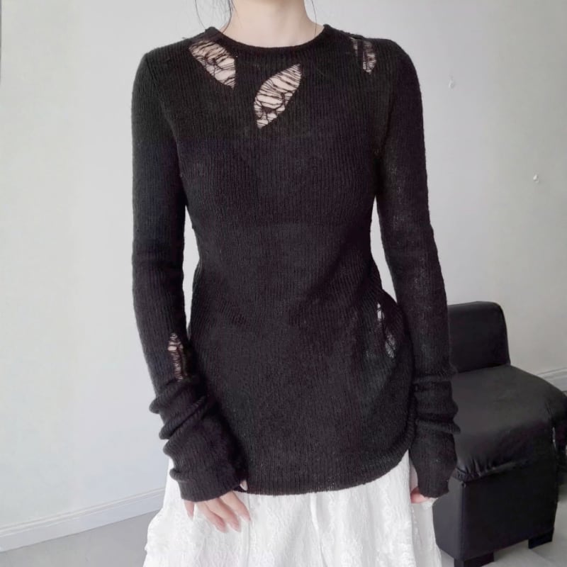 ダメージホールを配した、シアー感のあるニットトップス。