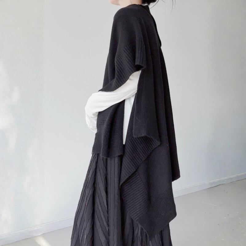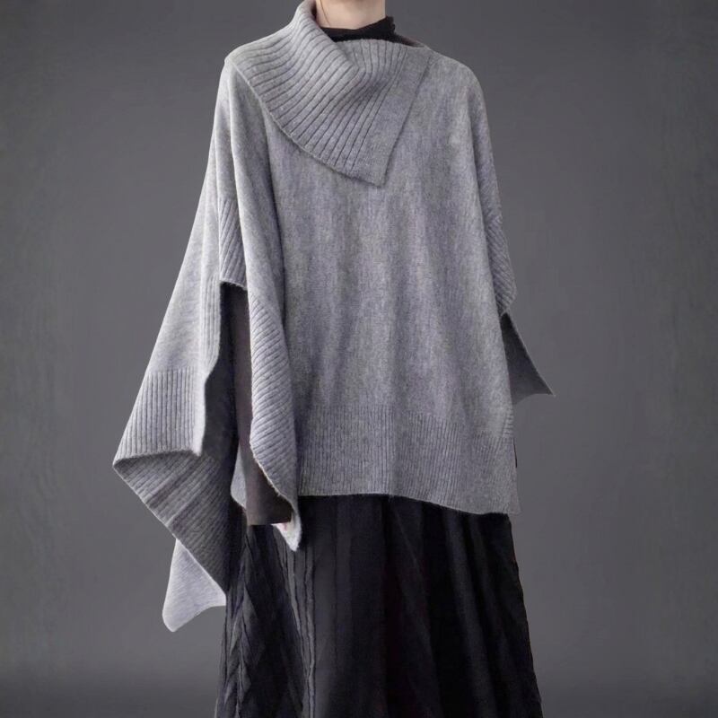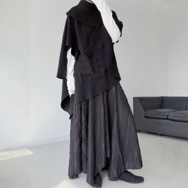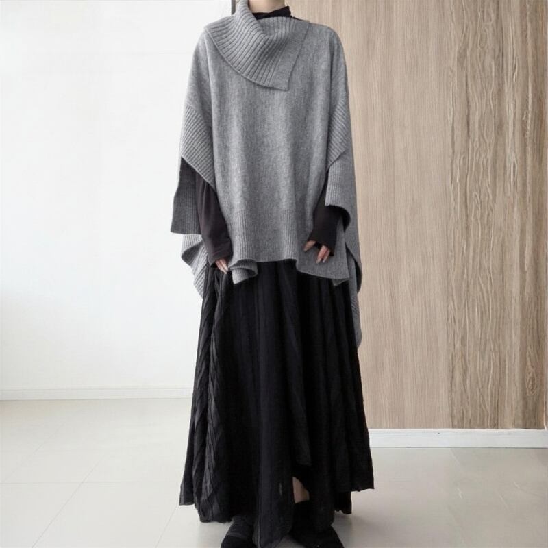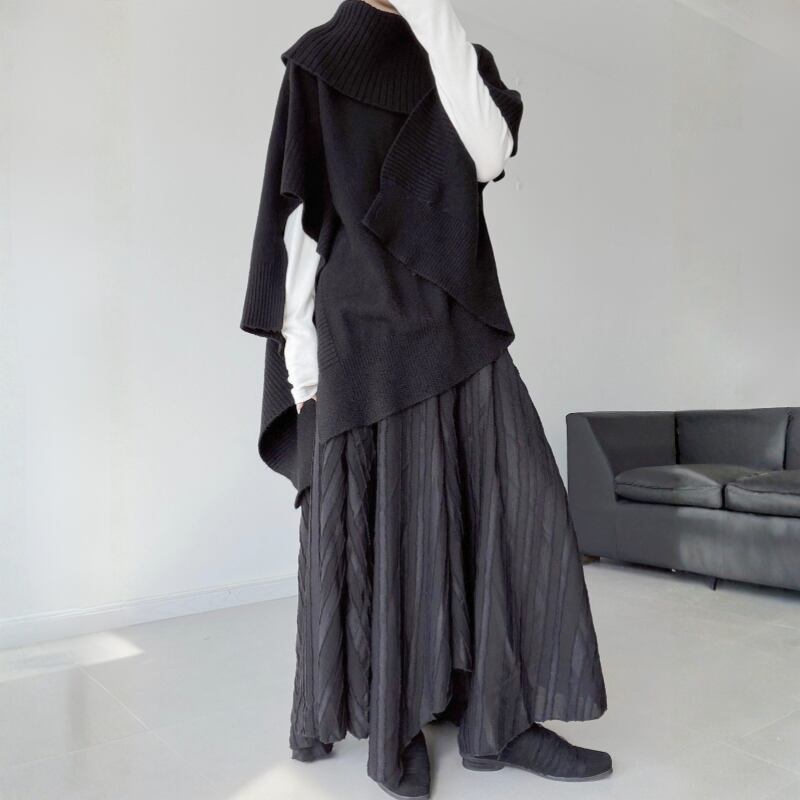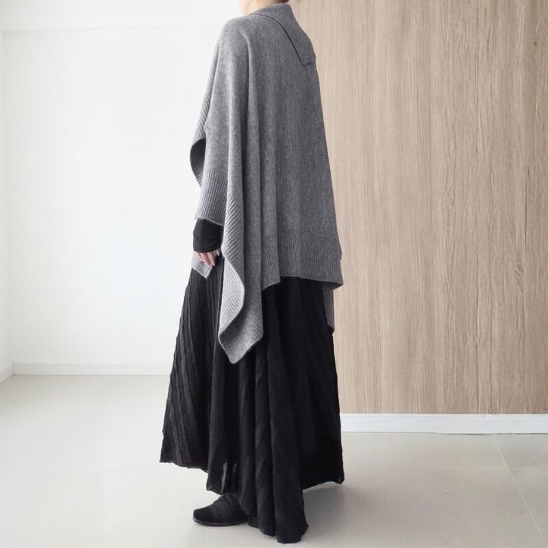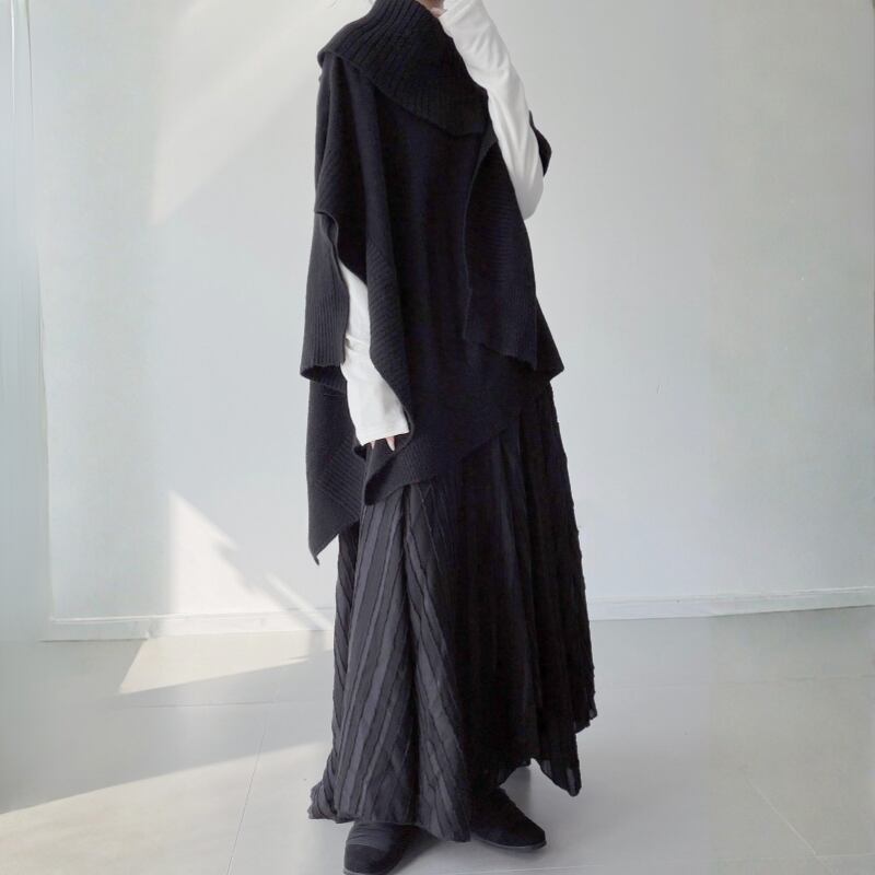 肩から裾へ落ちるアシンメトリーなラインと、広がりのあるシルエットが静かな存在感に。