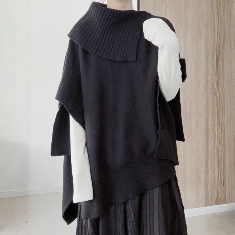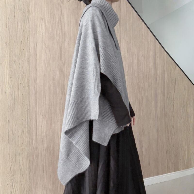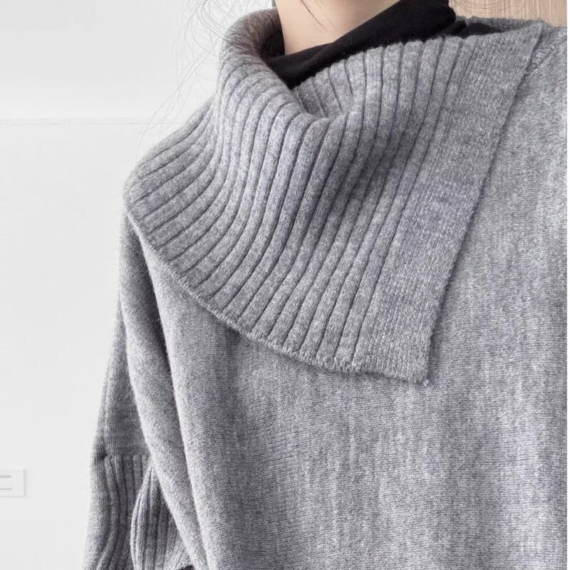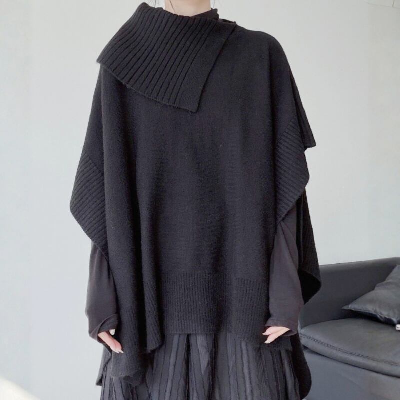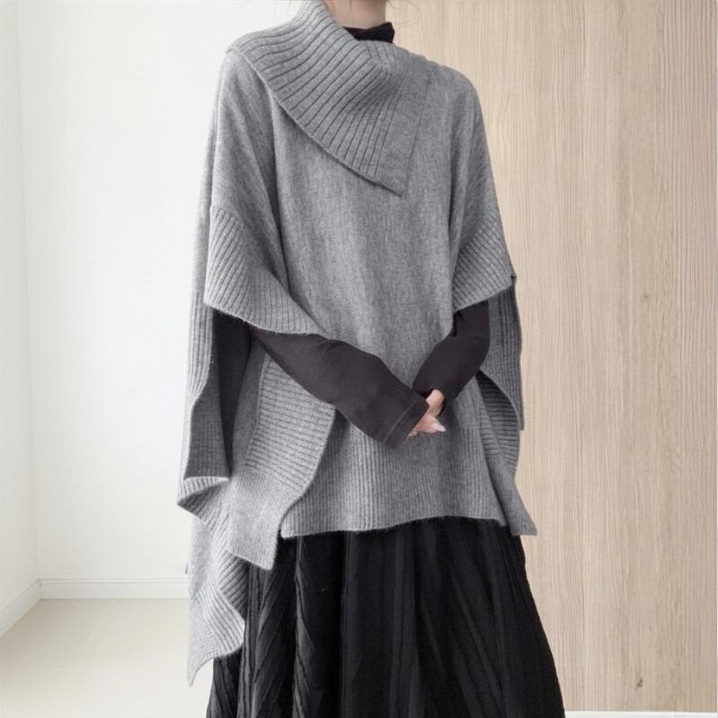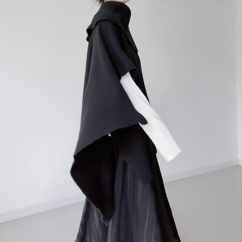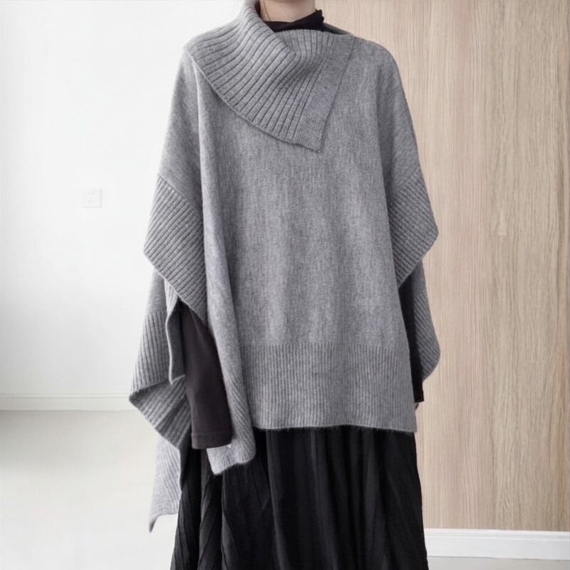 肩から裾へ落ちるアシンメトリーなラインと、広がりのあるシルエットが静かな存在感に。