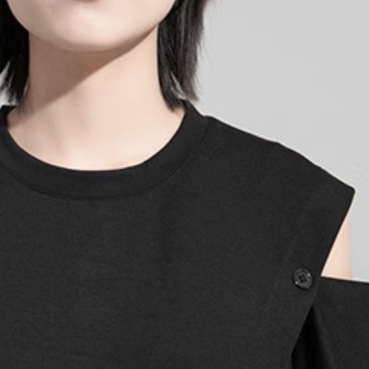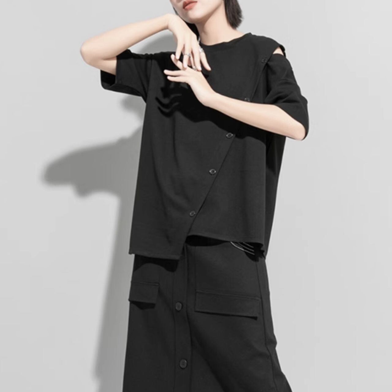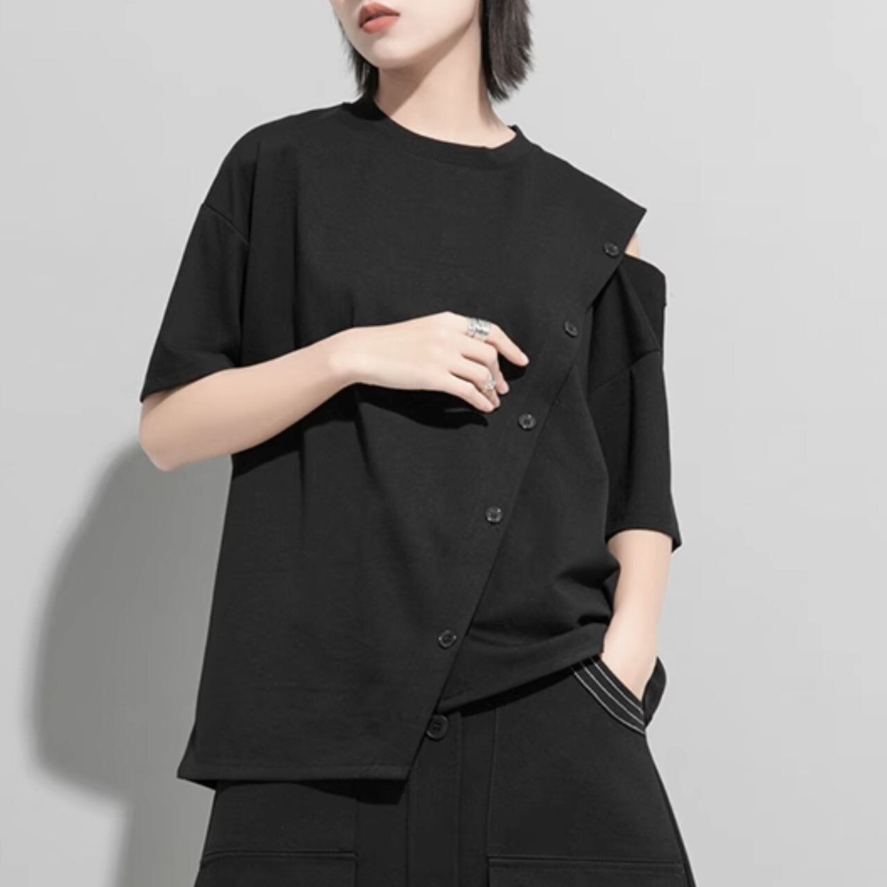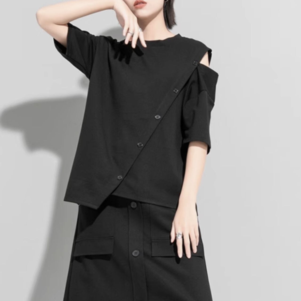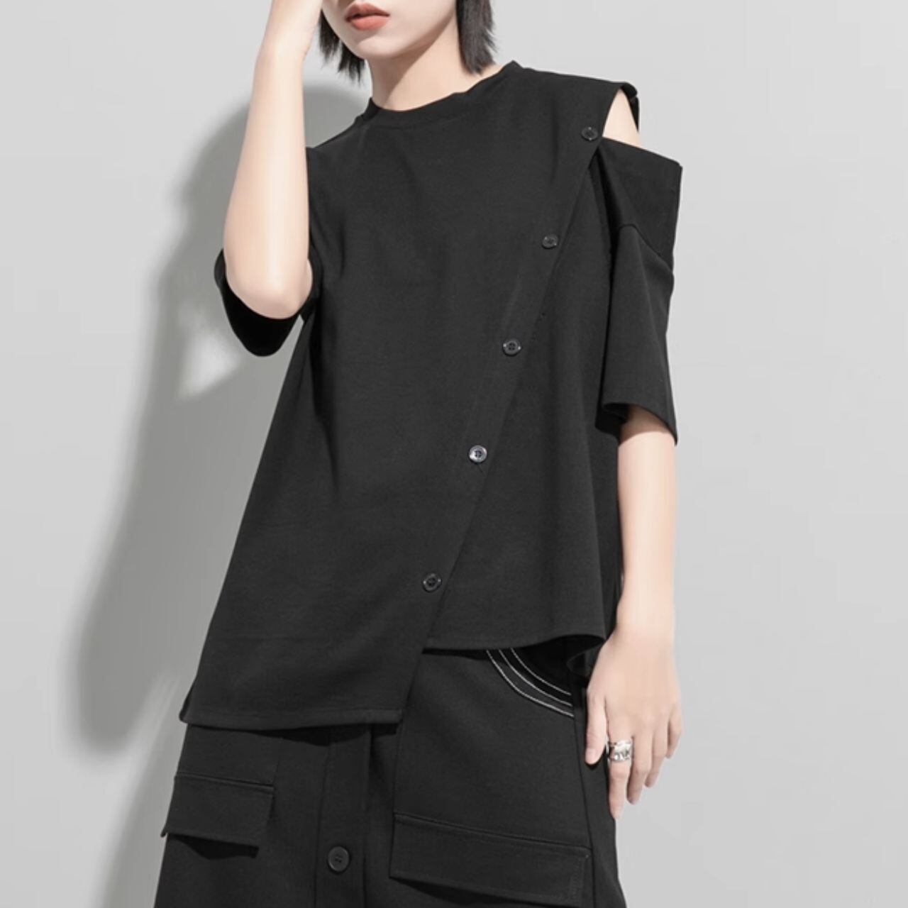 オープンショルダーとアシンメトリーデザインが特徴的なシャツ。