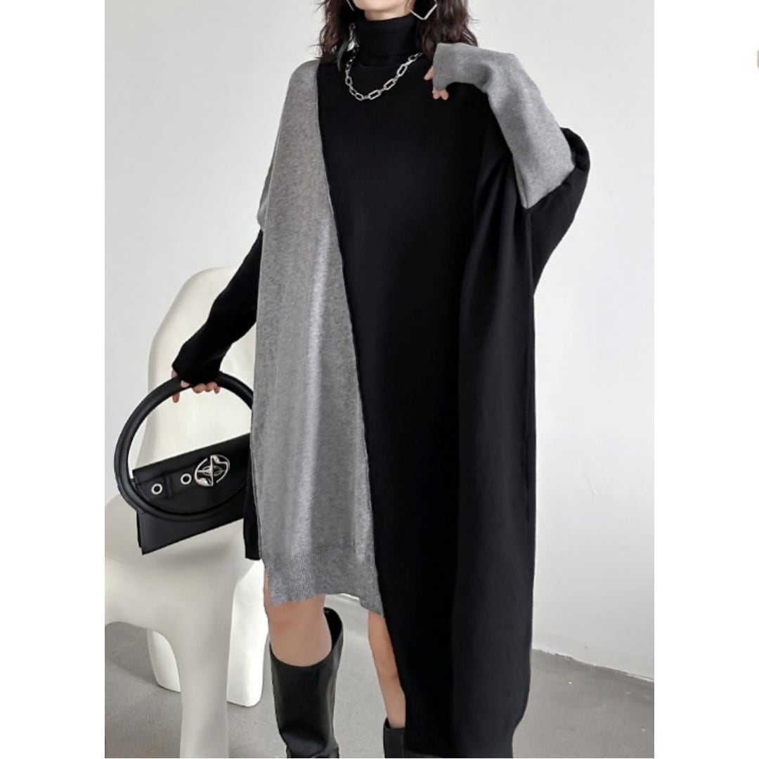 大胆なシルエットと優雅なドレープが特徴のニットワンピースです。