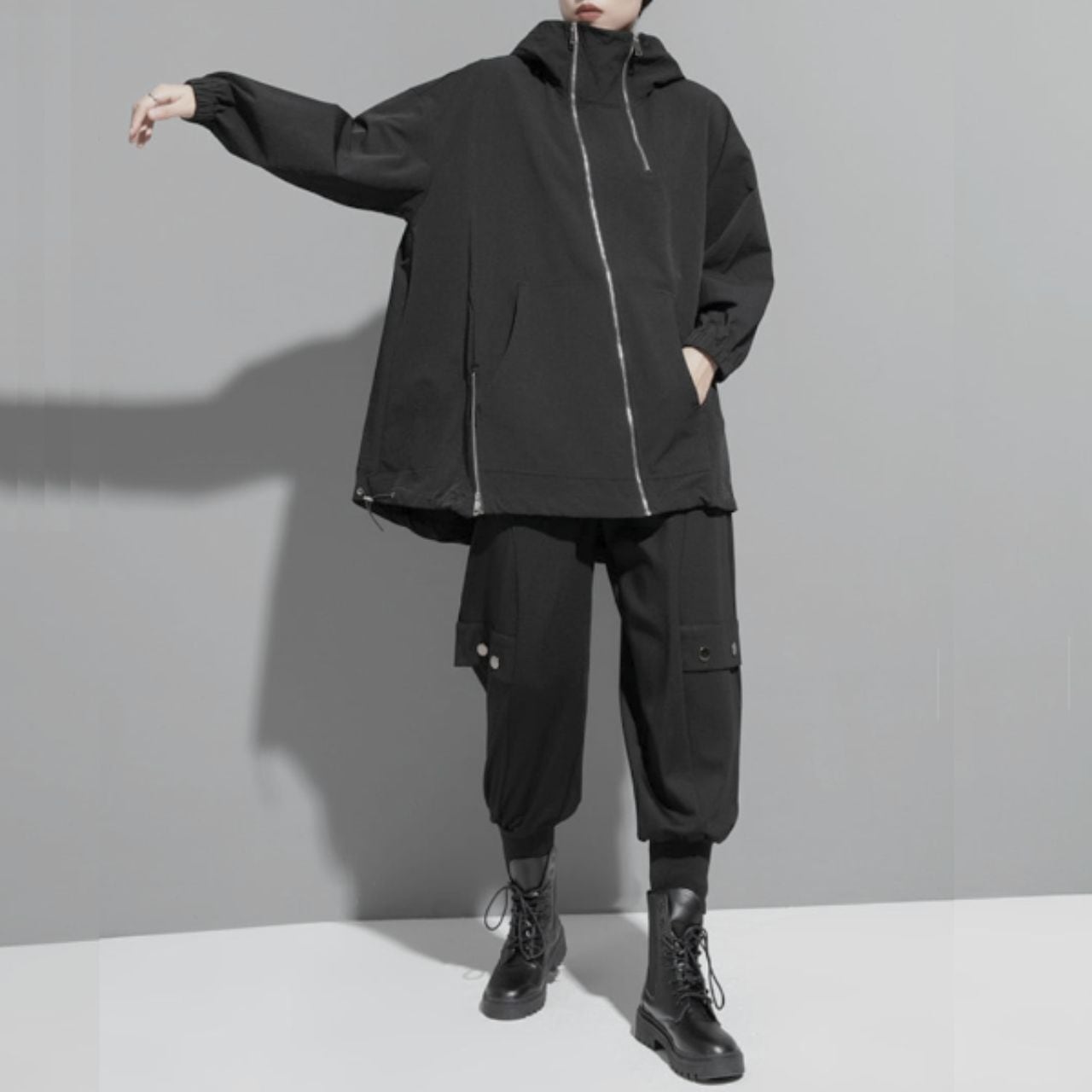 斜めジップとスタンドカラーの他にはないデザインが、お洒落映えを惹き立てます。