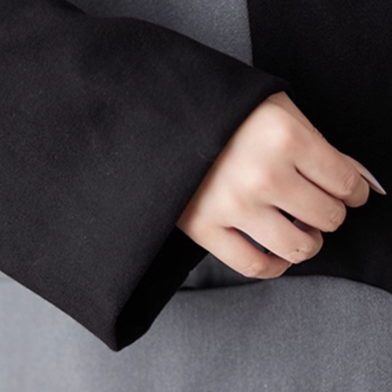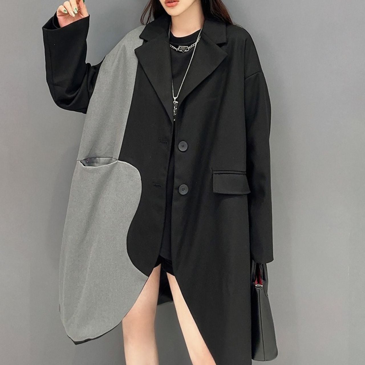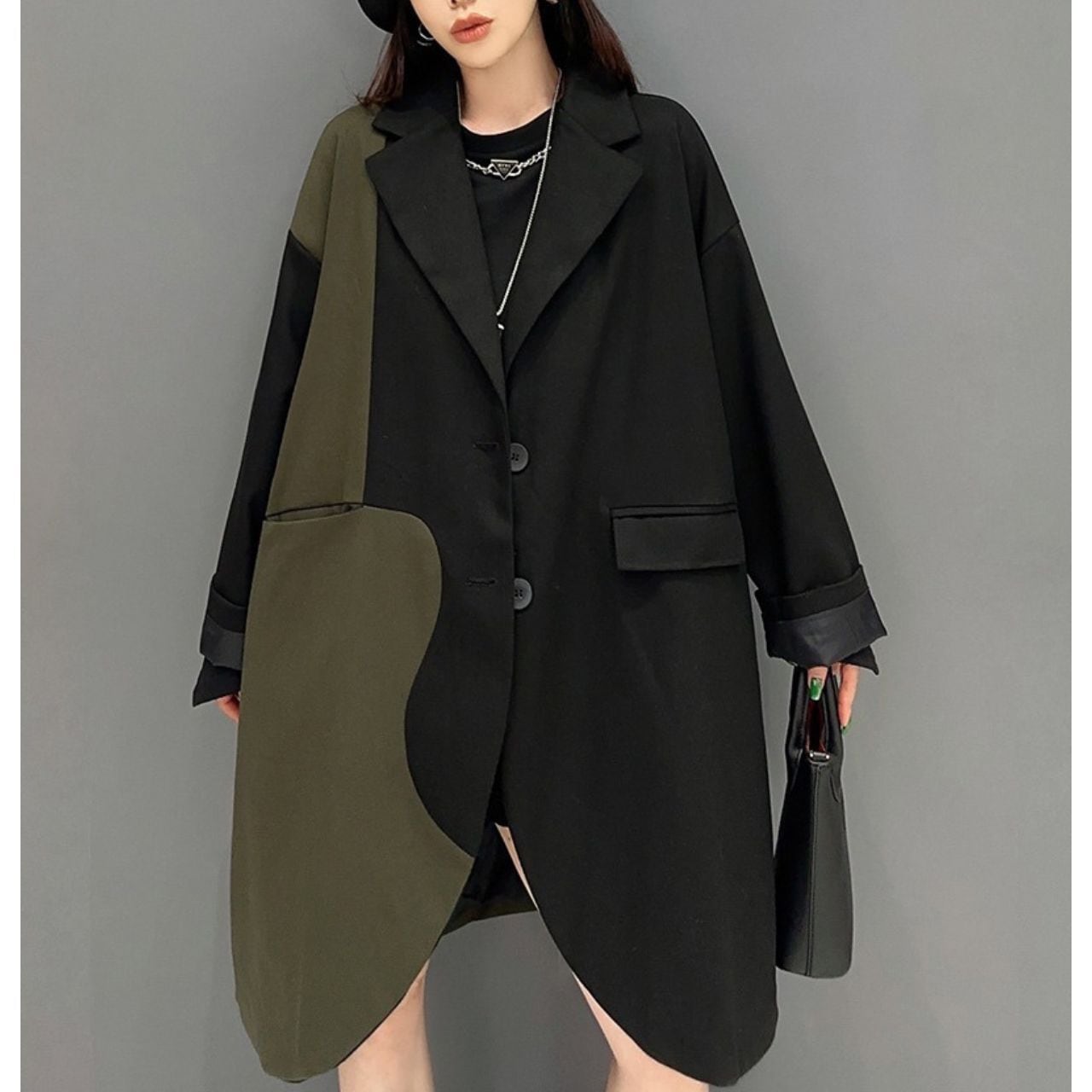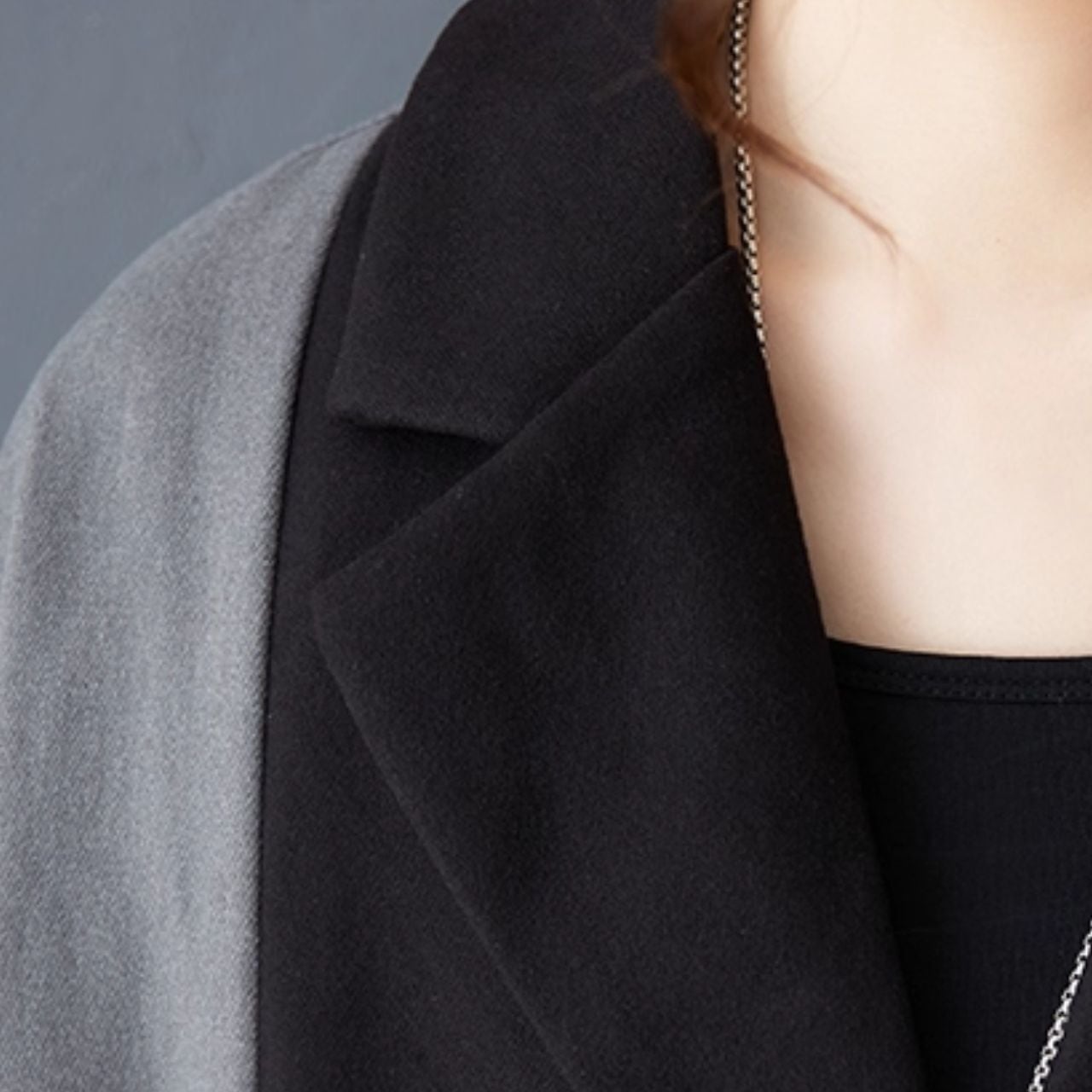 大胆に切り替わるツートーンデザインが印象的なコート。