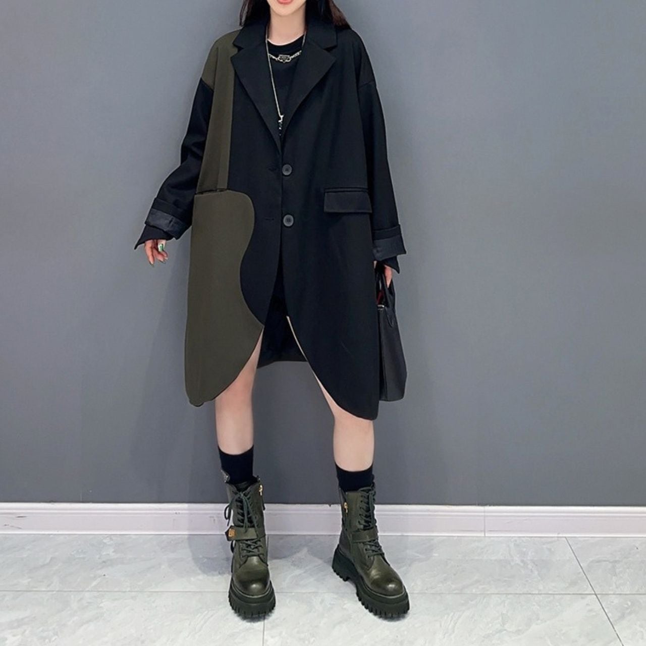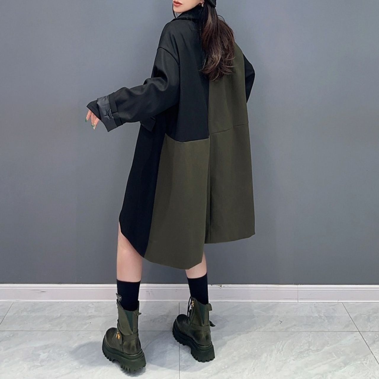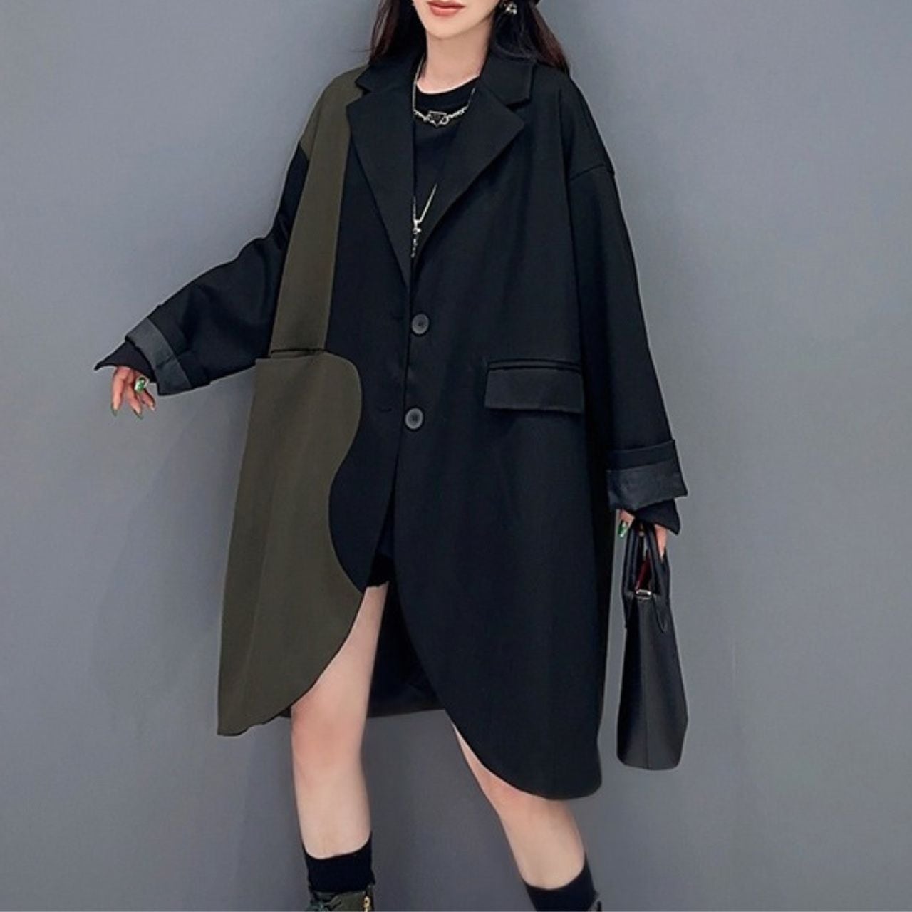 大胆に切り替わるツートーンデザインが印象的なコート。