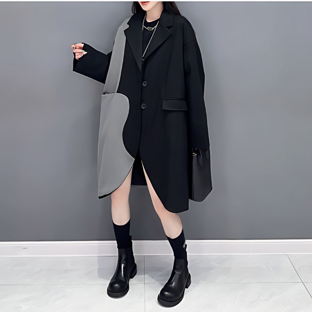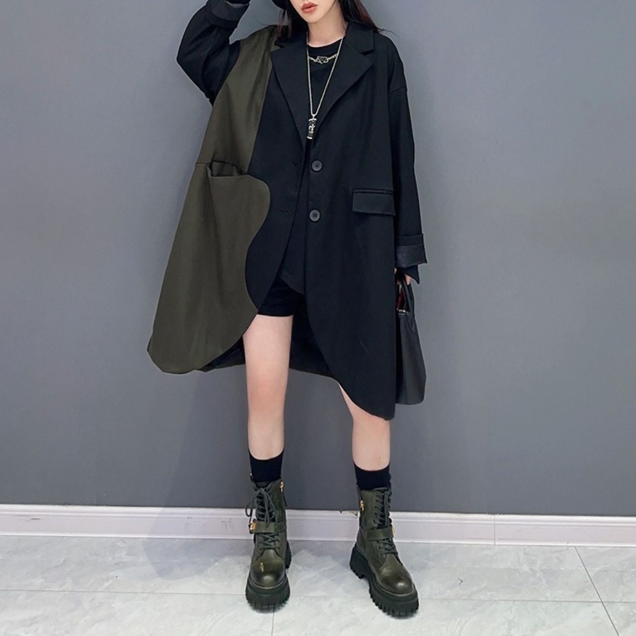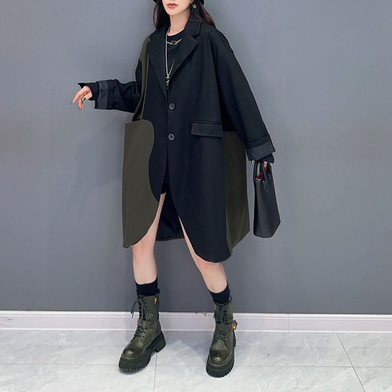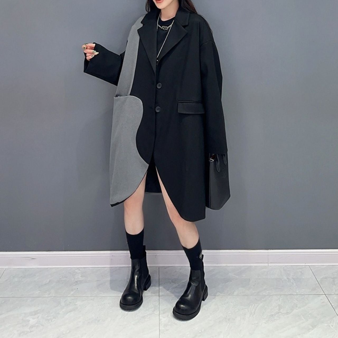 大胆に切り替わるツートーンデザインが印象的なコート。