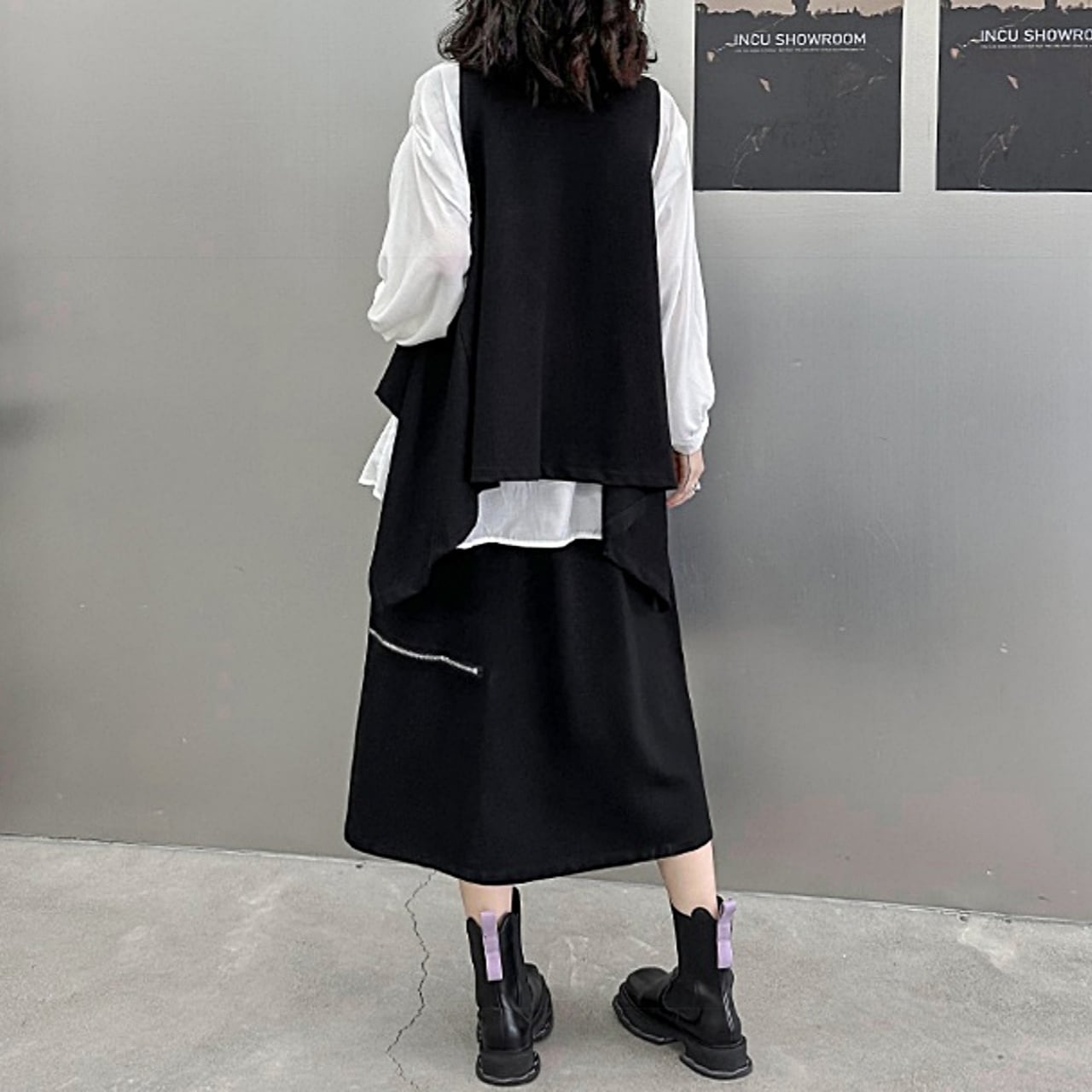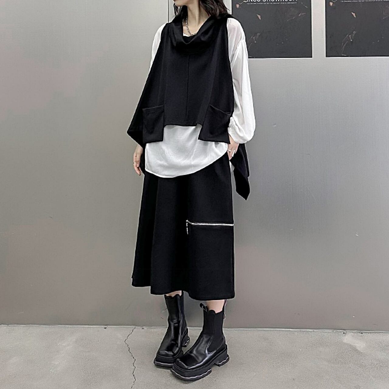 アシンメトリーデザインと裾のポケットが特徴で、洗練されたスタイリングを演出。