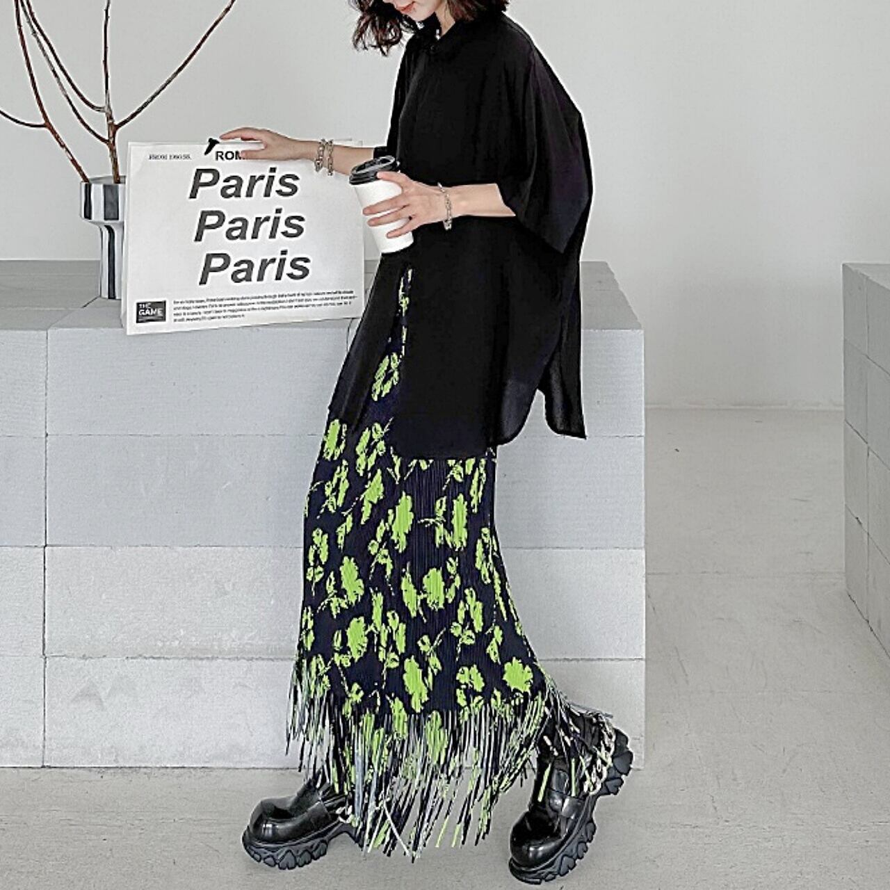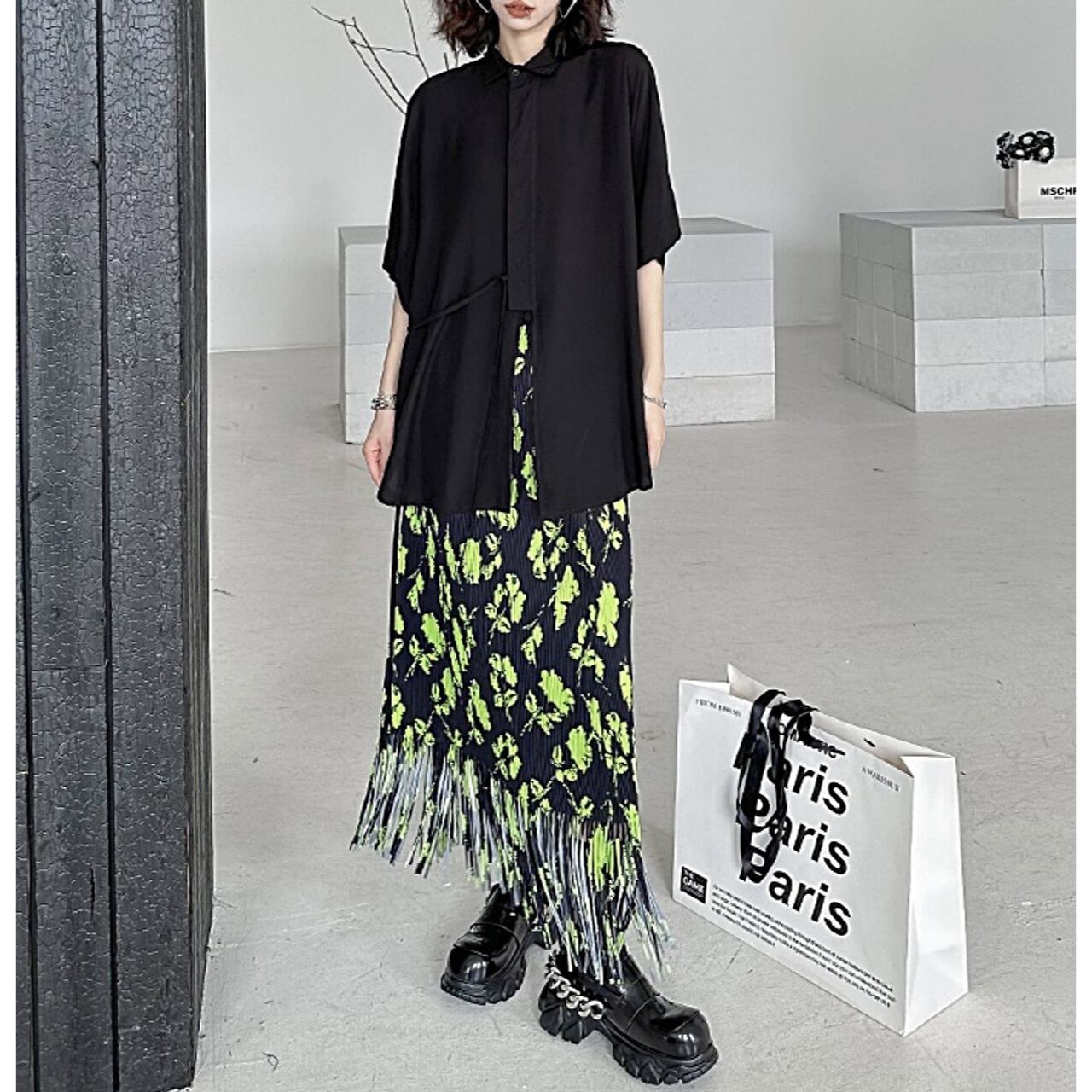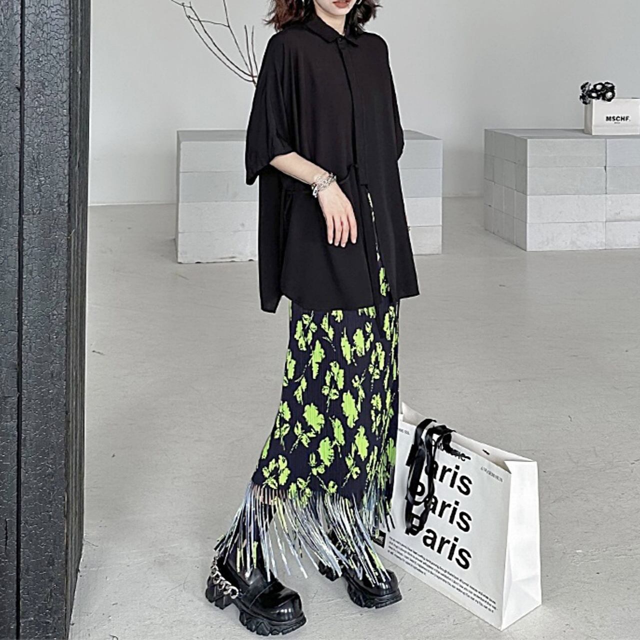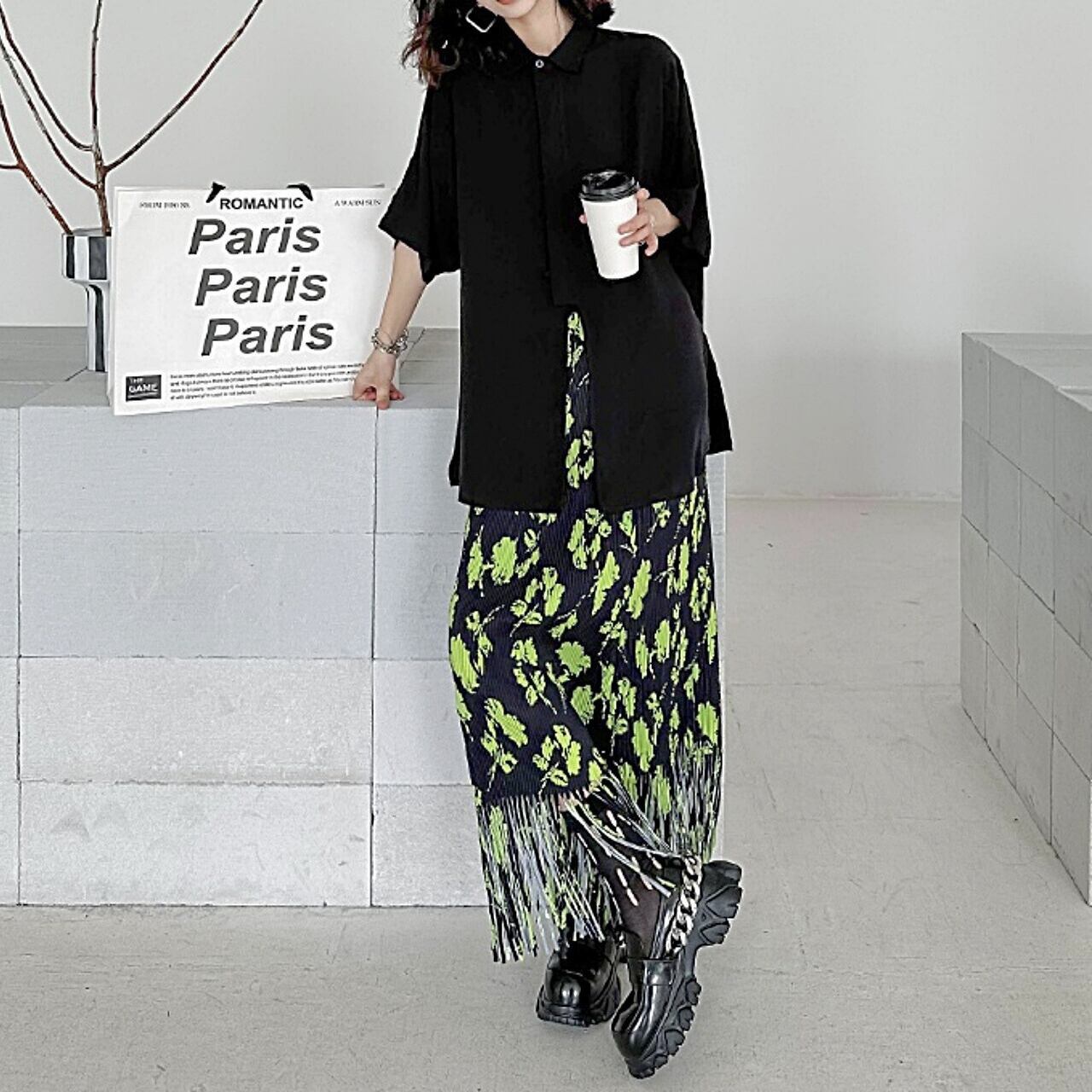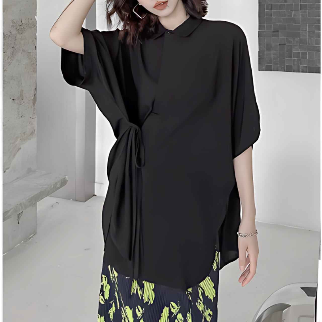 たっぷりとしたドレープが美しい、オーバーサイズのブラックシャツ。