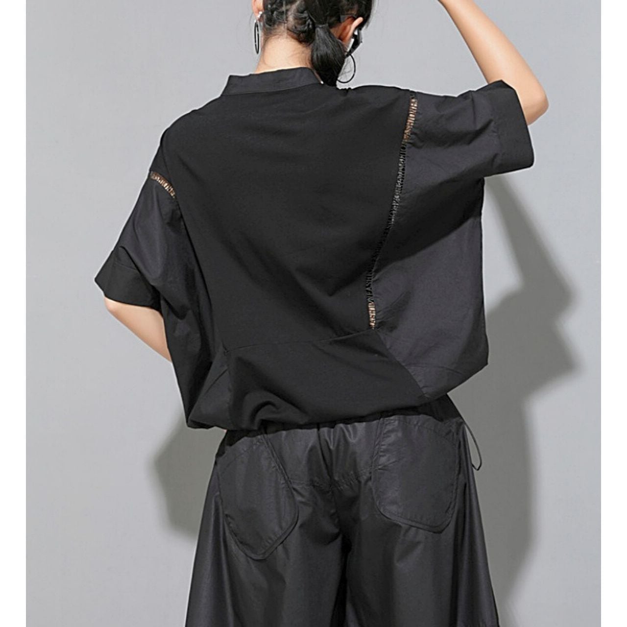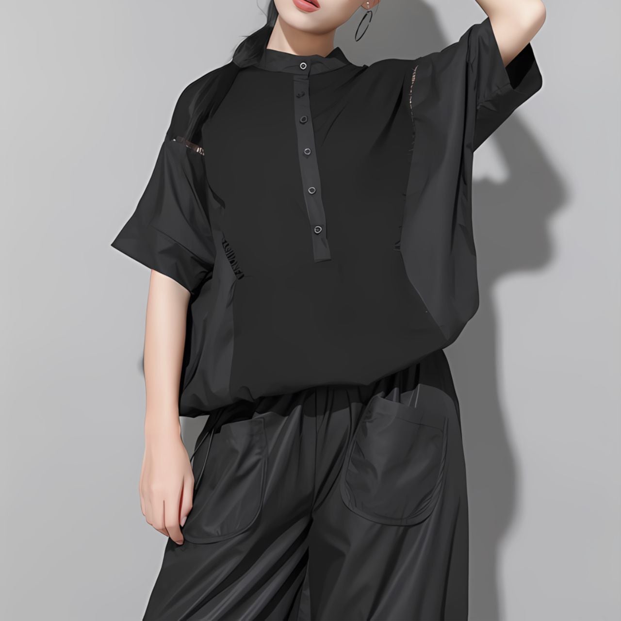ボタンが特徴のスタンドカラーが印象的なトップス