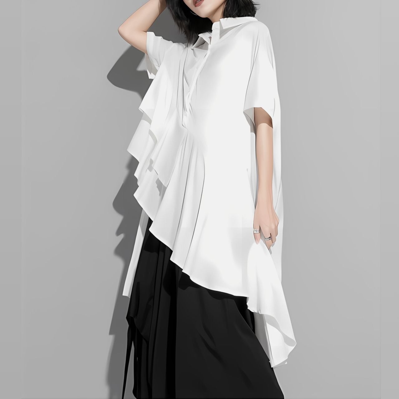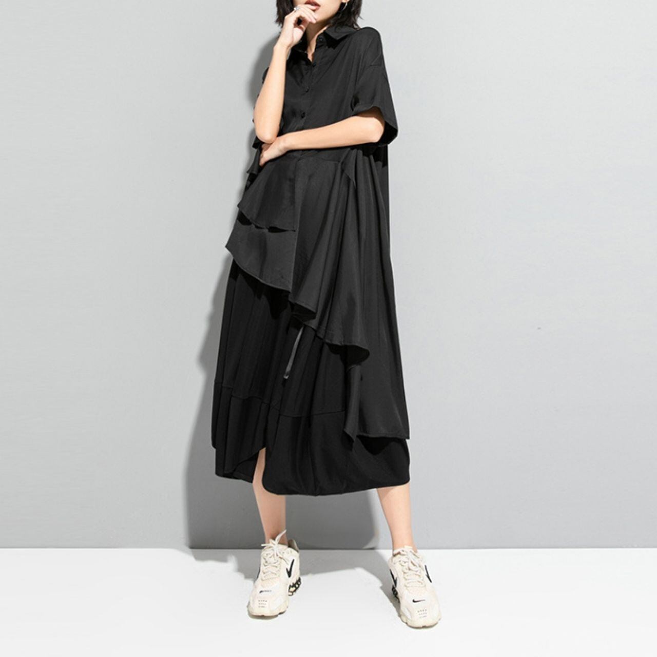 ミッドレングスのシルエットは、体型をカバーしつつもスタイリッシュな印象を与えます。
