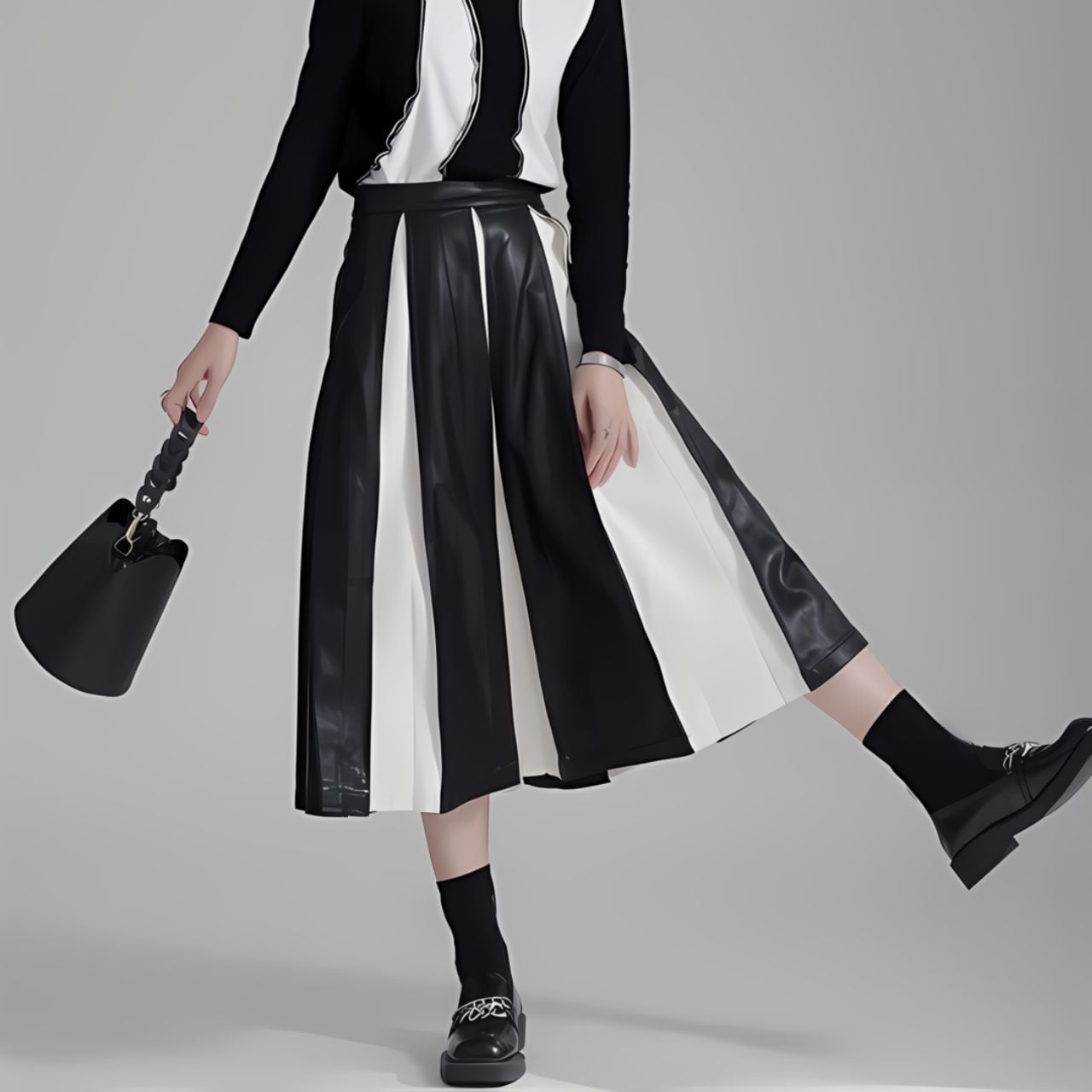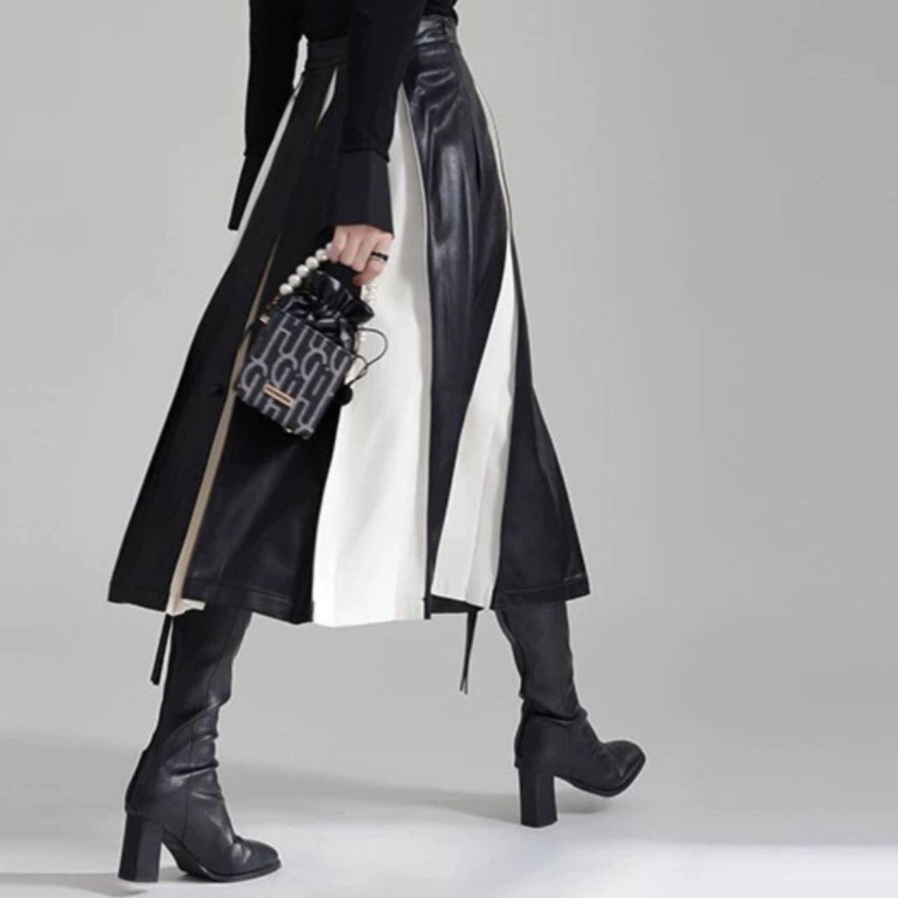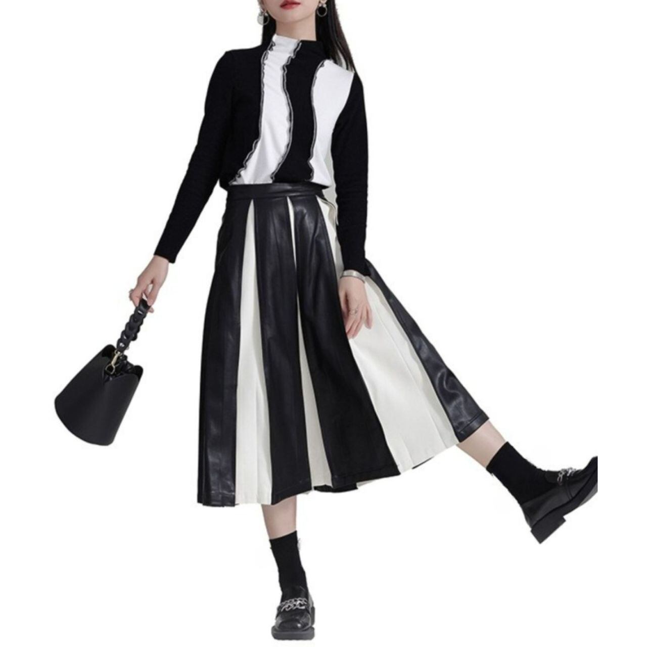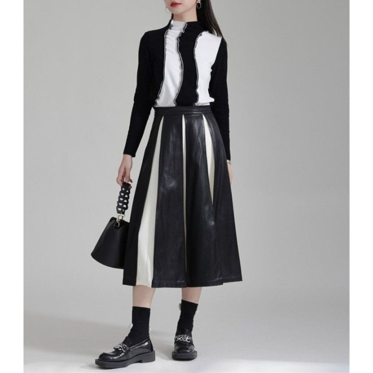 黒と白の対比が魅力的なPUレザーステッチプリーツスカート。