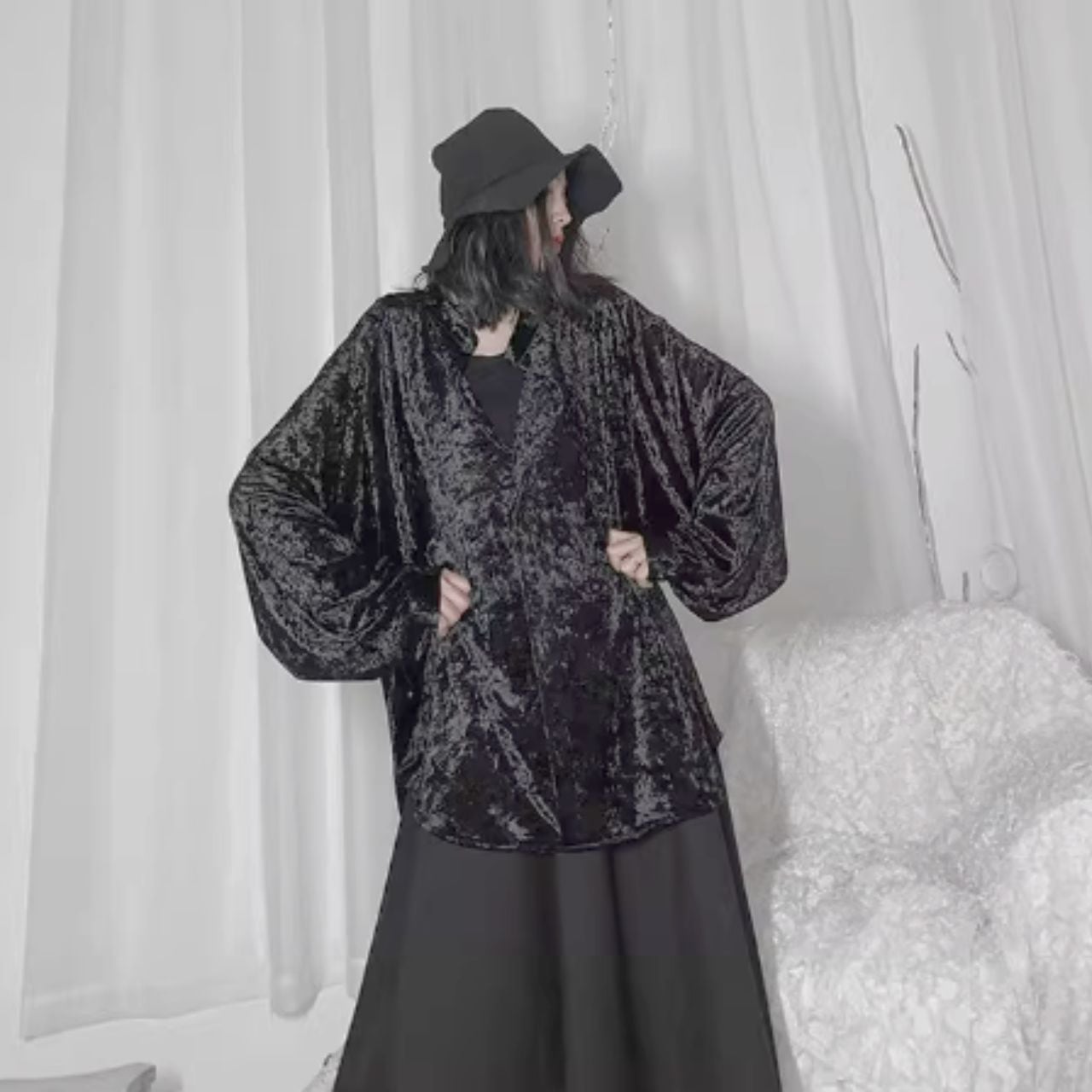ルーズなシルエットとバットスリーブが、女性らしい柔らかな雰囲気を醸し出します。