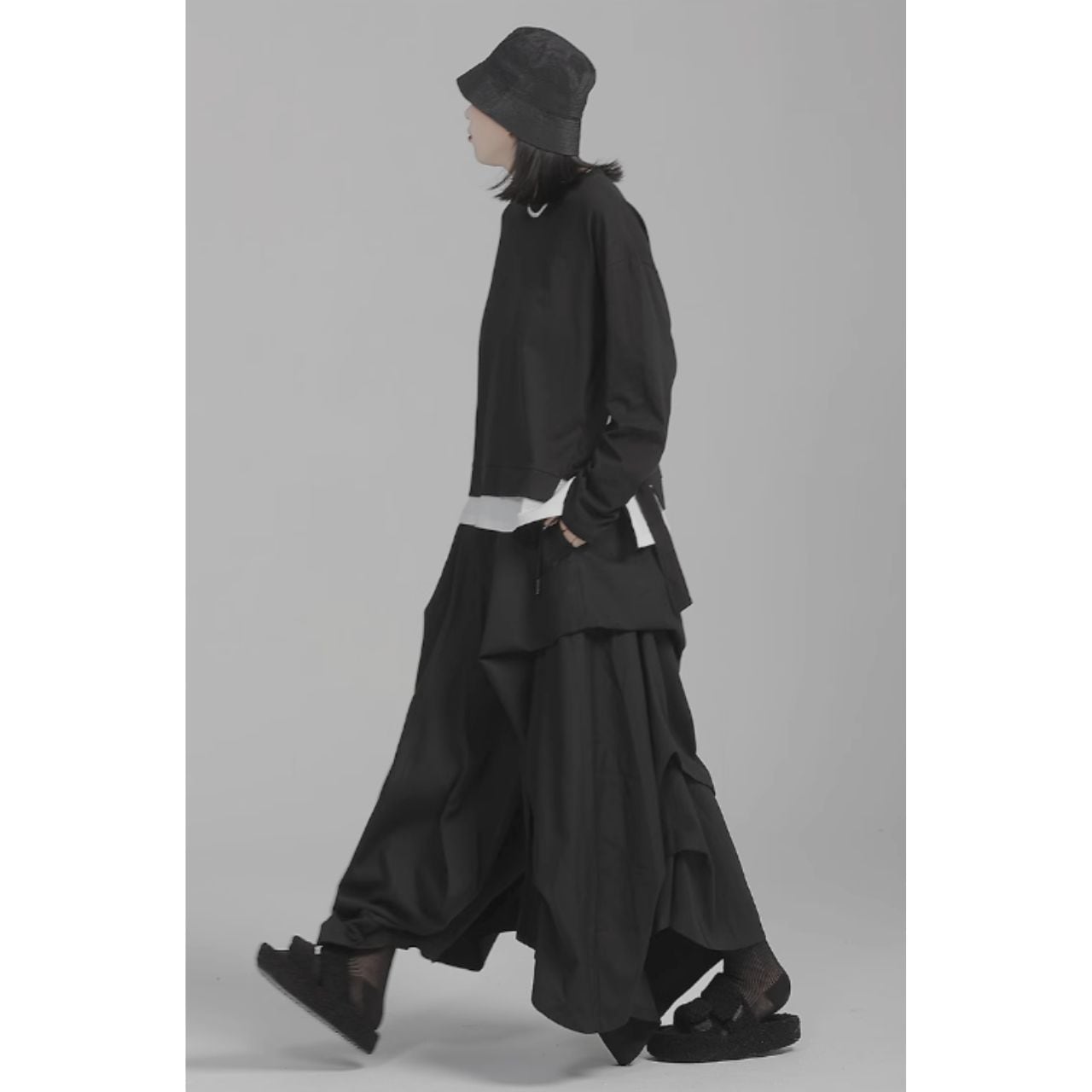 ハイウエストで足長効果抜群の不規則なワイドレッグパンツのルーズキュロット。