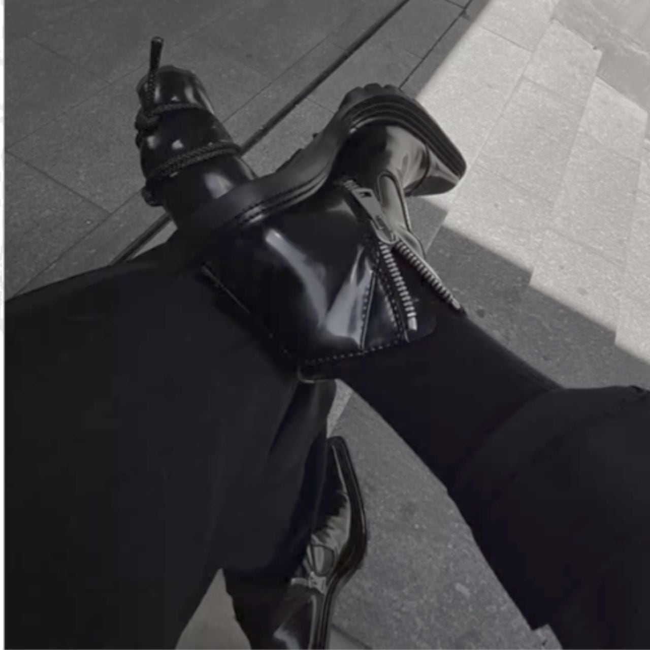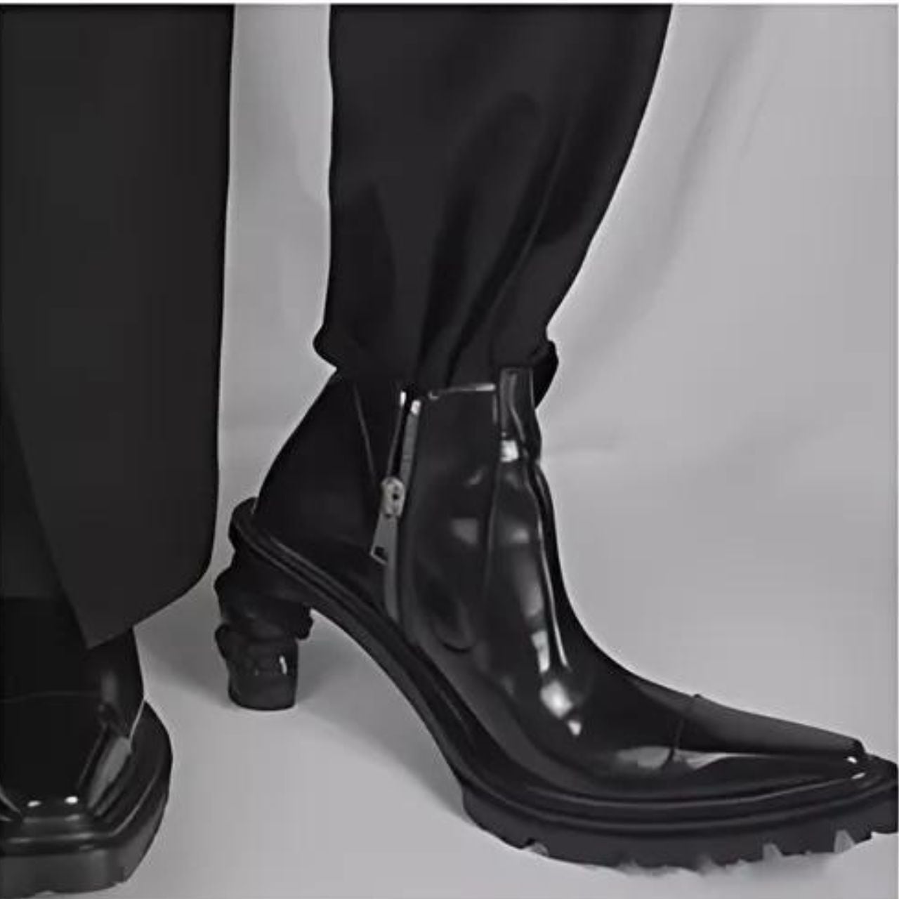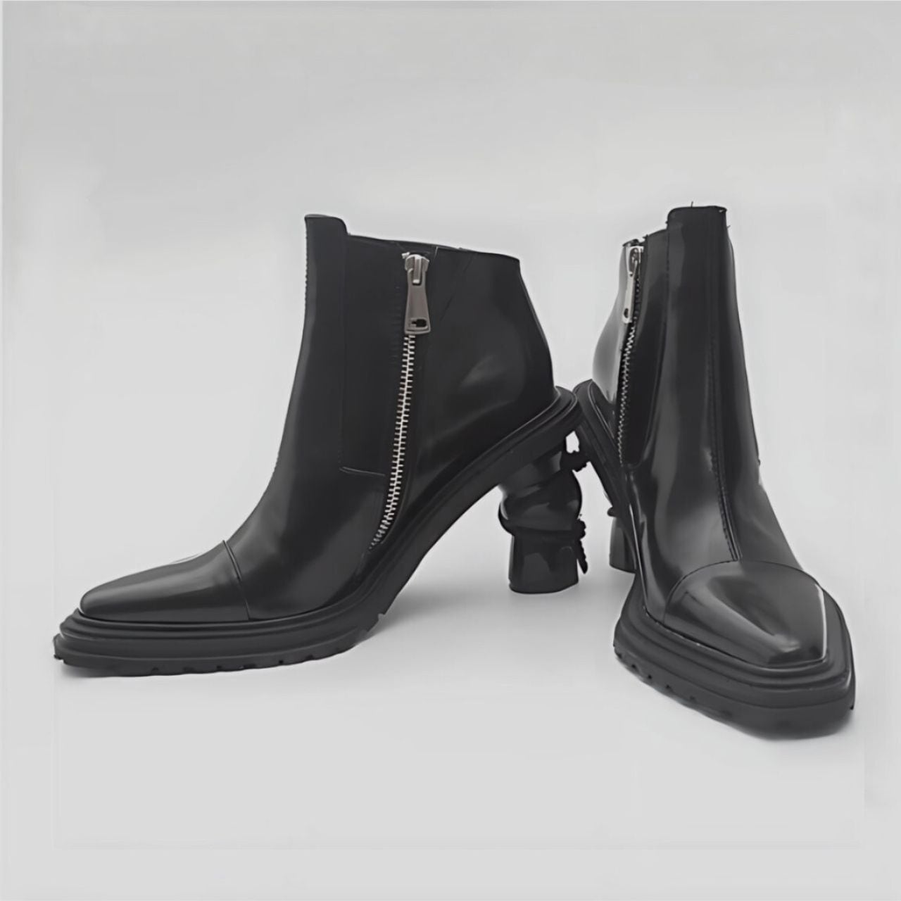 ユニークなヒールデザインが特徴のアンクルブーツ。