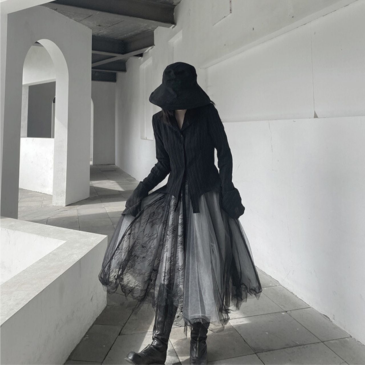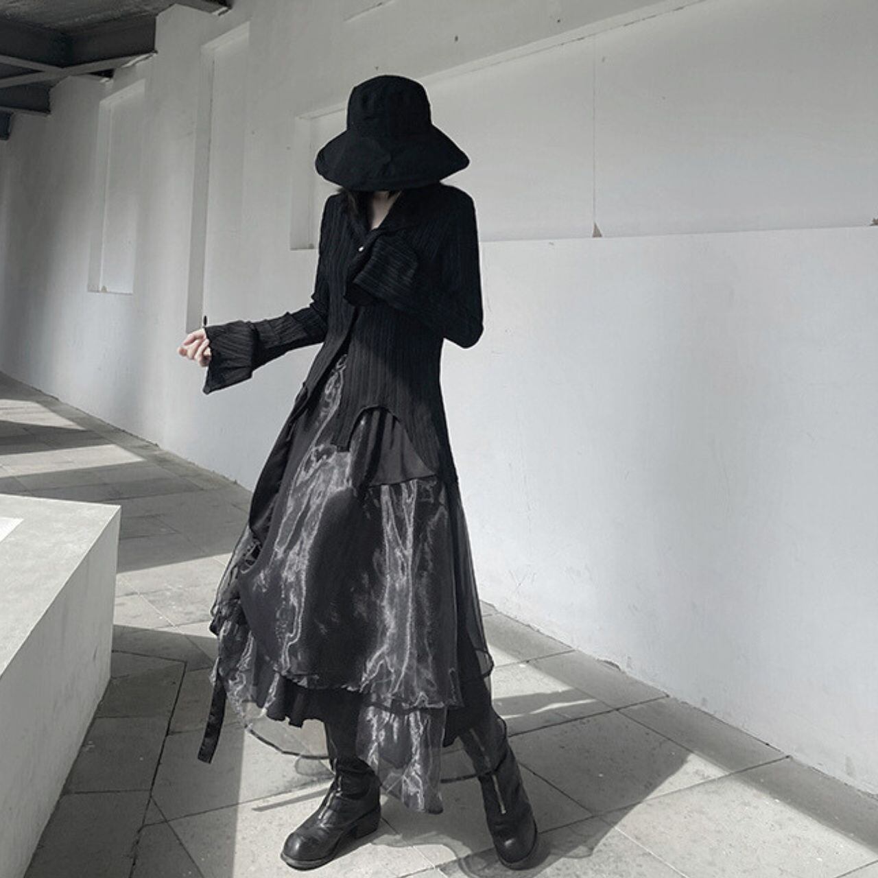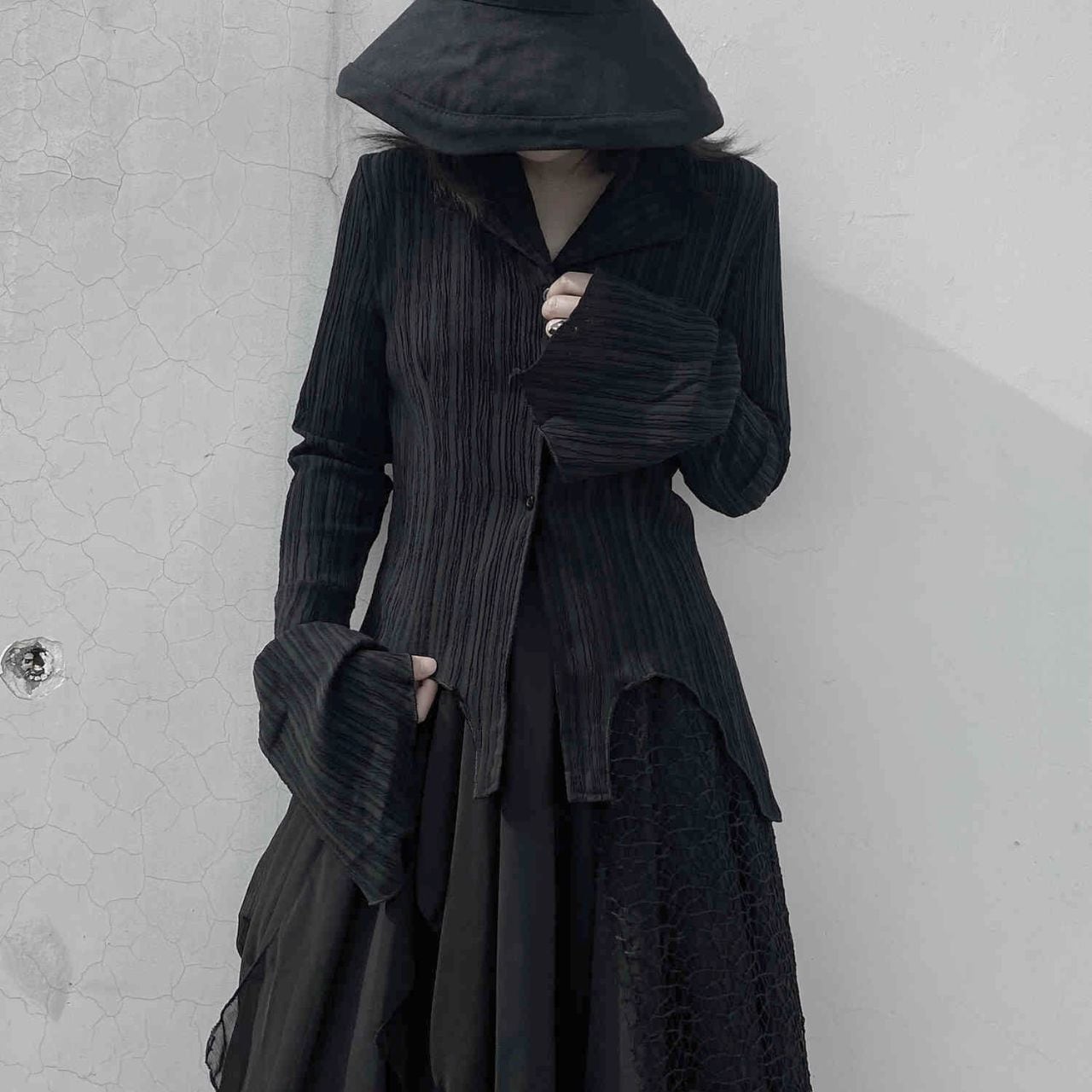 トランペットスリーブが女性らしい印象を与え、スタイリッシュな着こなしを演出します。