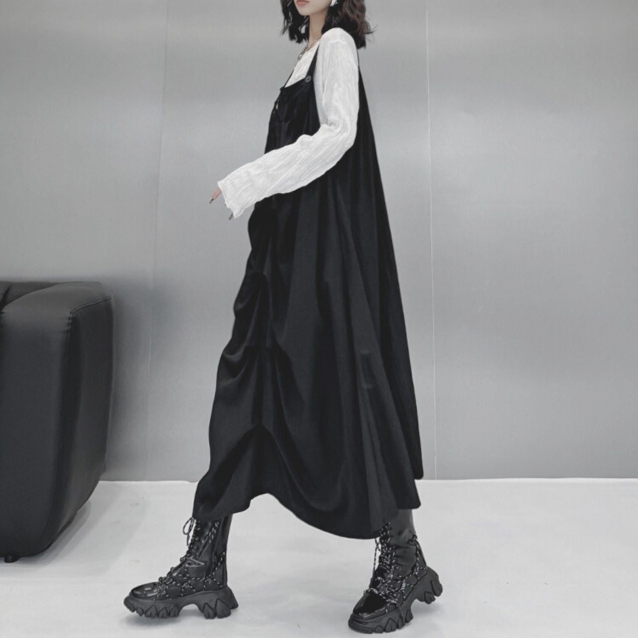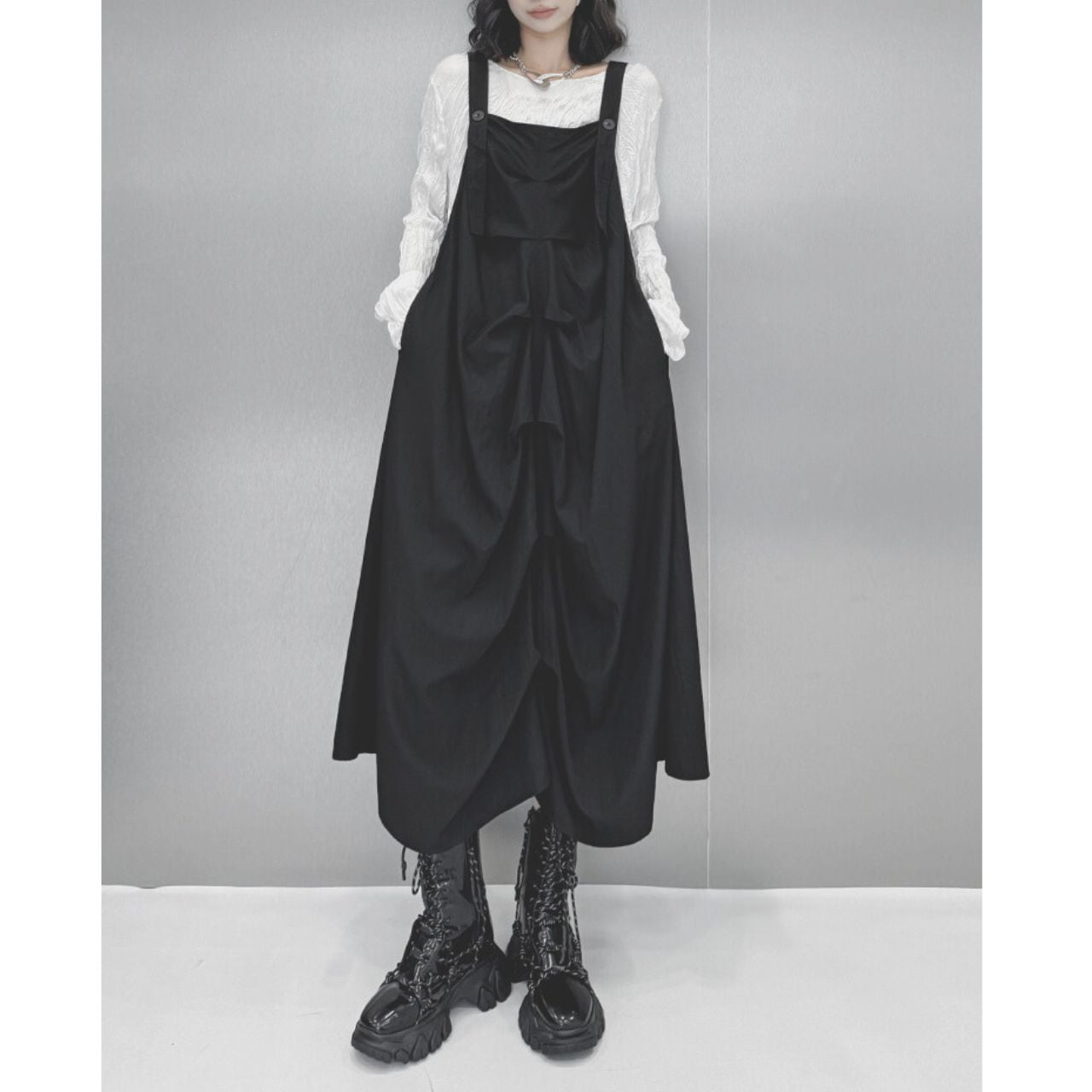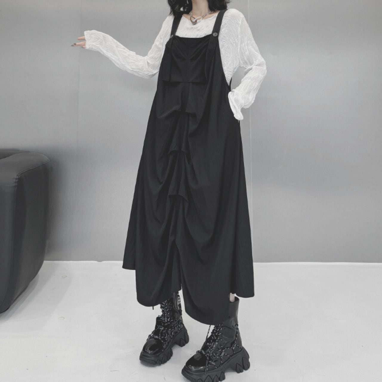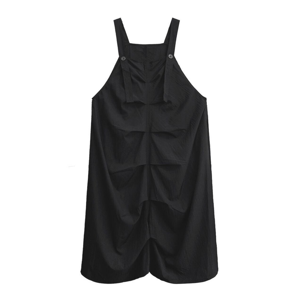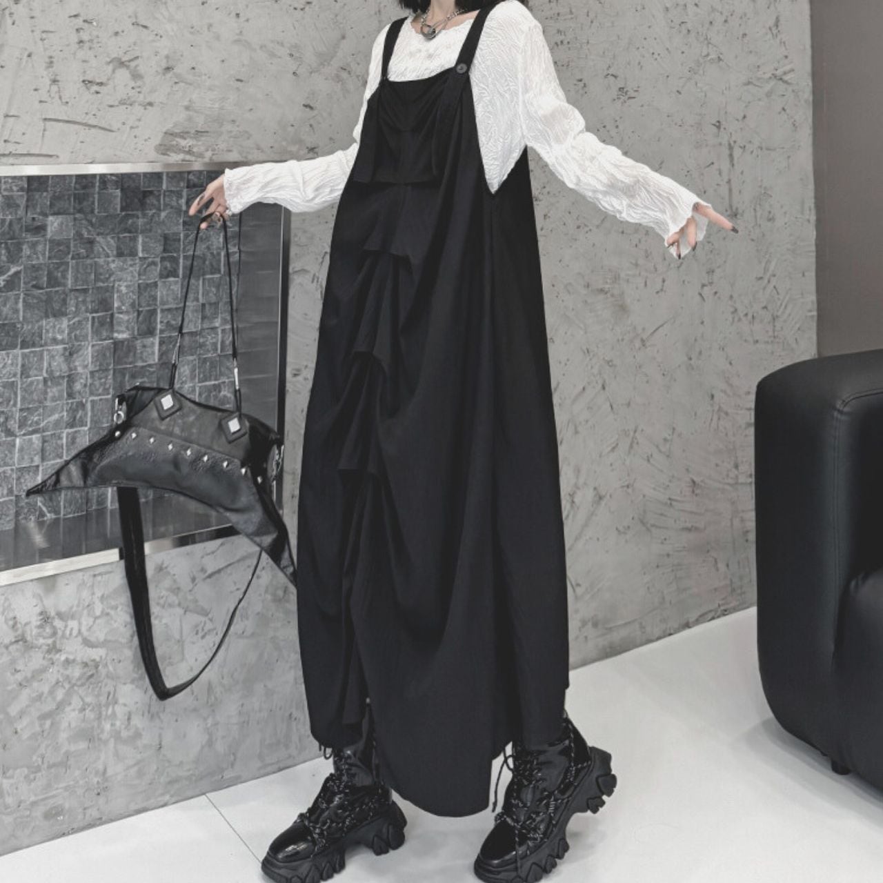 ユニークなデザインとサスペンダーが特徴的で、モード感とカジュアルさを兼ね備えたアイテムとなっています。
