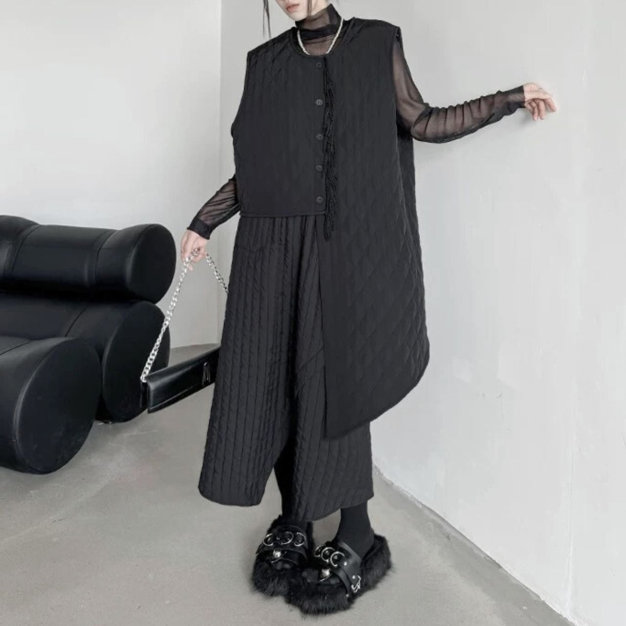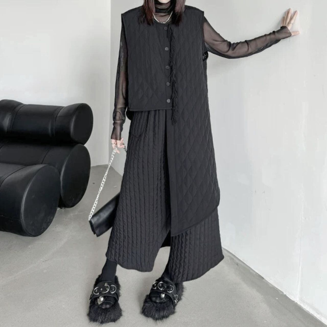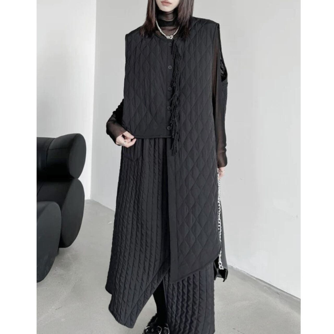 ファッション性と機能性を兼ね備えたアシンメトリーキルティングベスト。