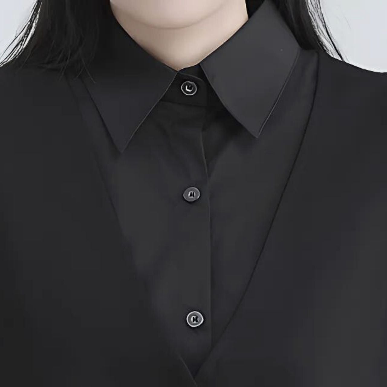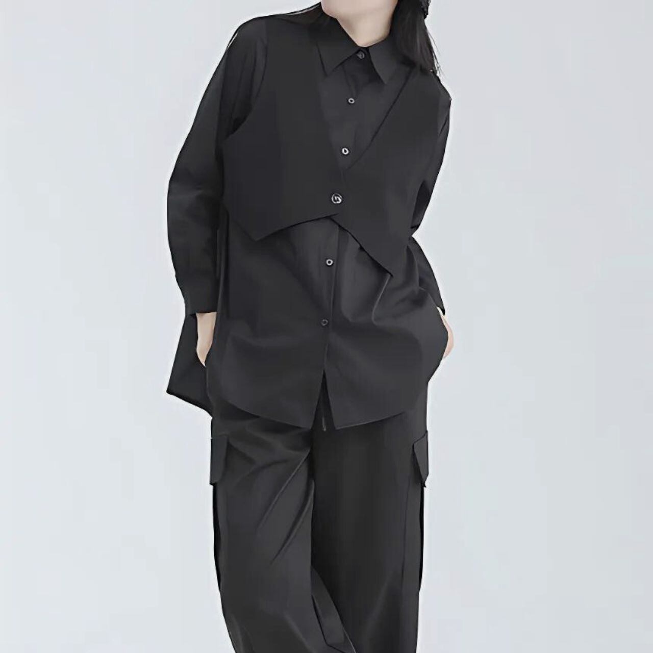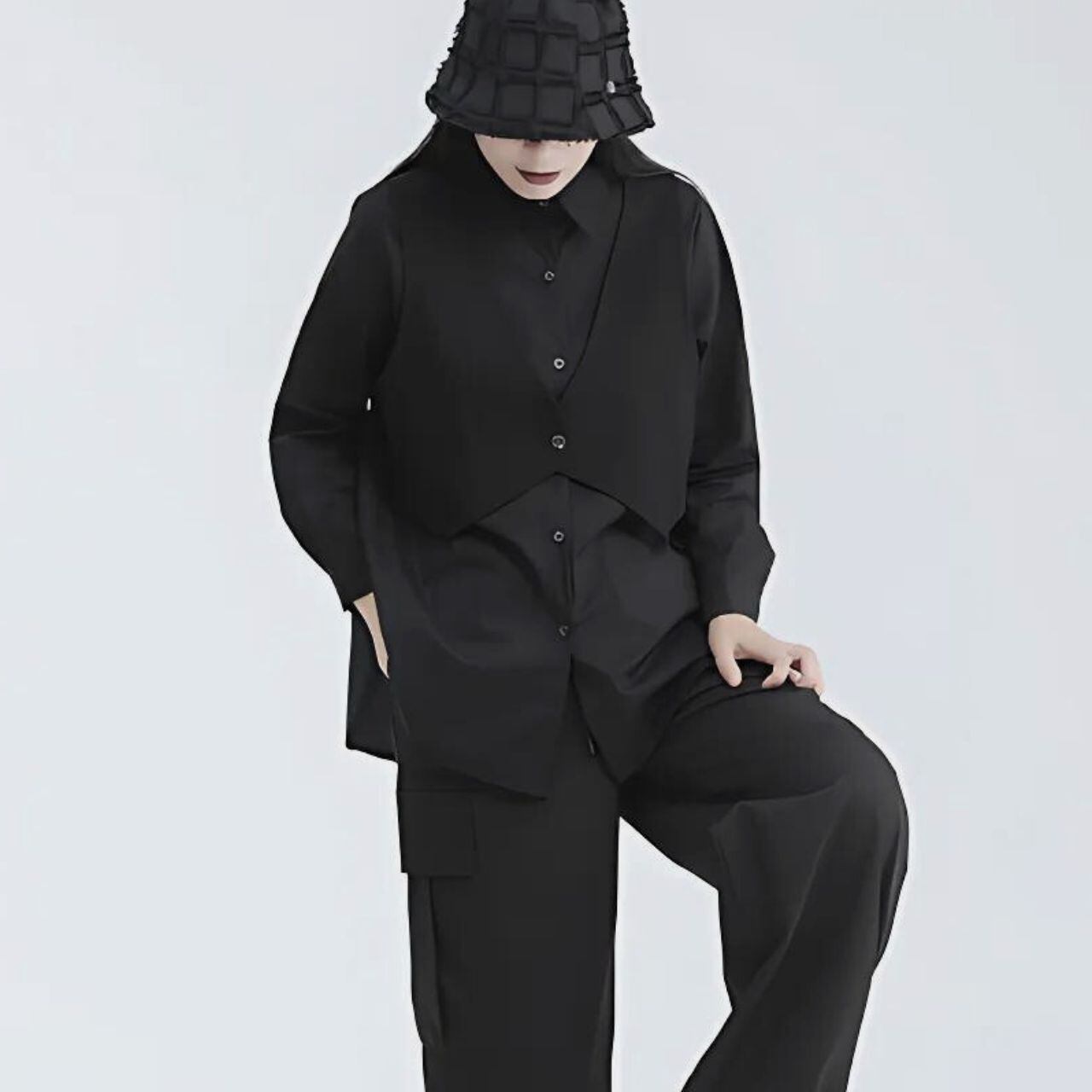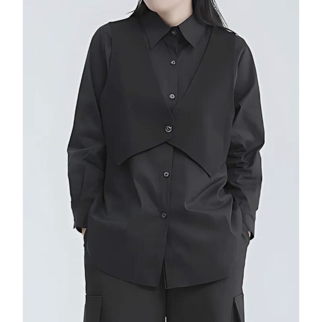 シャツにベストを重ね着したようなレイヤードスタイルのシャツ。