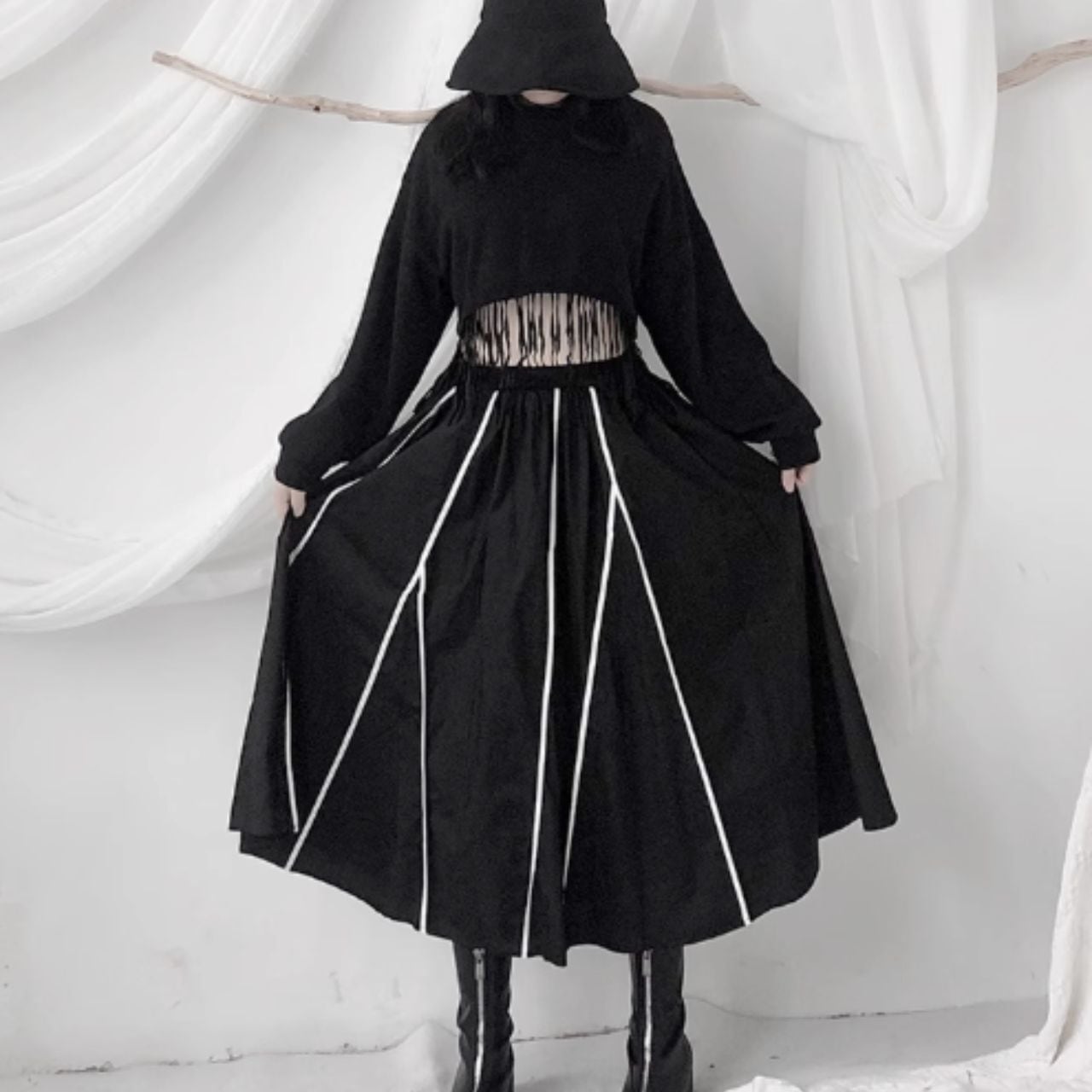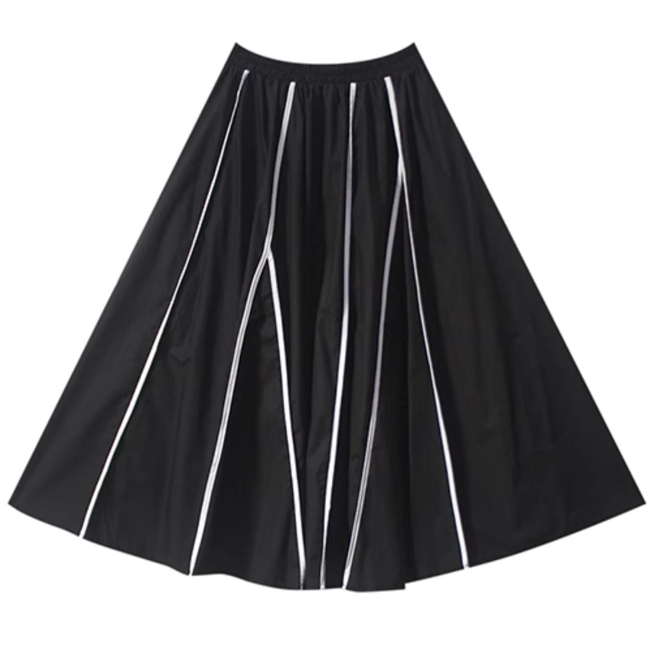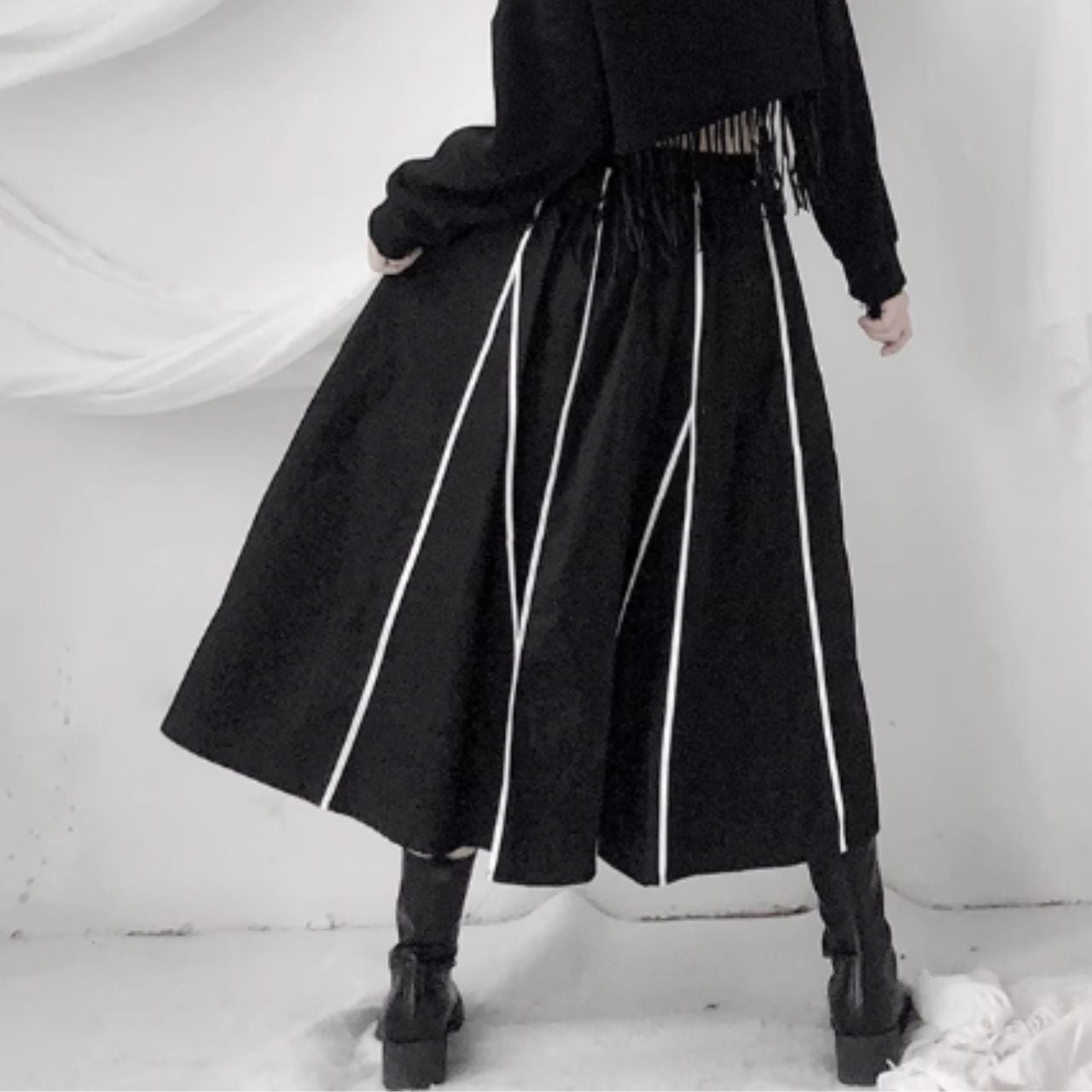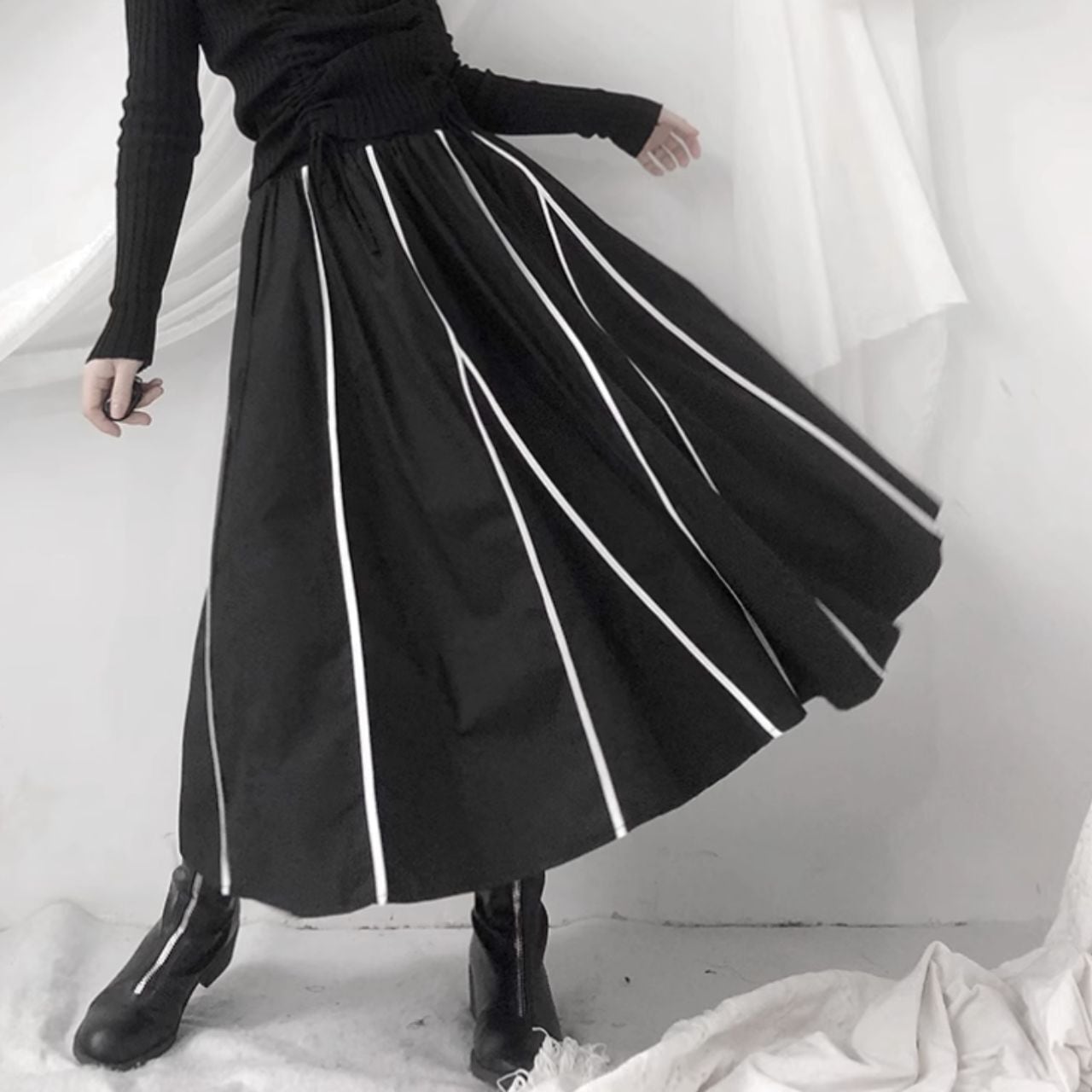 絶妙なAラインシルエットで体のラインを美しく表現し、スタイリッシュなストライプが個性的な魅力を引き立てます。