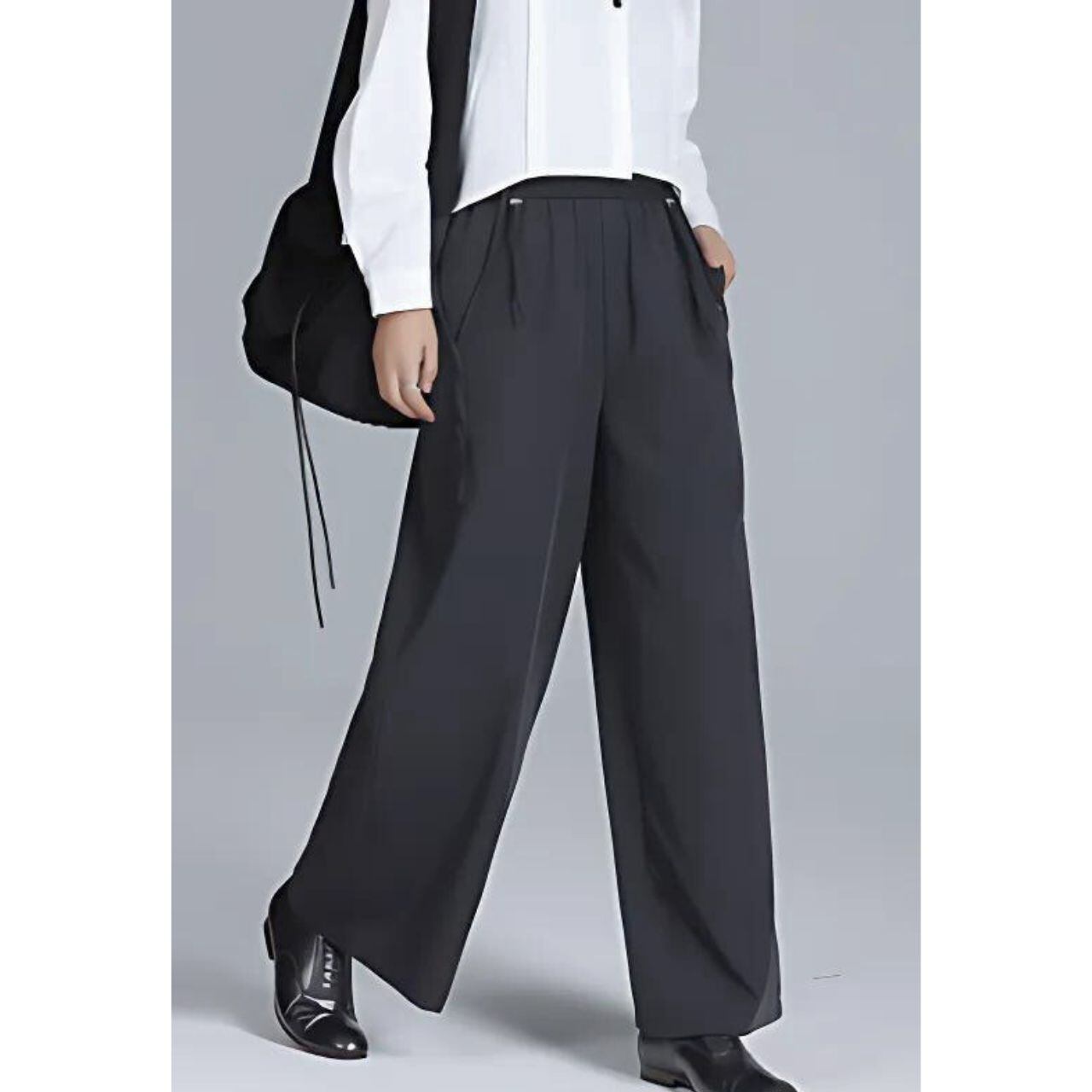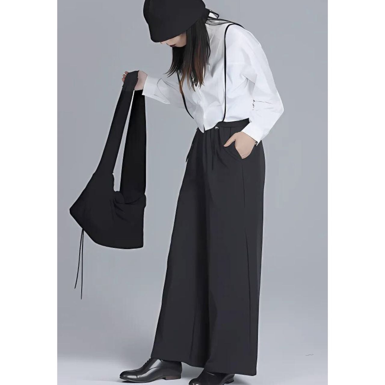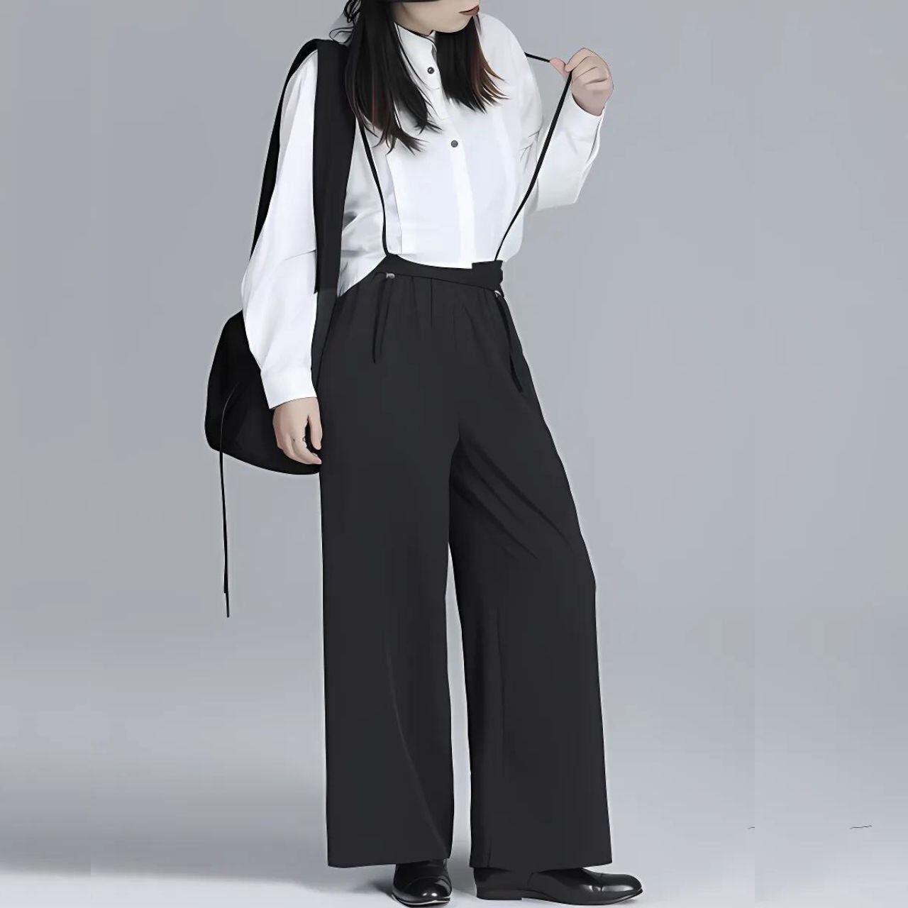 ショルダーストラップ付きのワイドパンツ。
