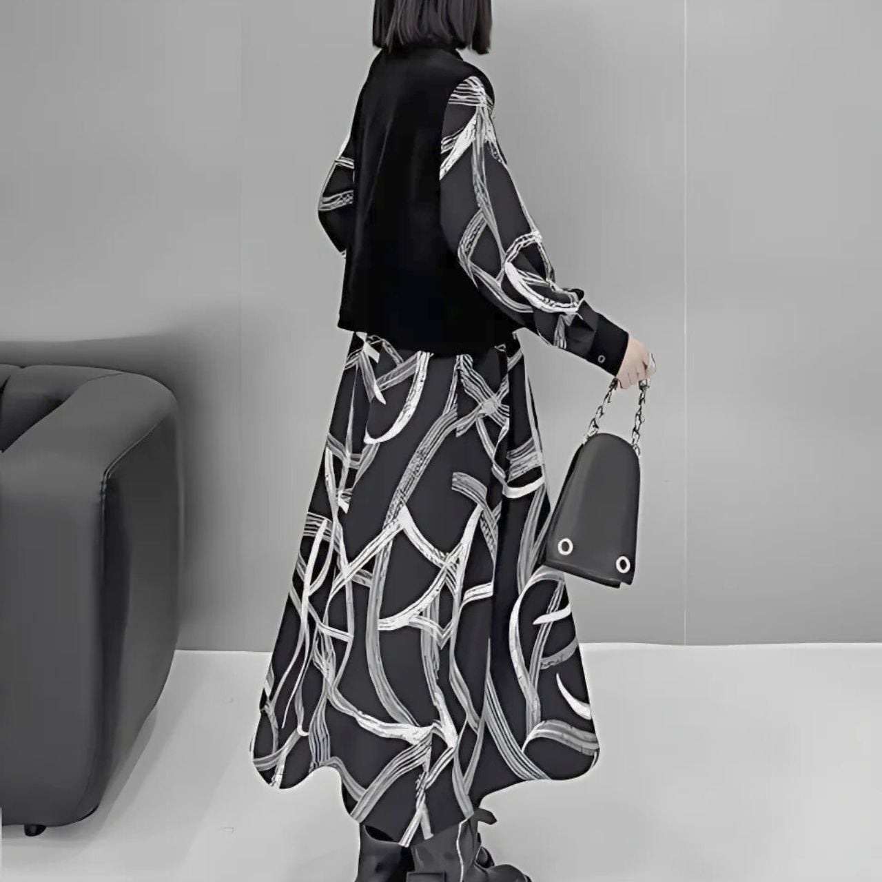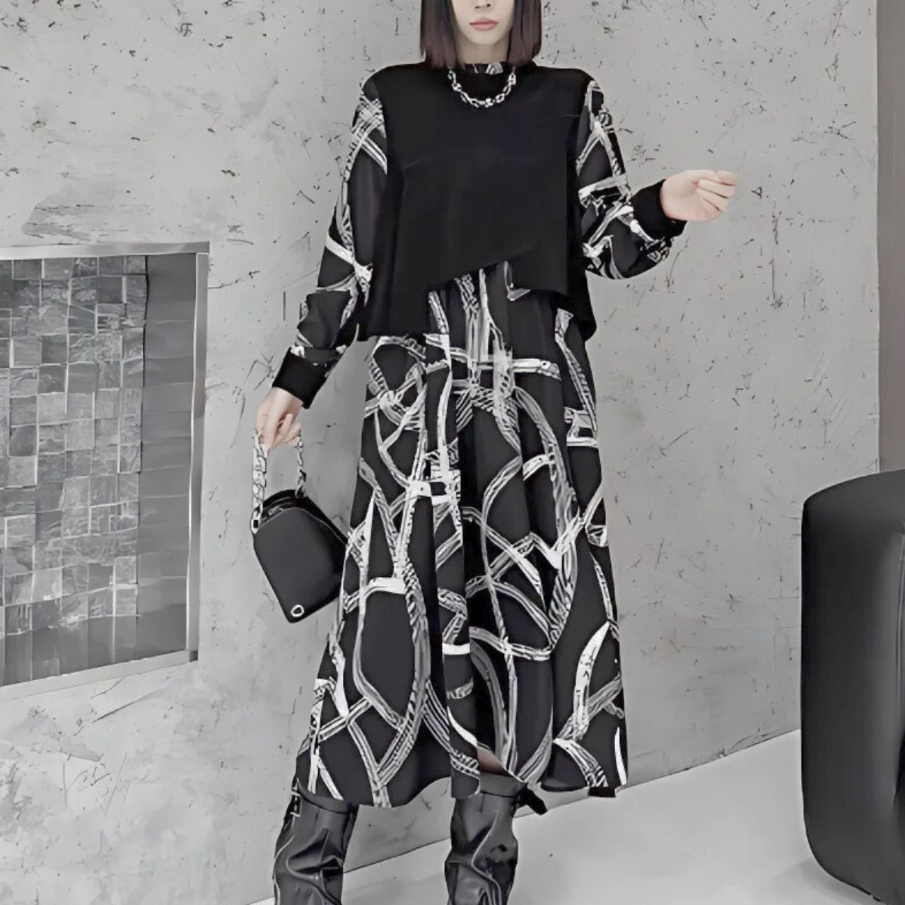 黒地に大きく描かれた白いラインが存在感を放つ一着です。
